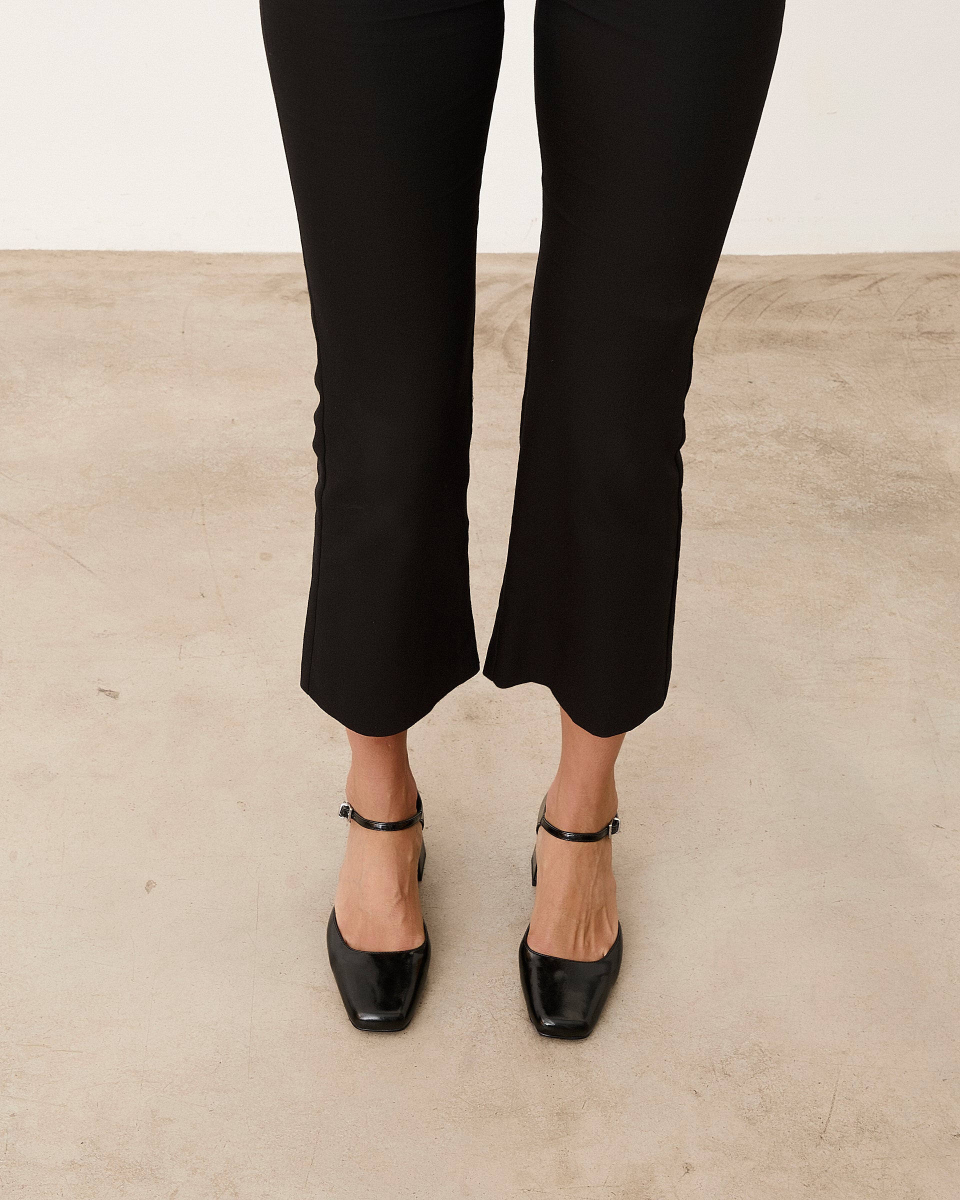 Closed high heel shoe with square toe in black. Heel counter with ankle strap. Square heel.