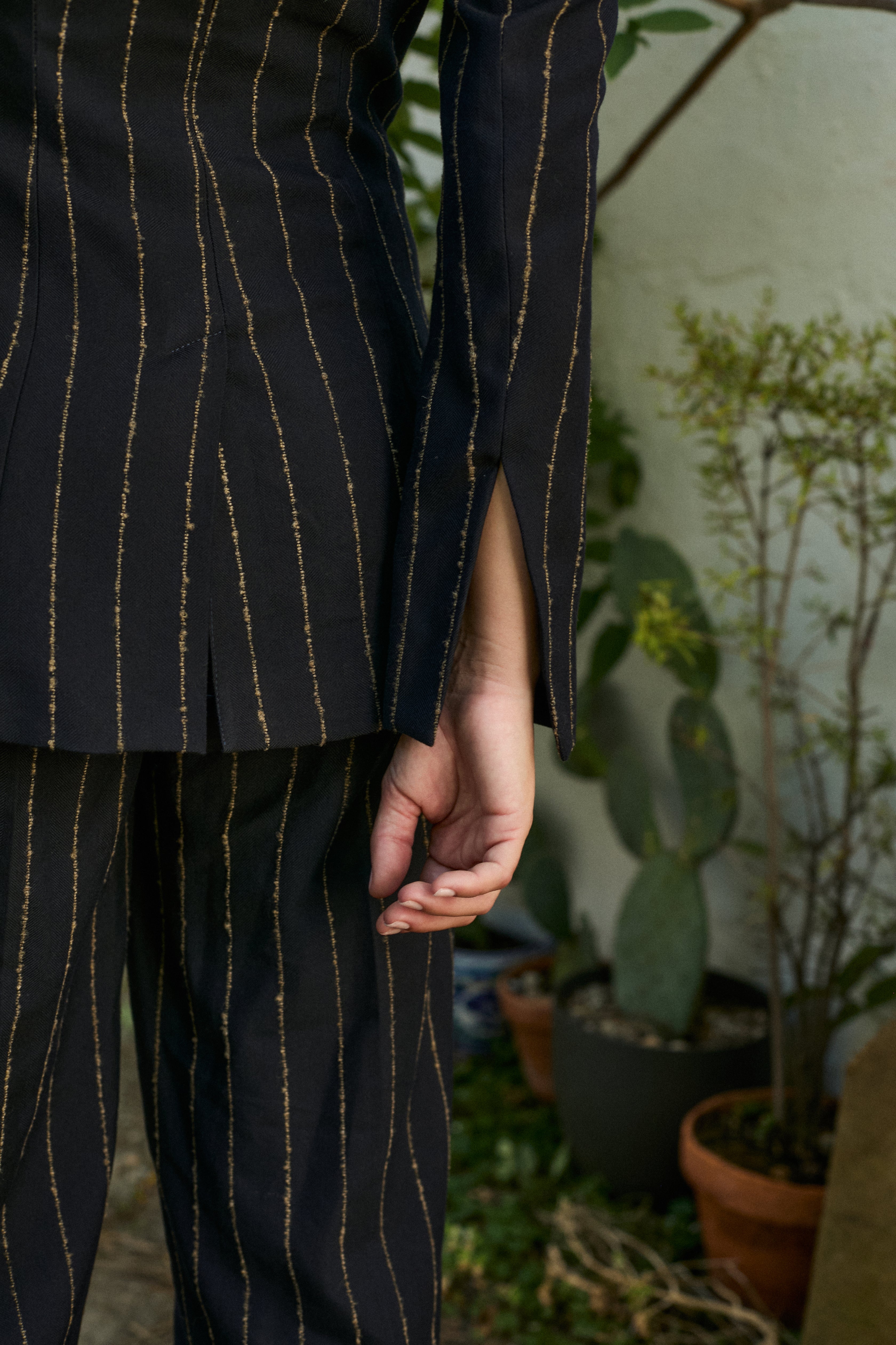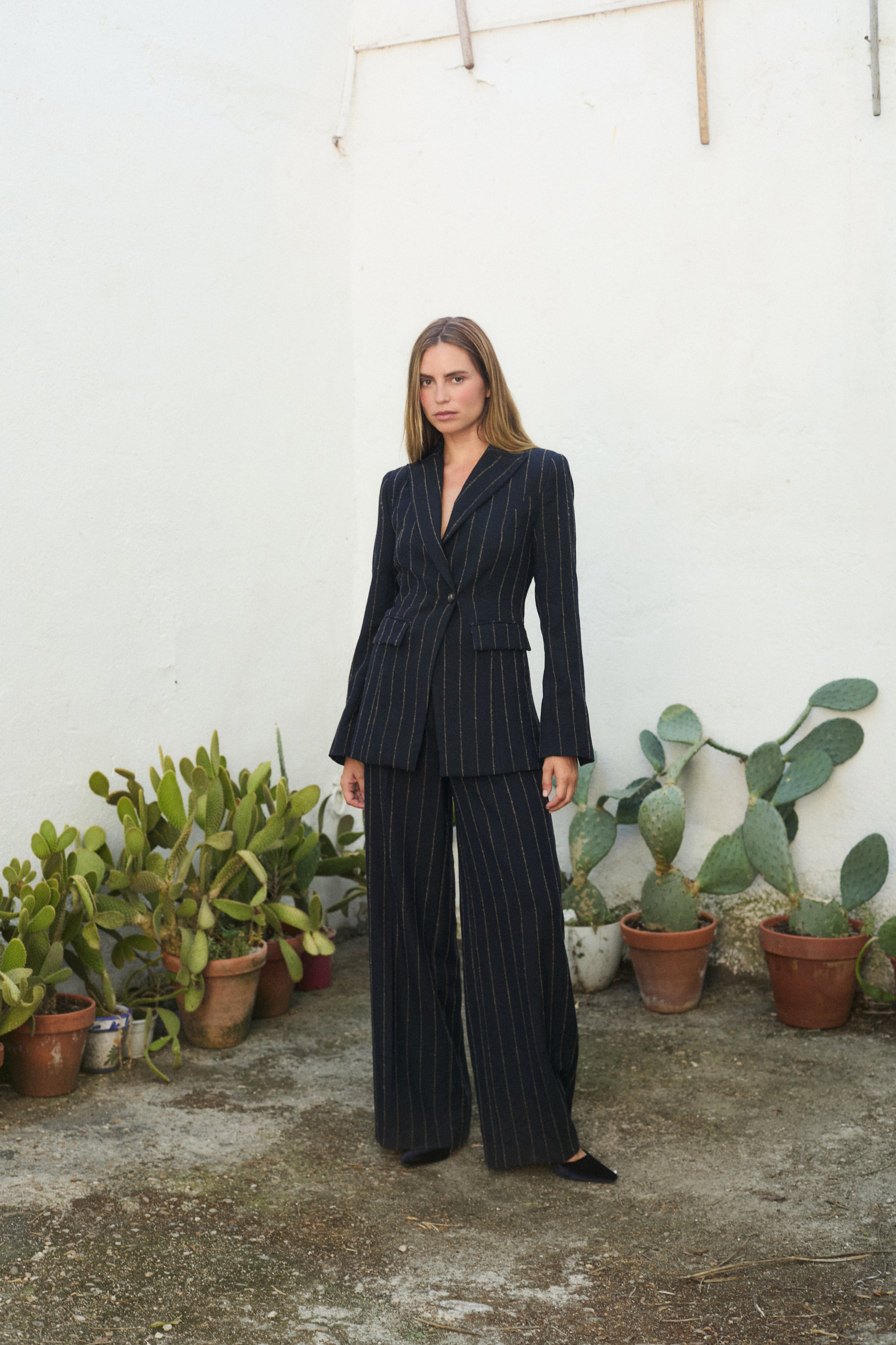 Fitted blazer with shoulder pads in navy blue with embroidered detail in toasted tone. Cross closure with button.
