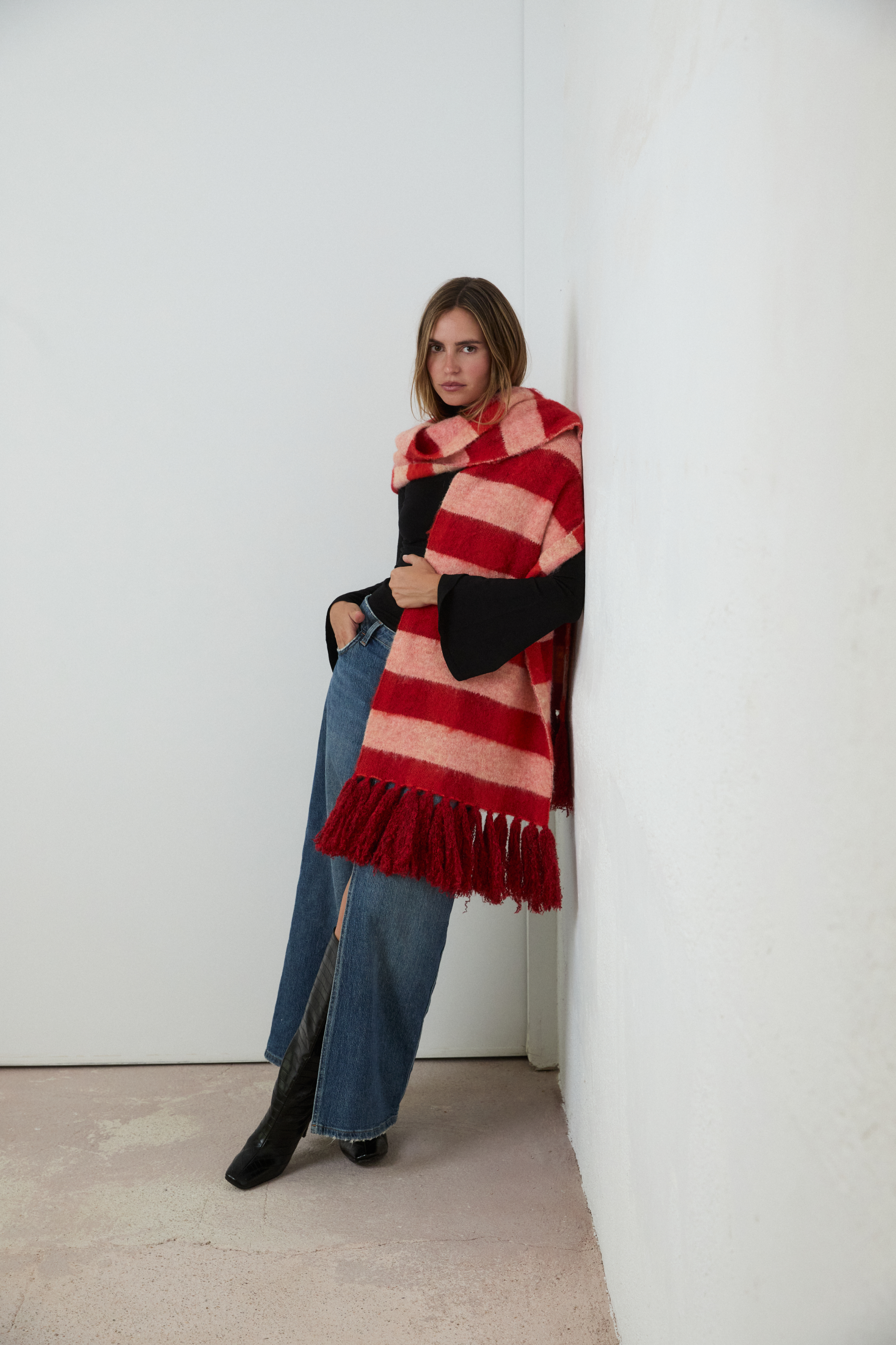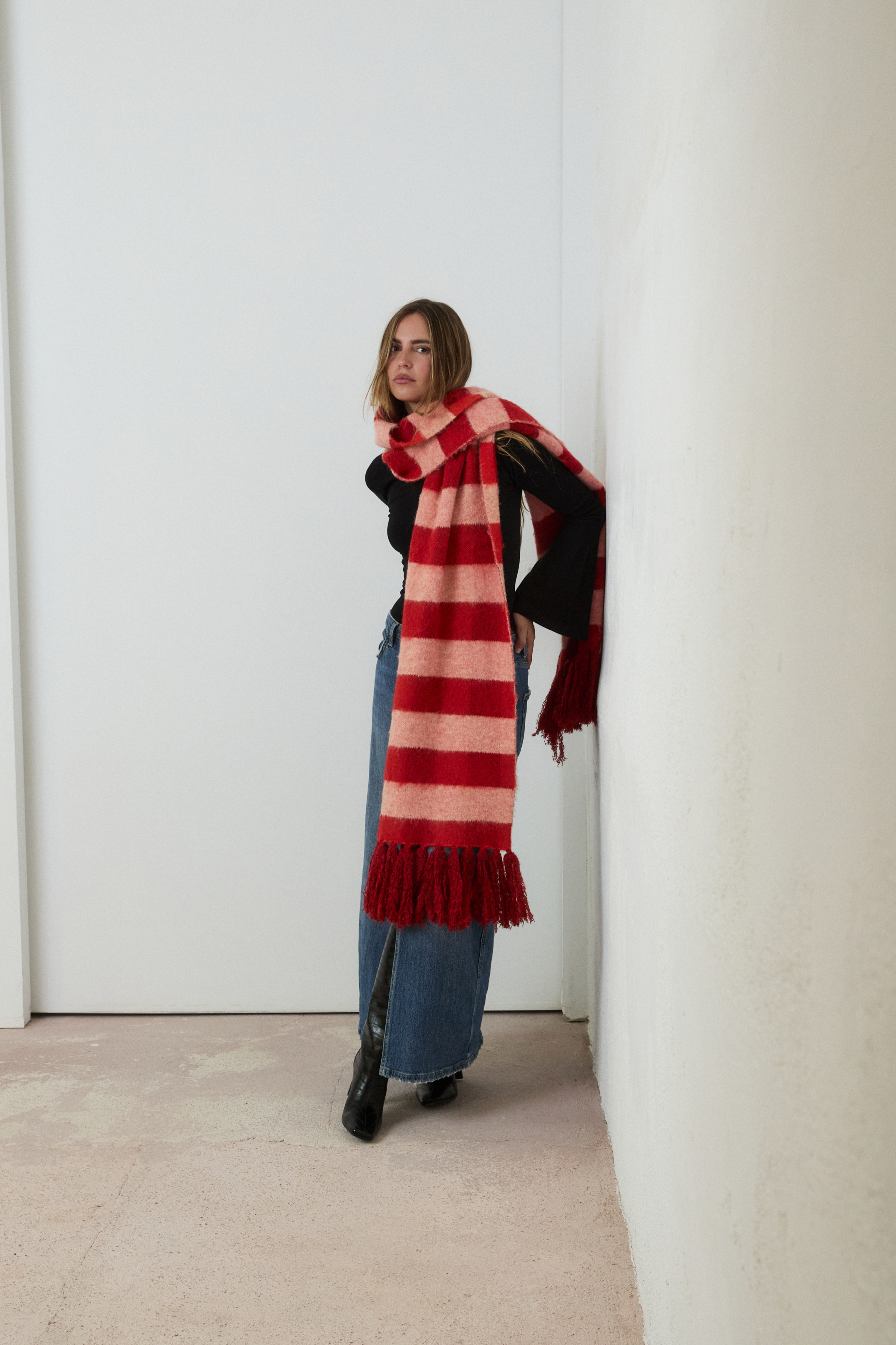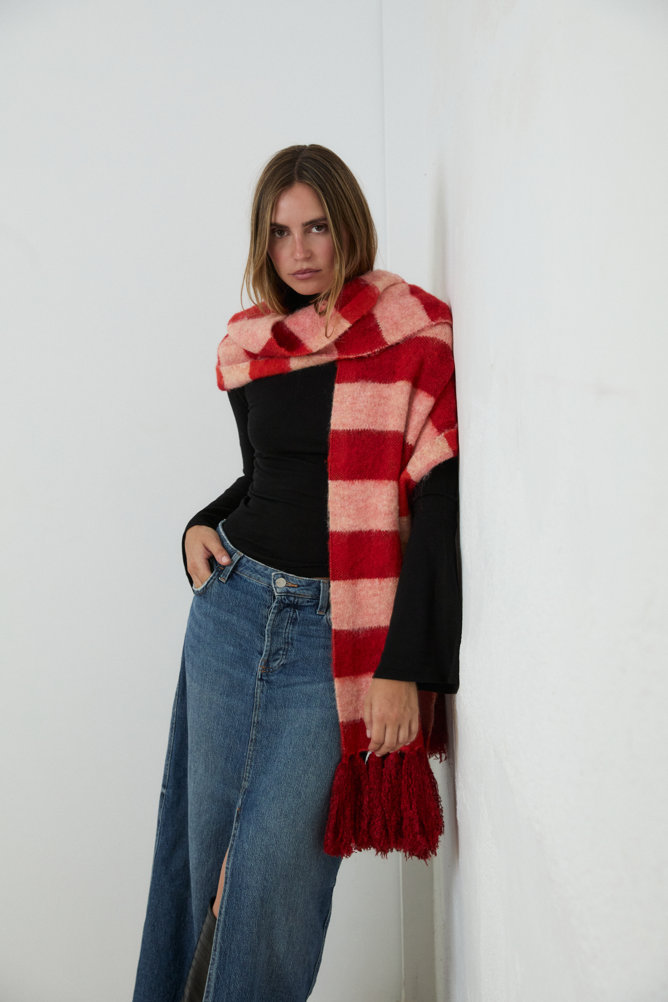 Maxi checkered scarf in red tones. Fringe detail at the ends.