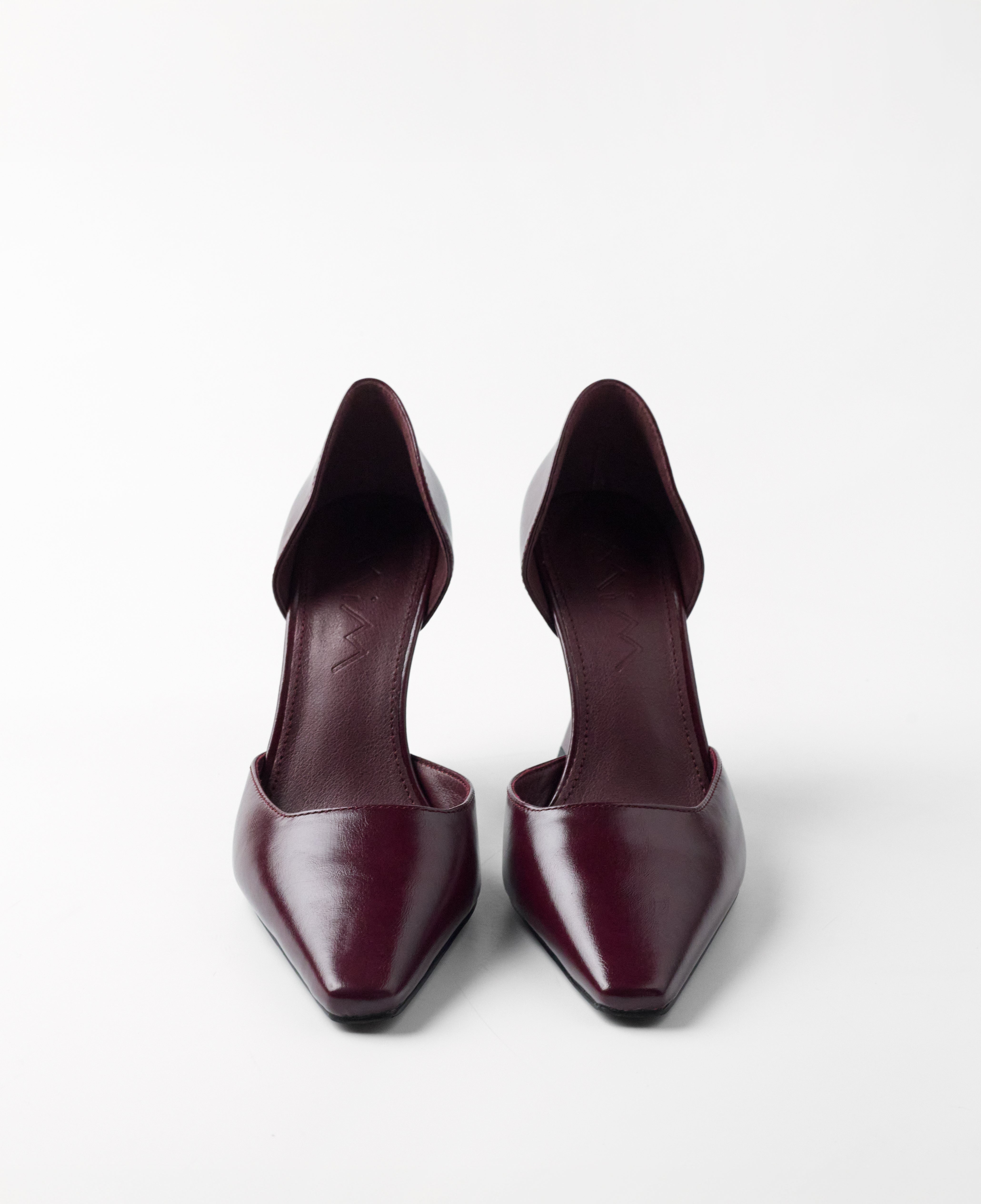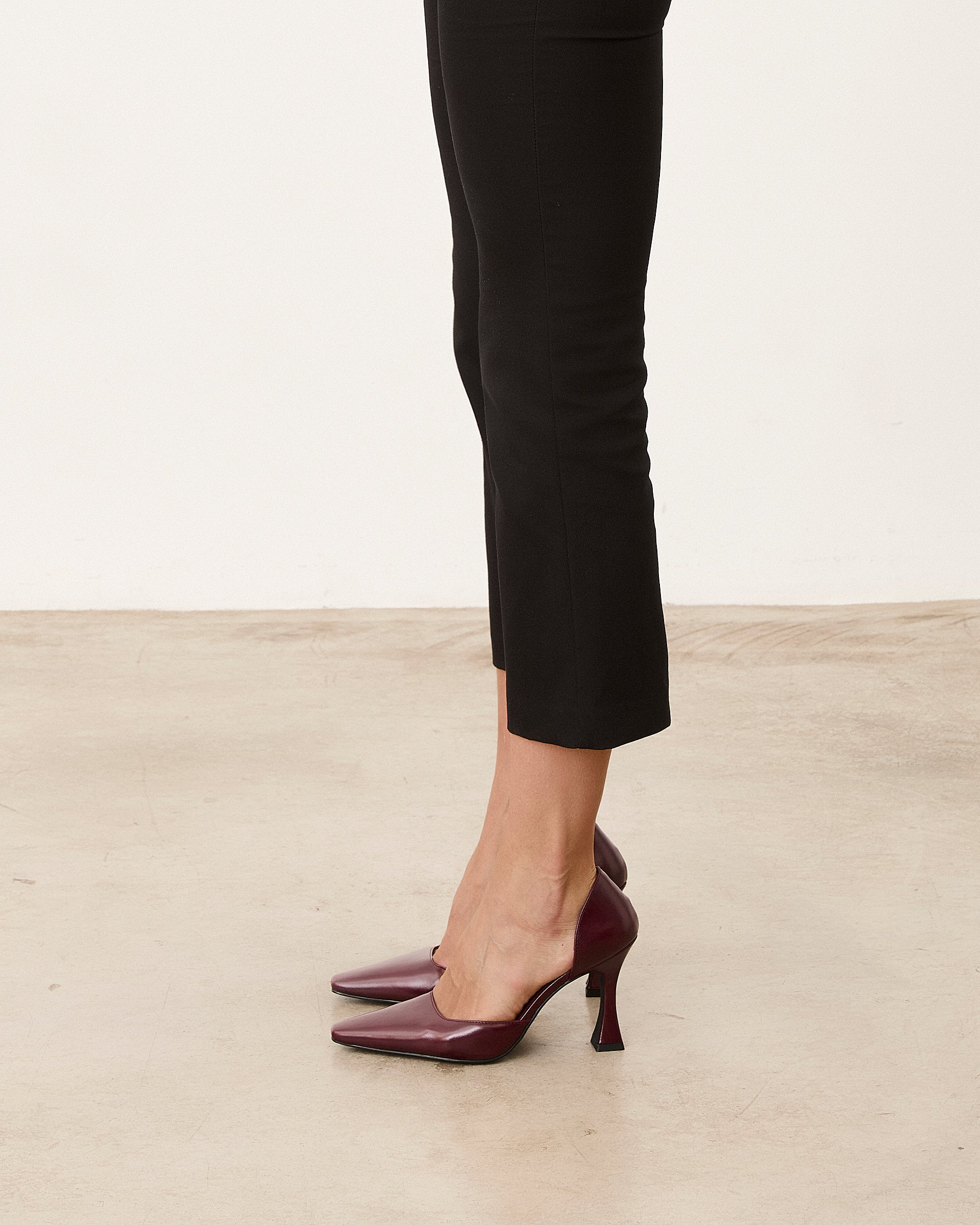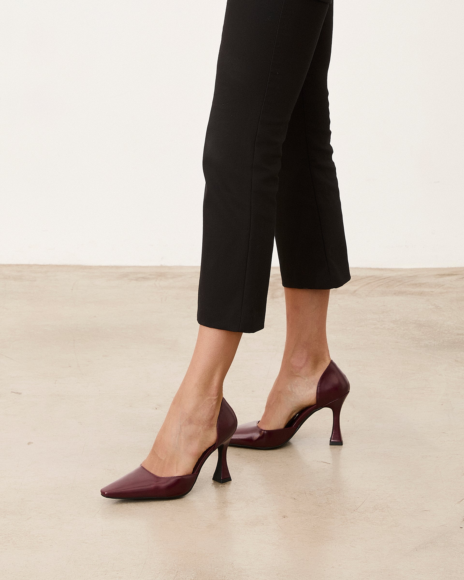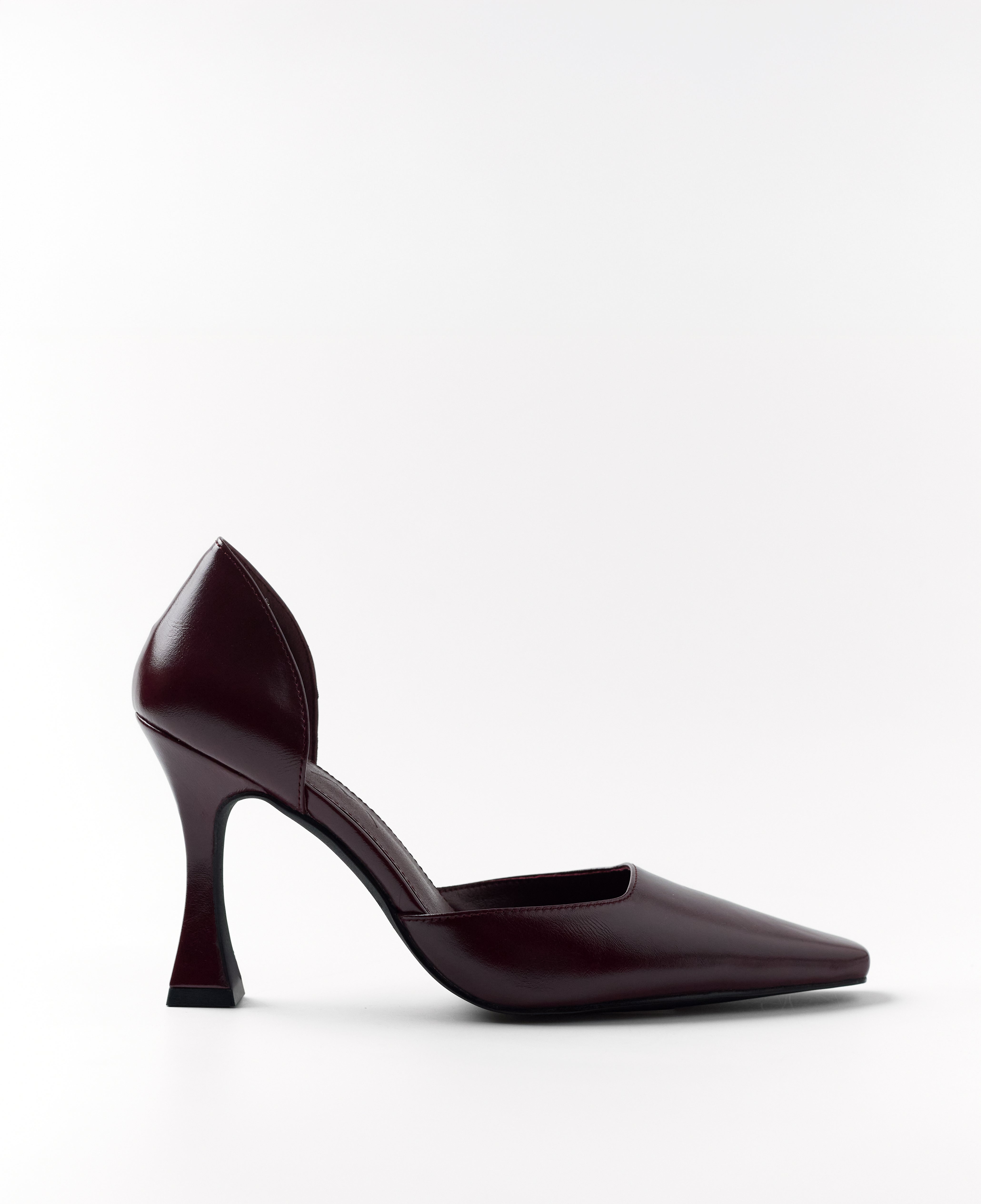 Closed pointed high heel shoe with burgundy stiletto heel. Closed back.