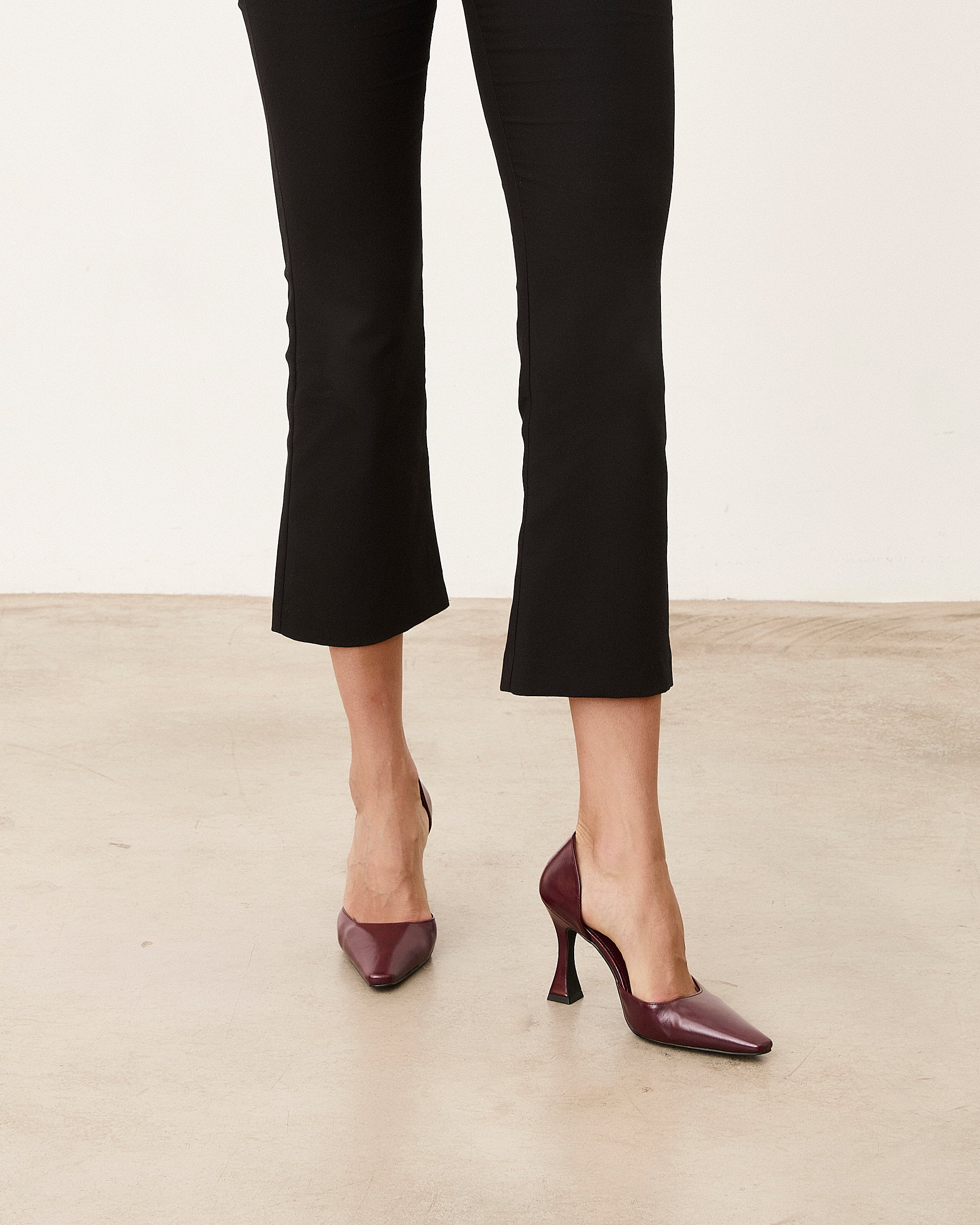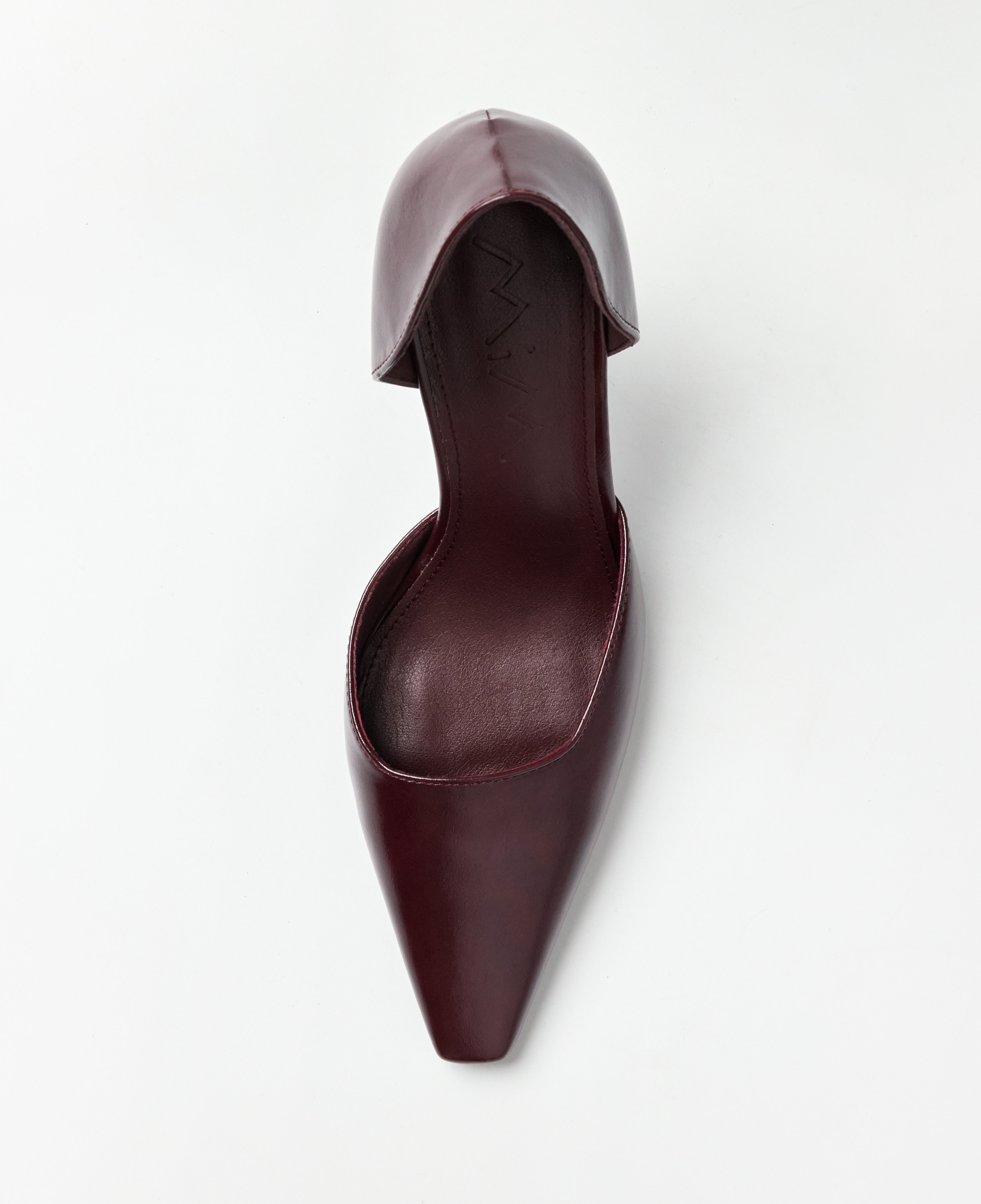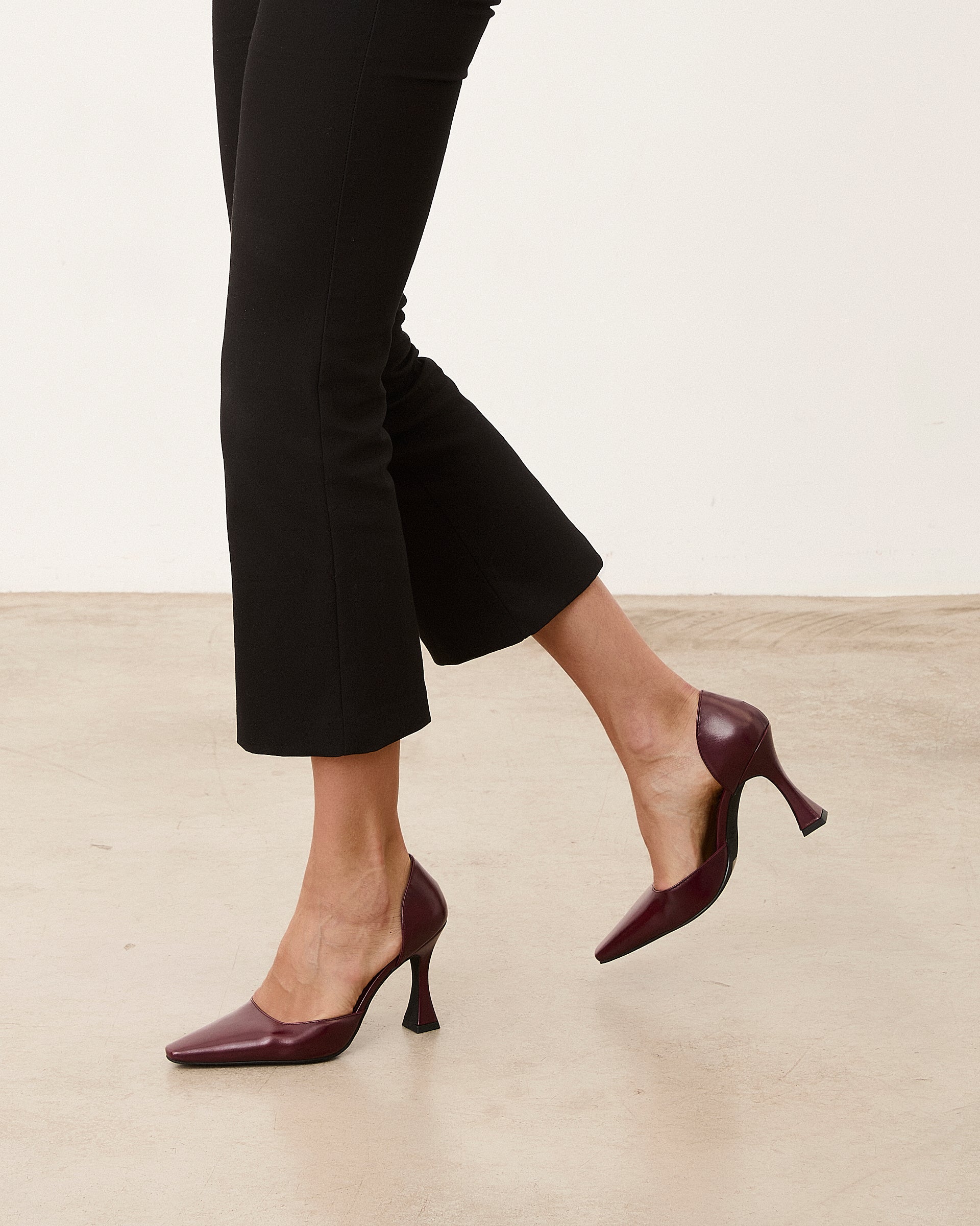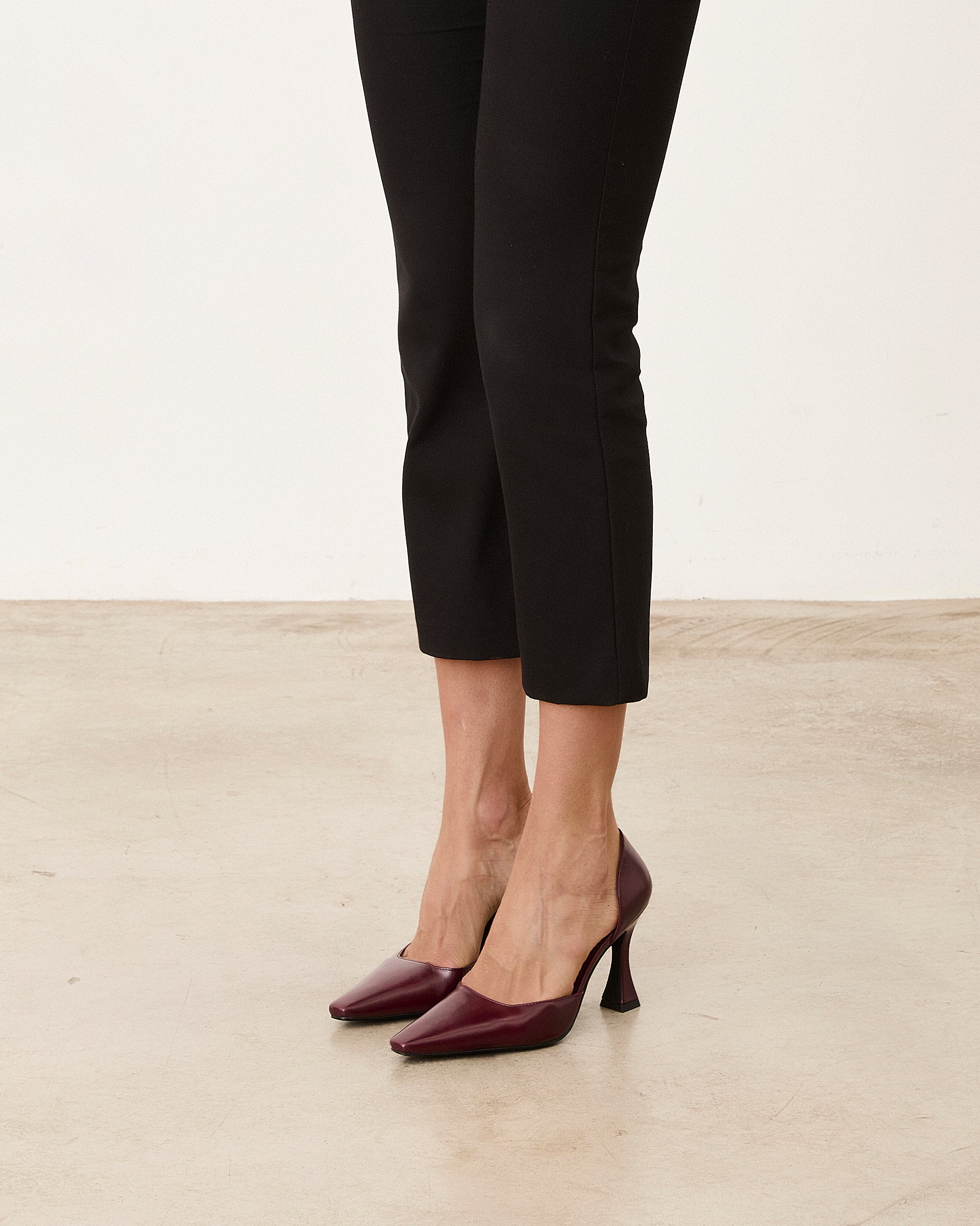 Closed pointed high heel shoe with burgundy stiletto heel. Closed back.