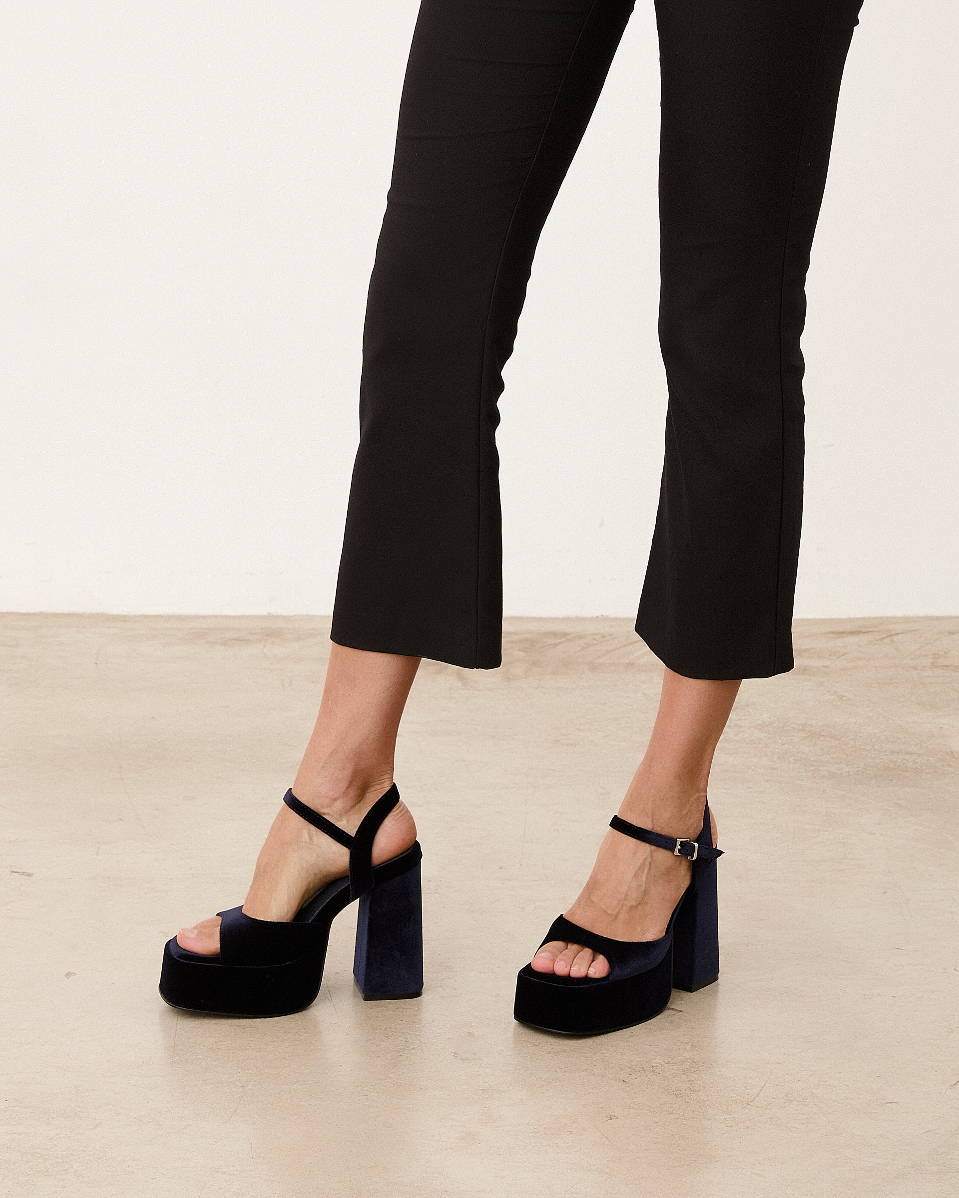 High-heeled sandal with XL platform in navy blue color. Wide strap at the front and ankle strap for support. Rectangular heel.