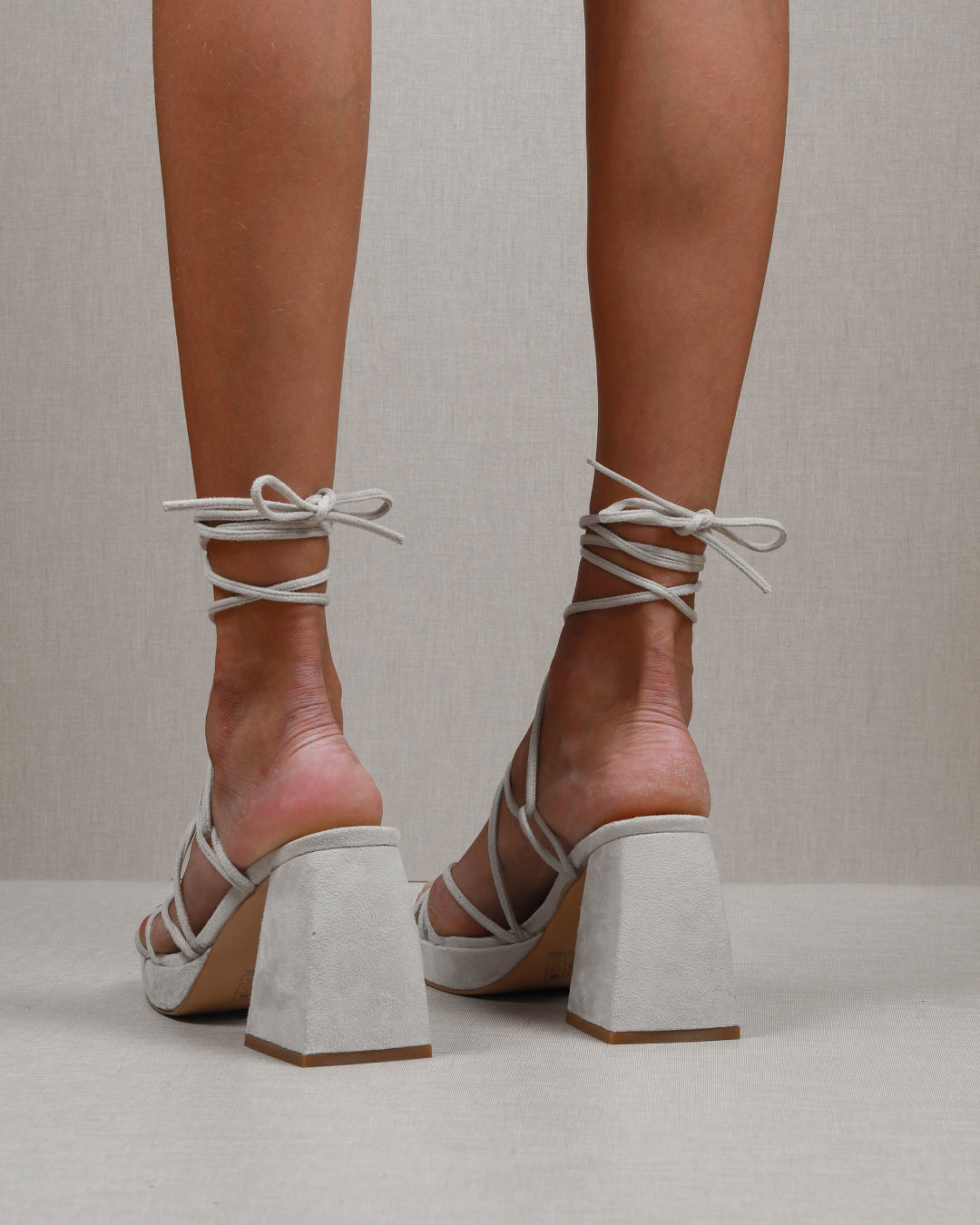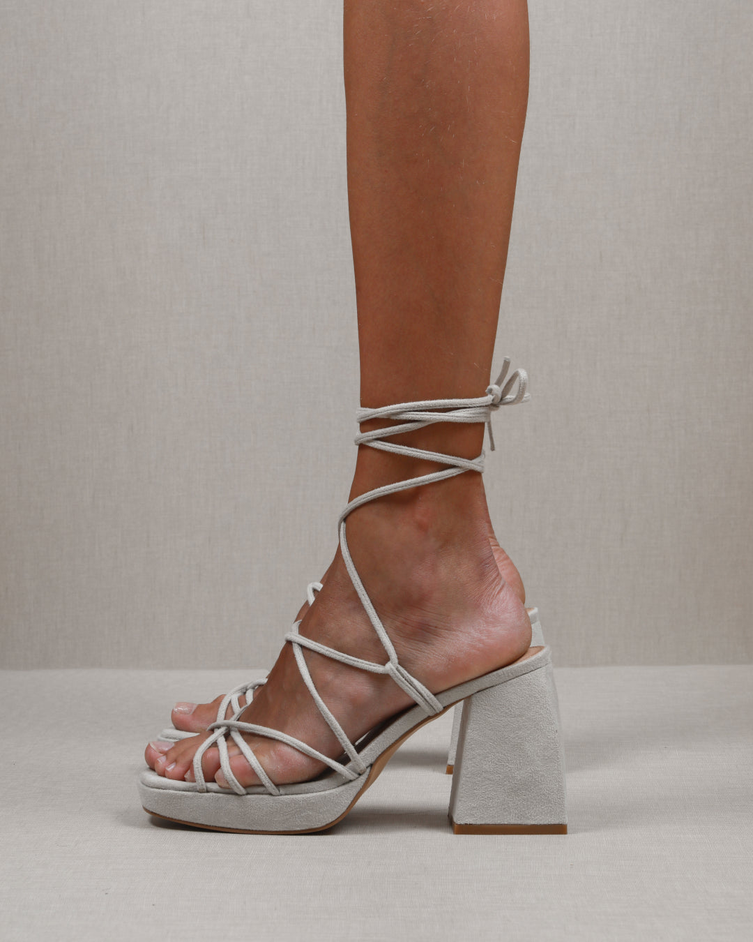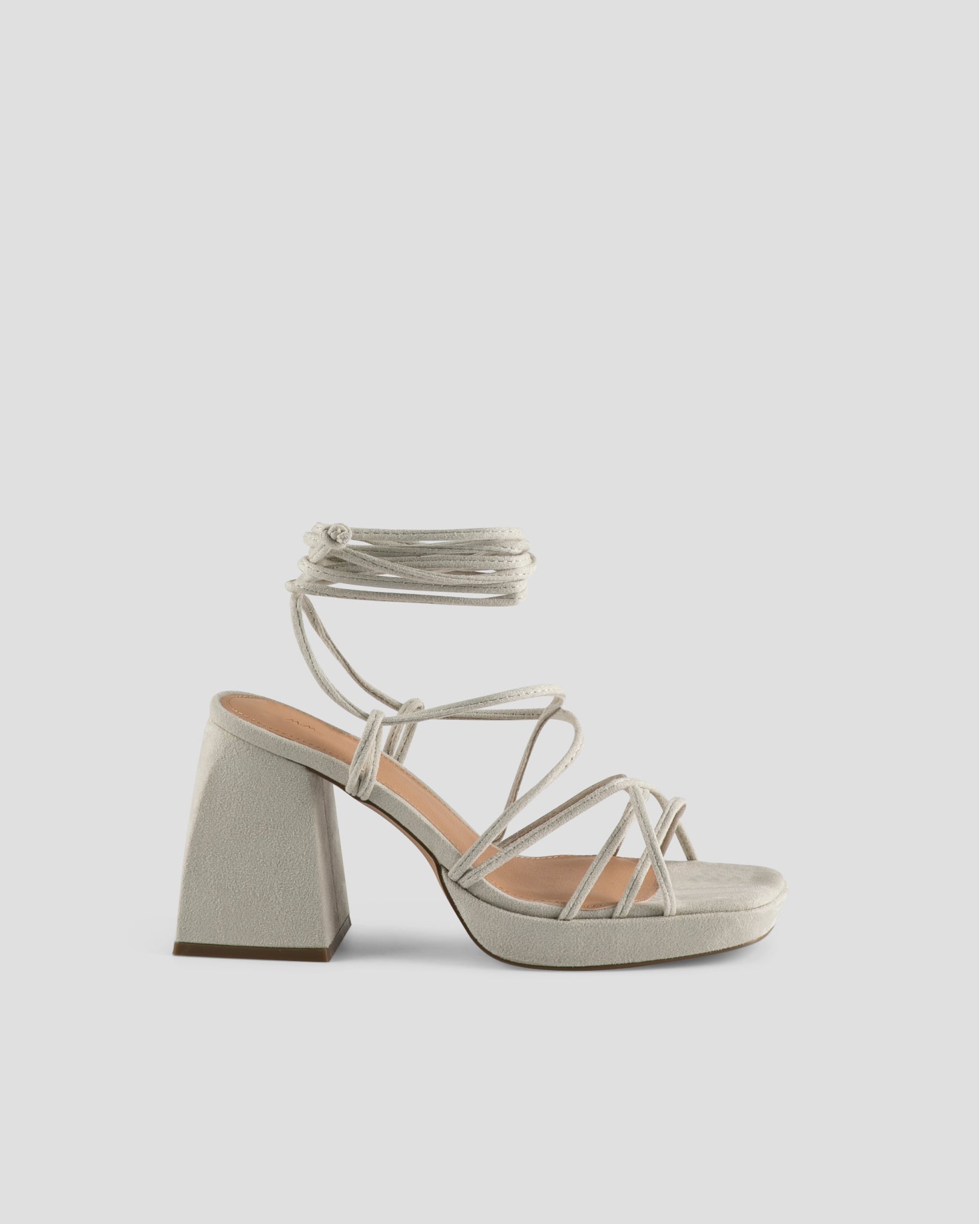 Heeled sandal in ecru vegan suede with several thin straps, to be tied at the ankle.
