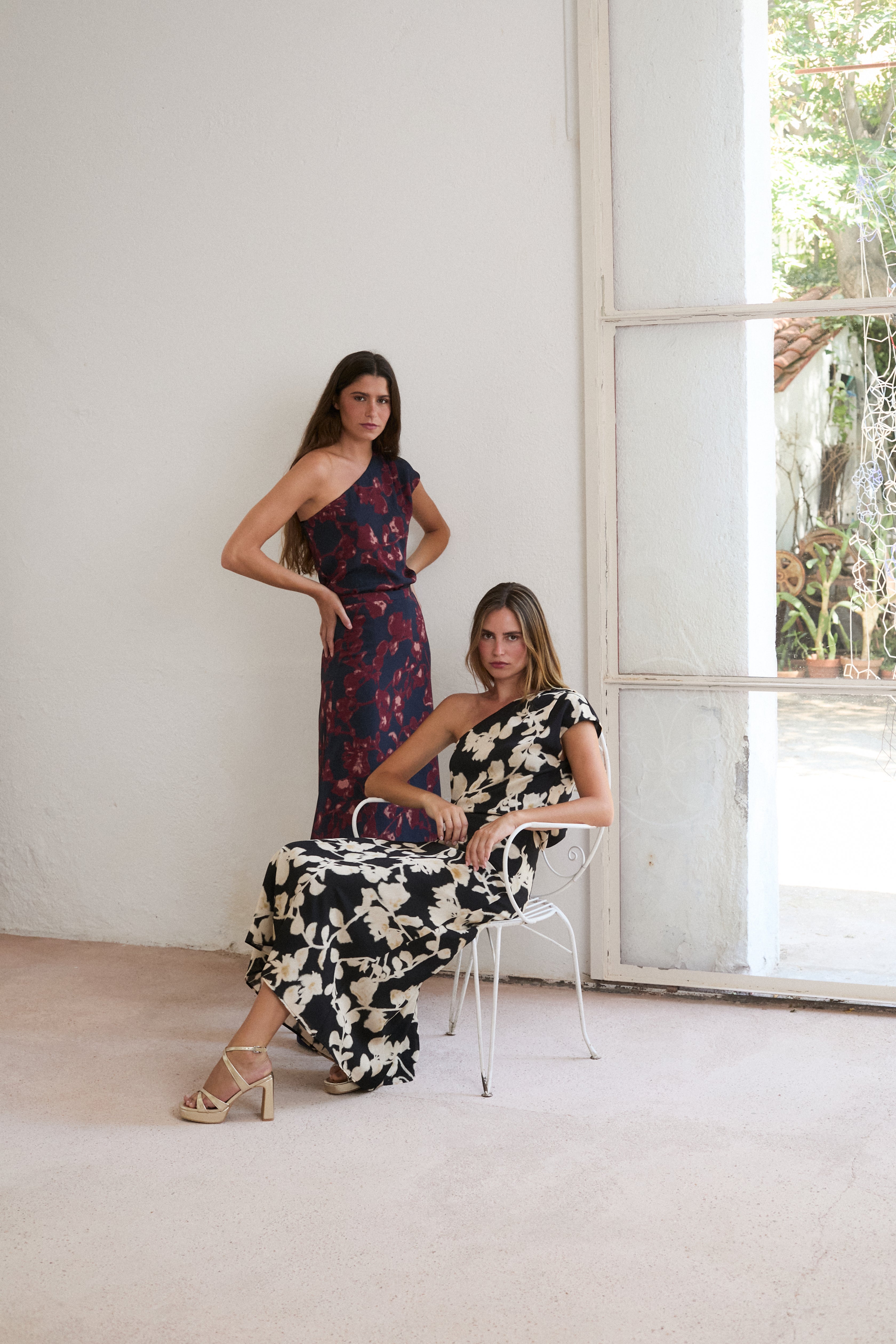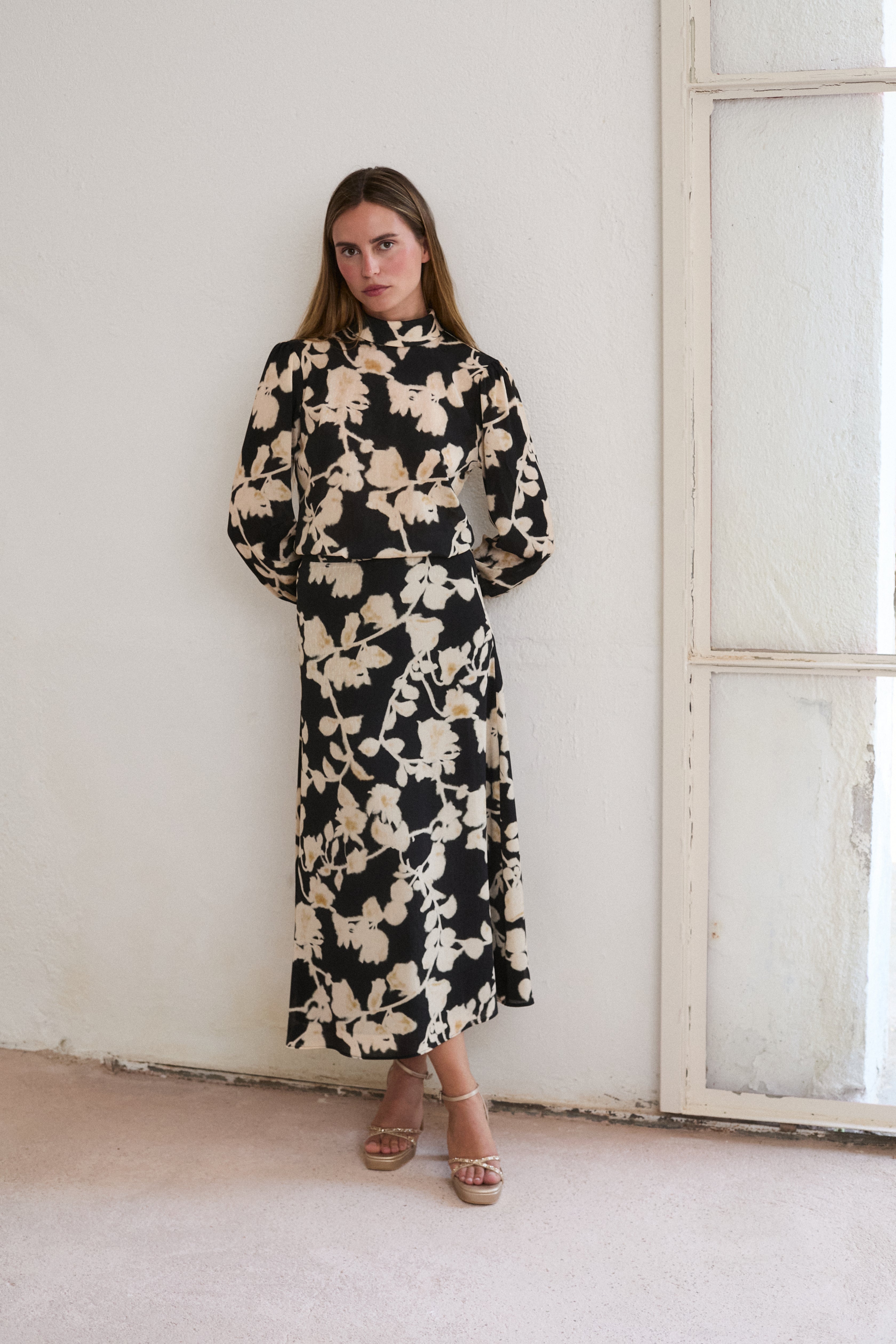 Flowy midi skirt with an A-line cut. Mid-rise with side zipper. Floral print motifs in off white and black tones. Combined inner lining.