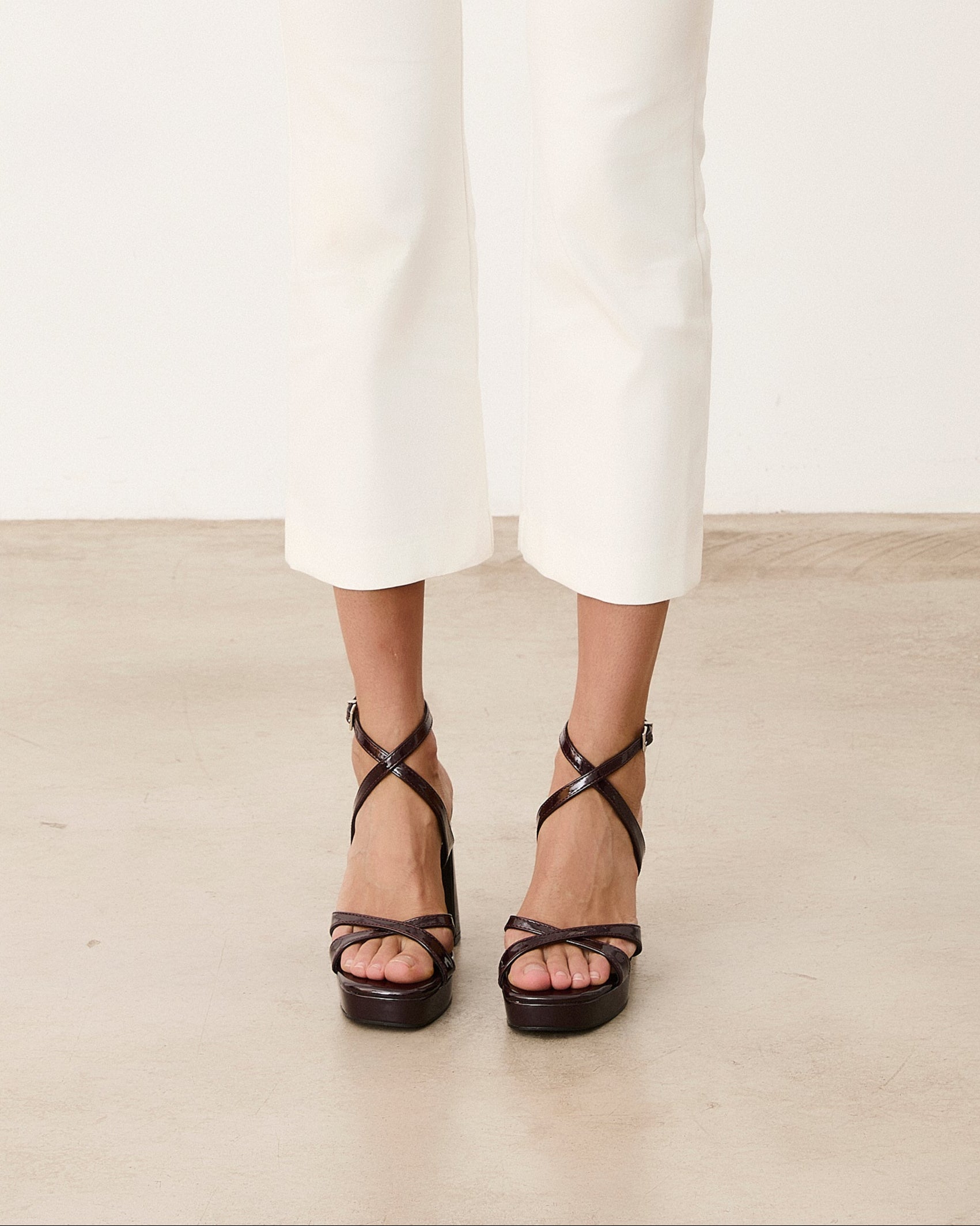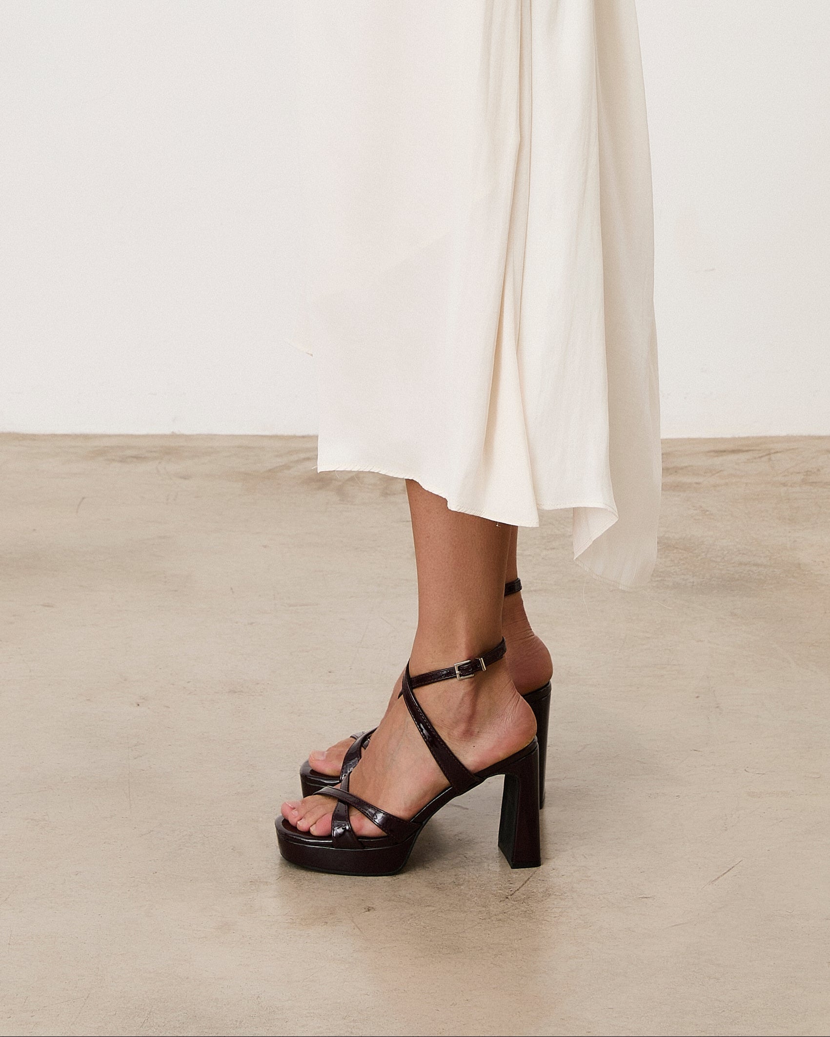 Heeled sandal with platform in burgundy color. Two crossed straps on the front and ankle strap closure with front crossing. Rectangular heel.