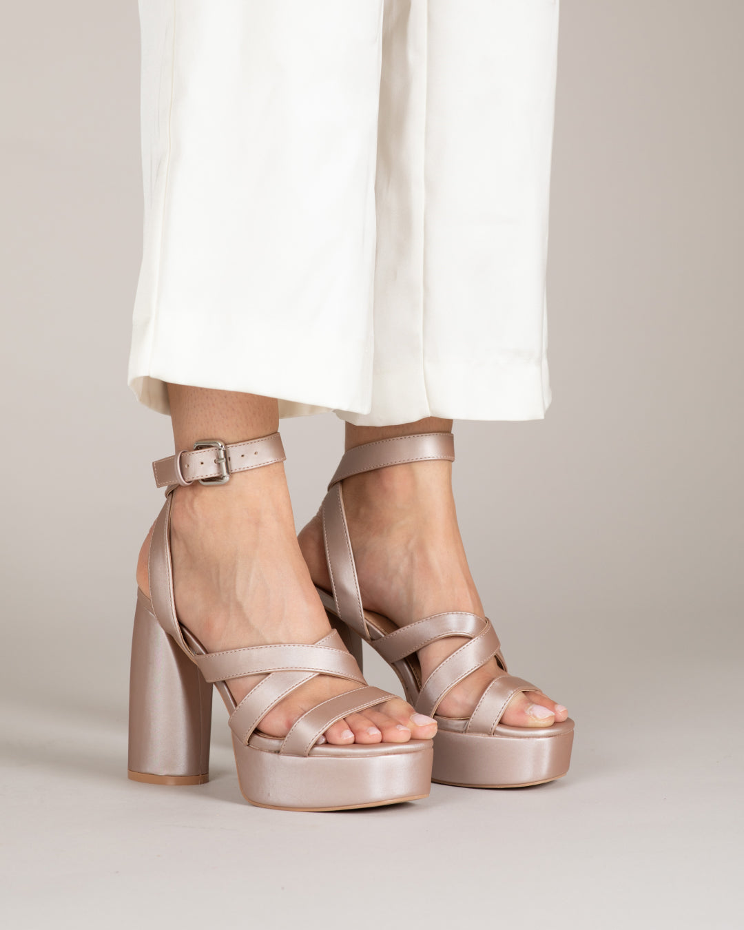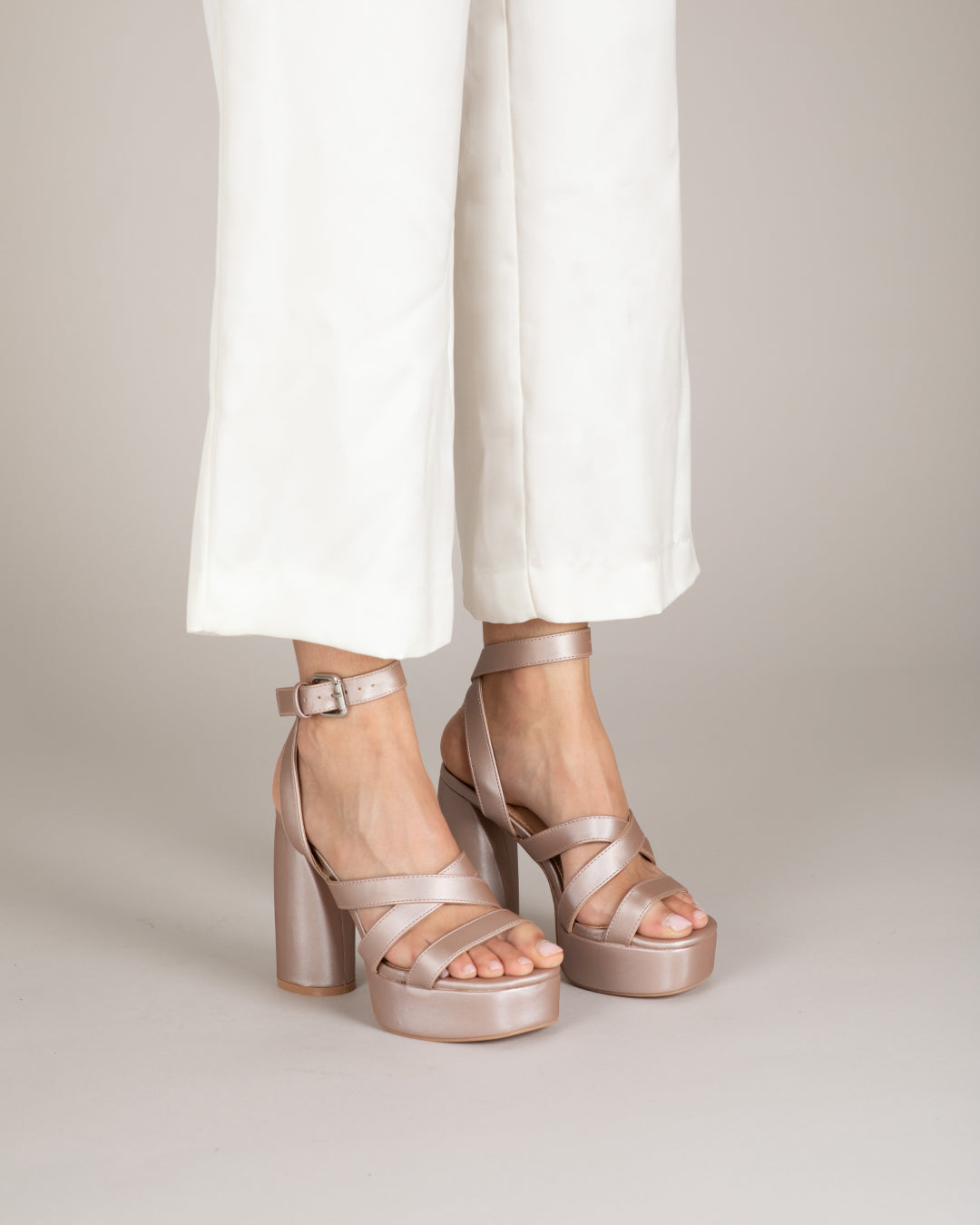 Lilac platform heeled sandal. With crossed straps in the front and tied at the ankle.