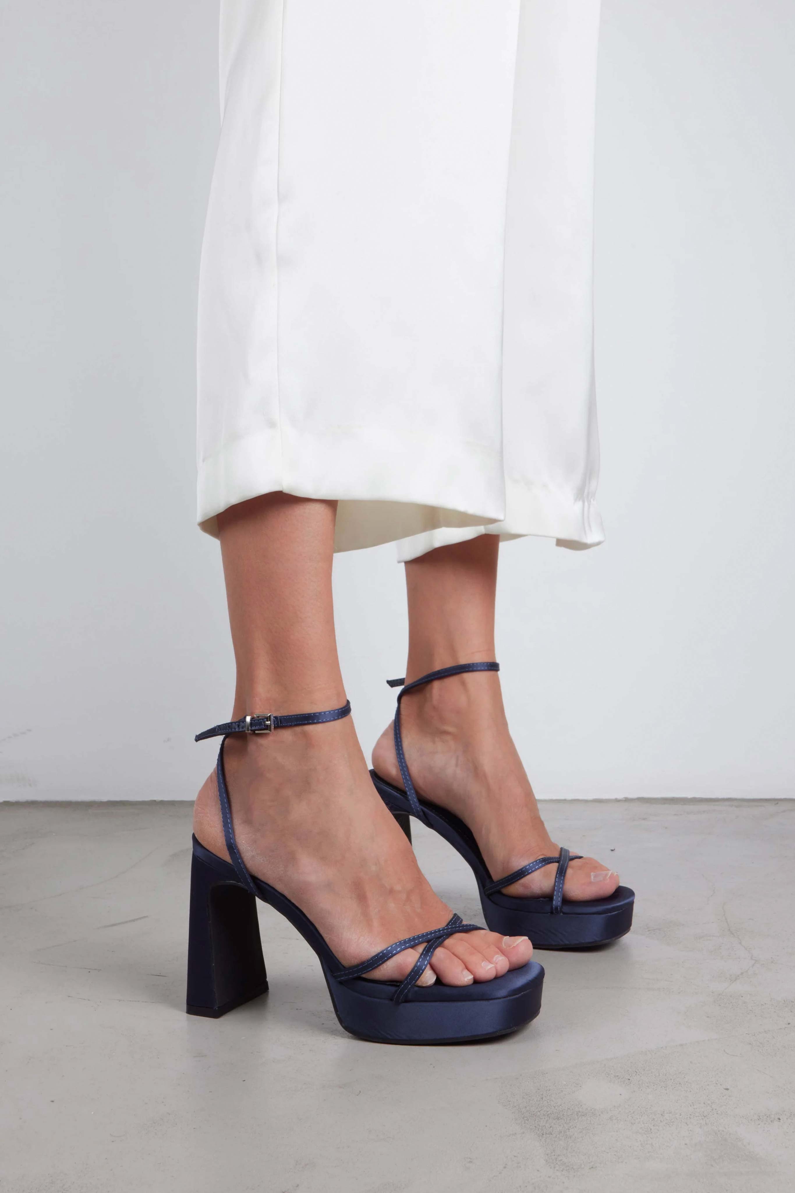 Navy blue heeled sandal with platform. Open front with straps and rectangular heel. Ankle strap closure with metal buckle.