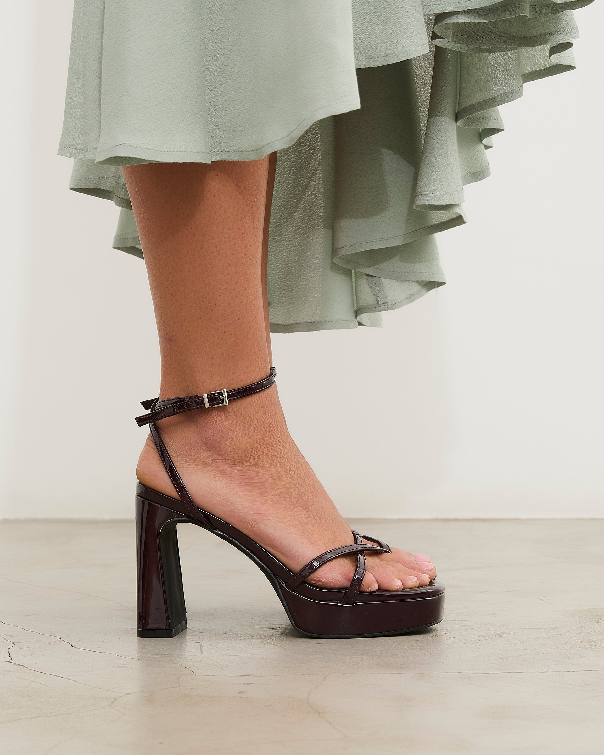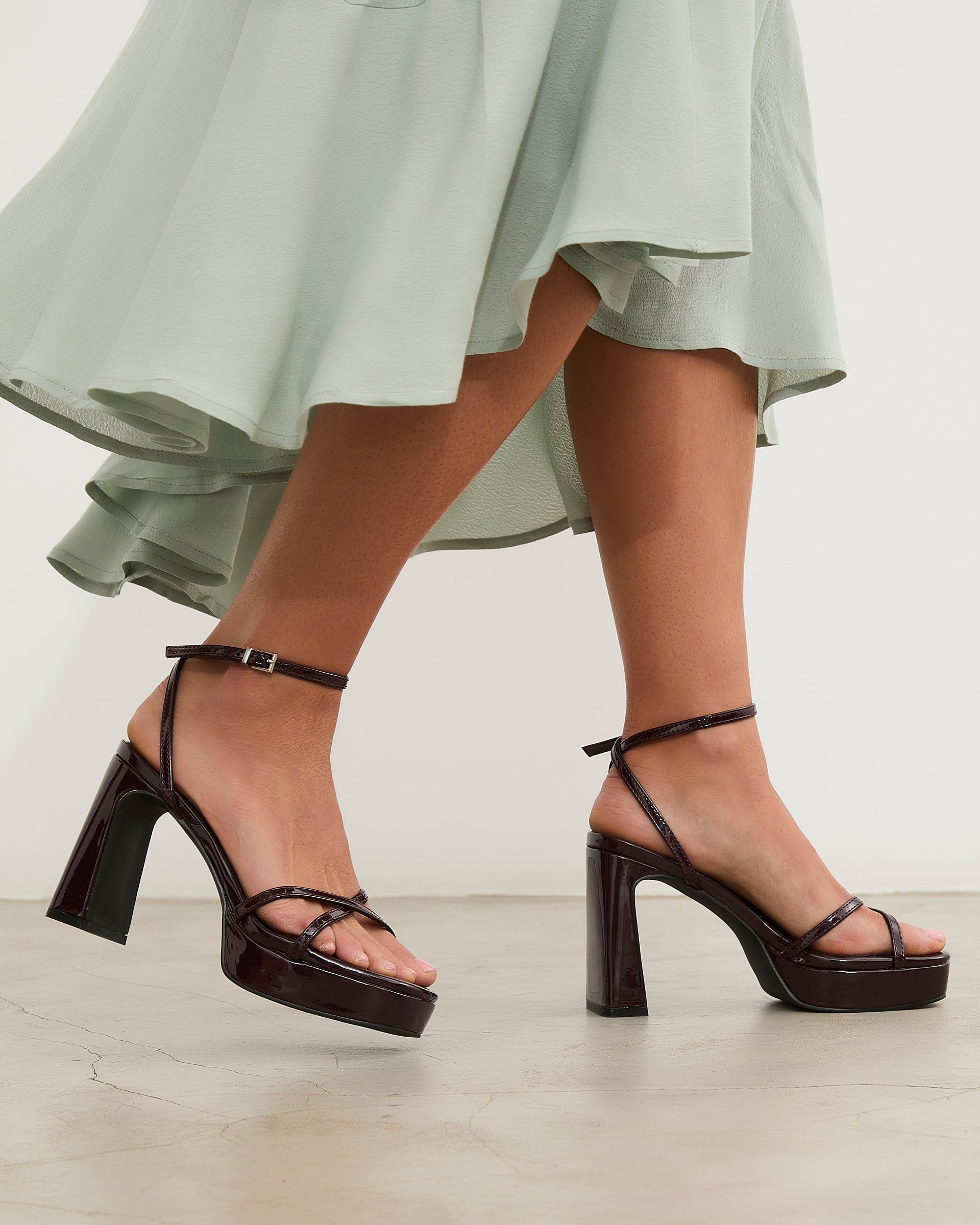 Burgundy patent leather high-heeled sandal with platform. Open front with straps and rectangular heel. Ankle strap closure with metal buckle.