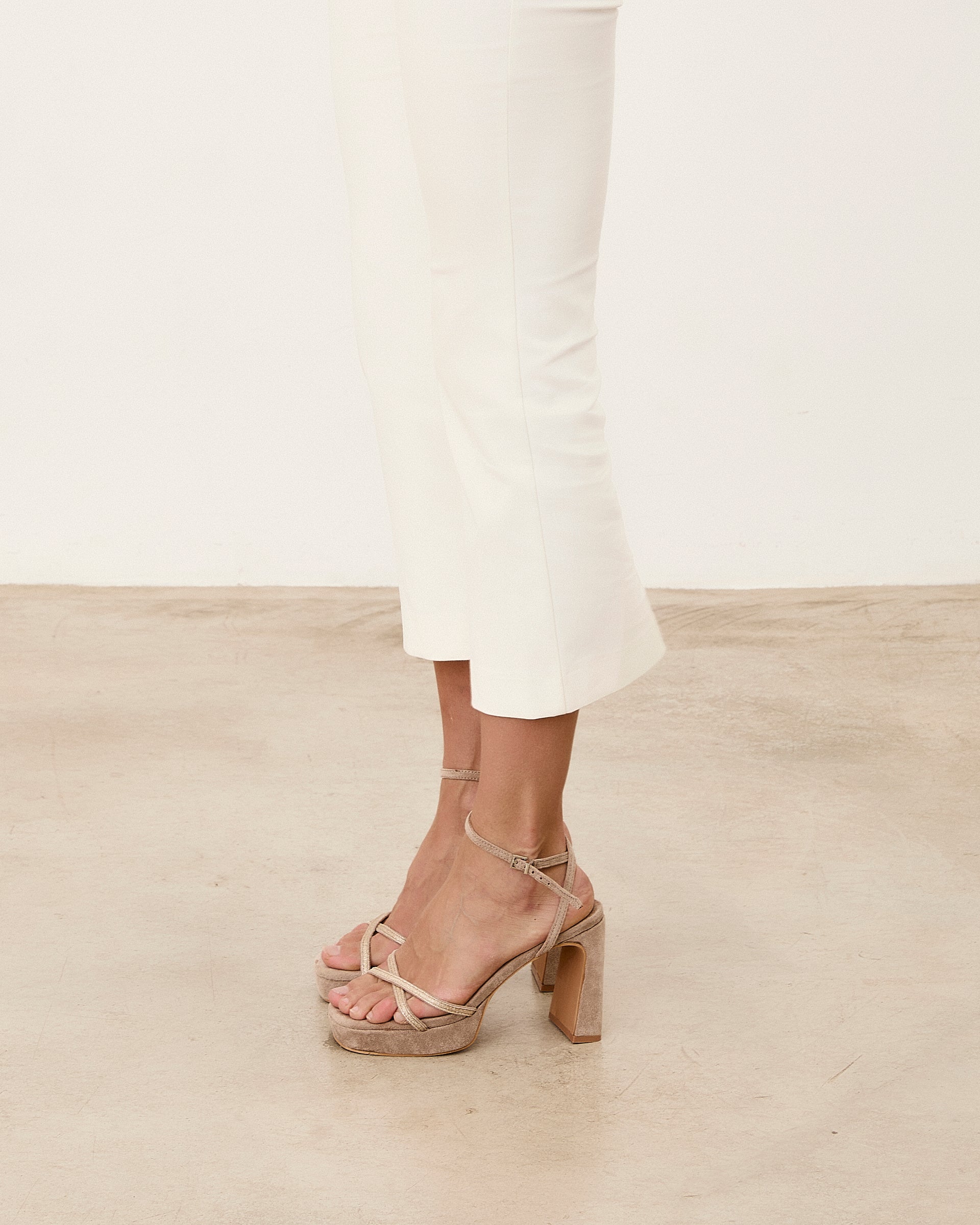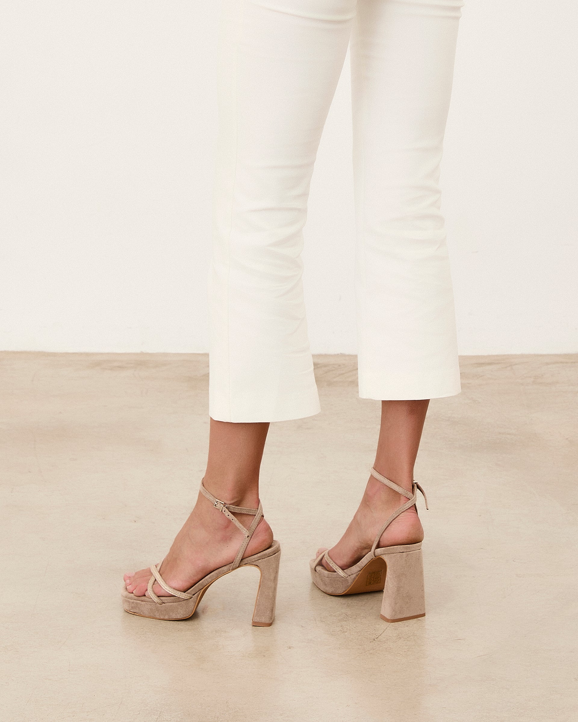 Platform heeled sandal in taupe vegan suede with straps on the front. Ankle closure with buckle.