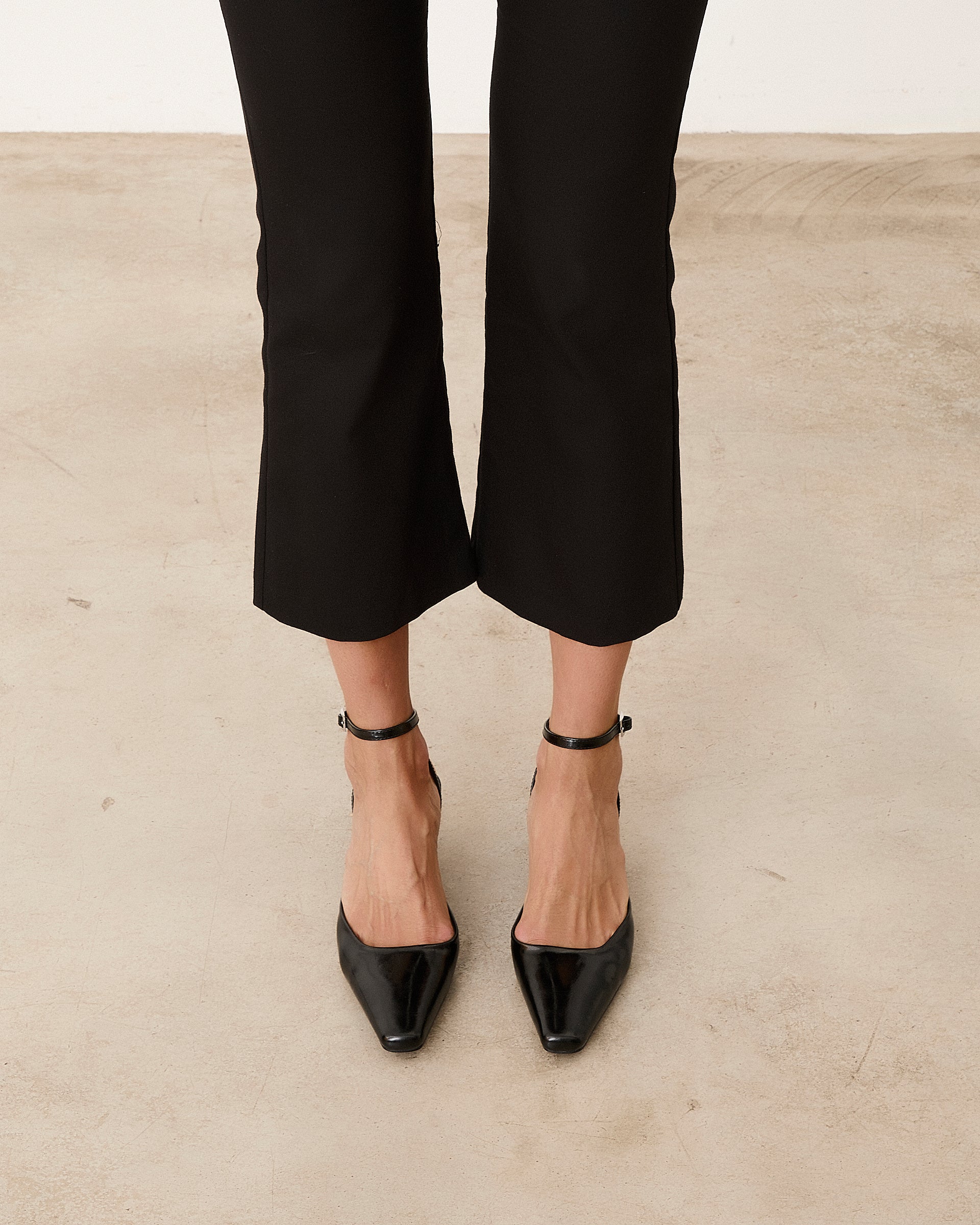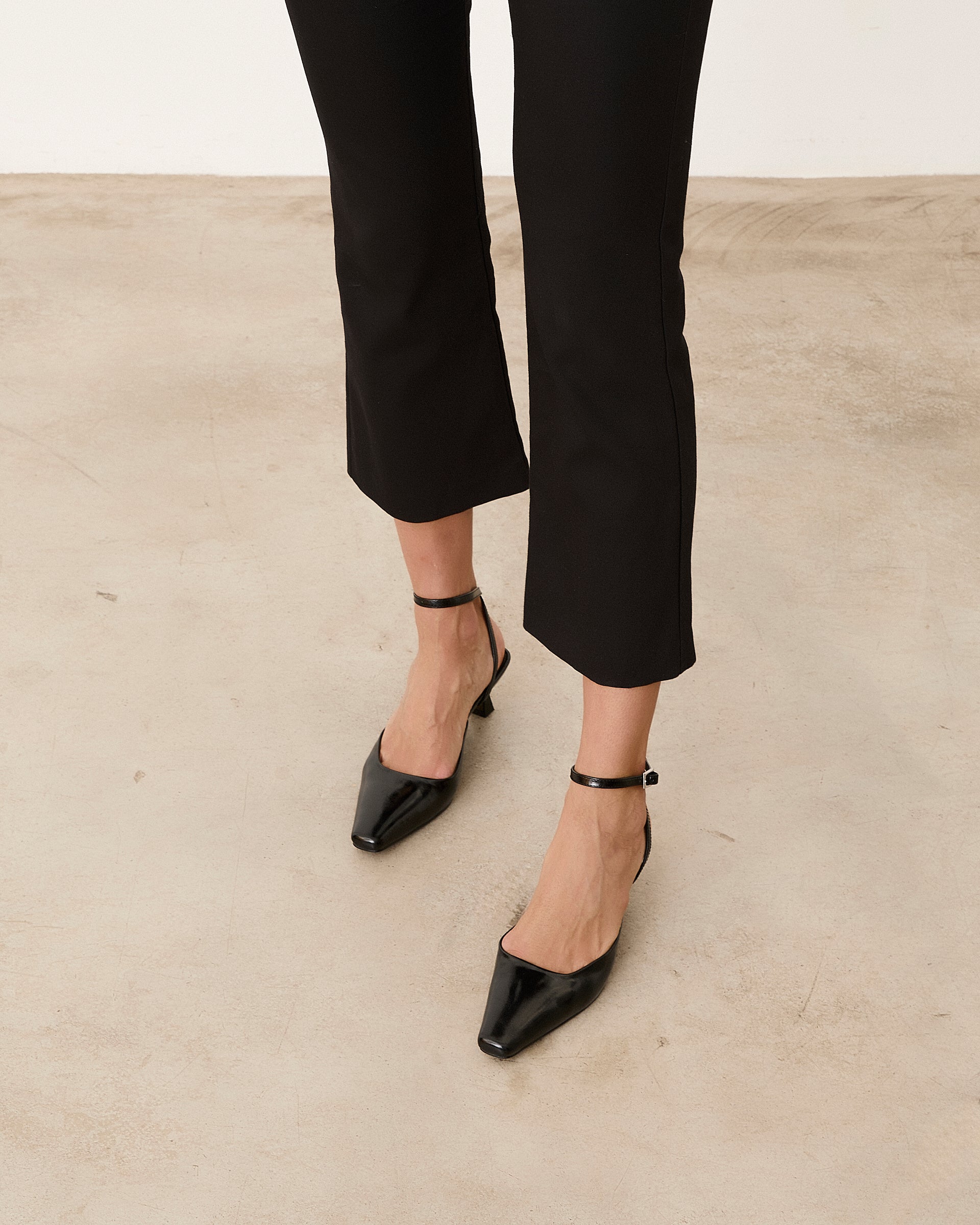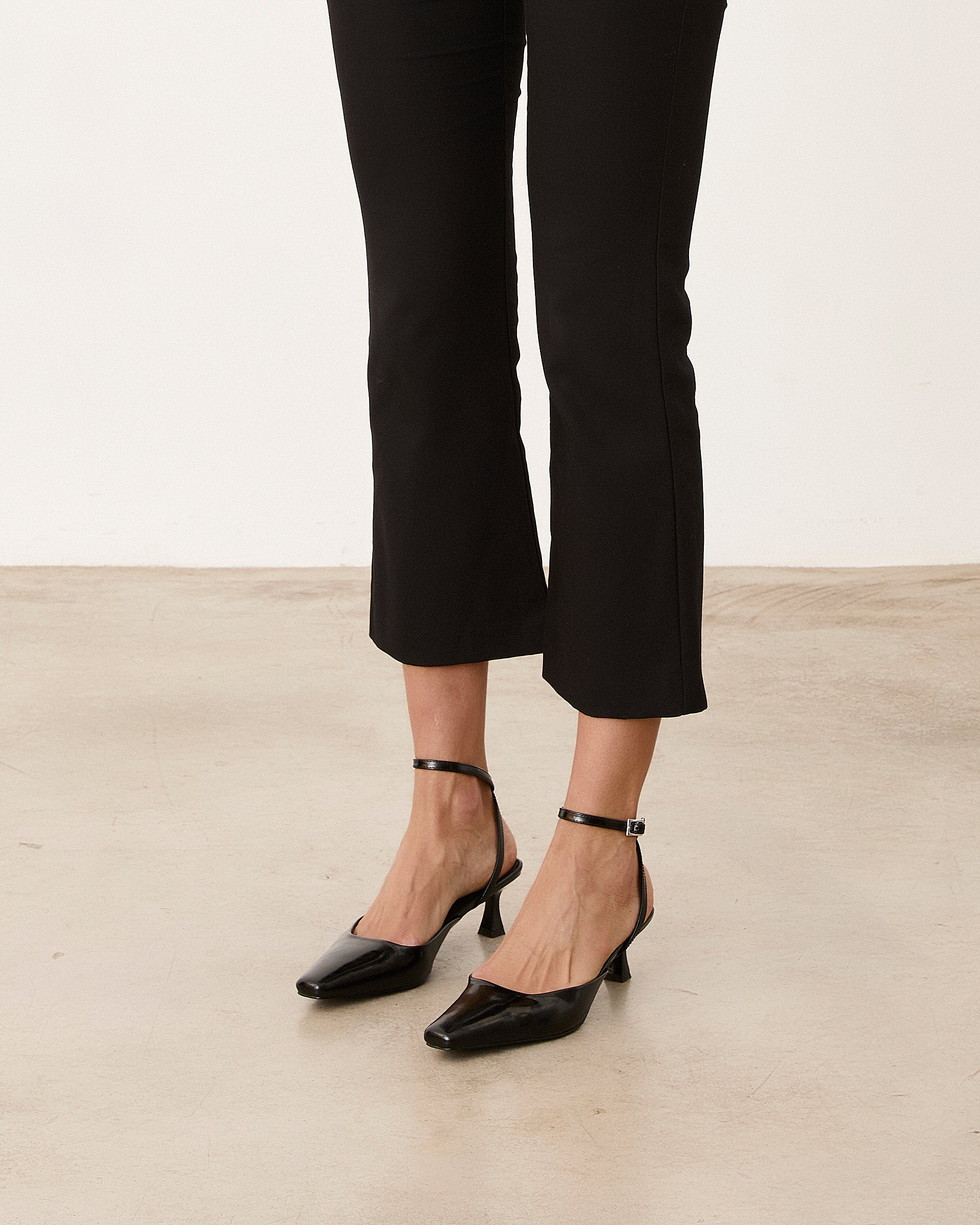 Closed stiletto heel with pointed finish in black color. Ankle strap for closure.