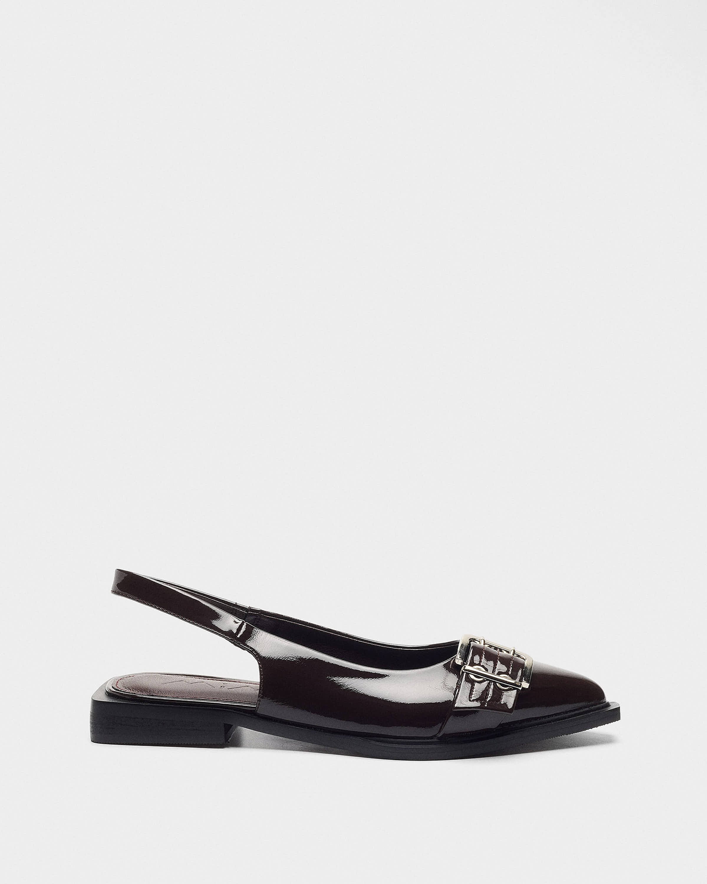 Closed patent leather effect pointed shoe. Slingback back in chocolate color.