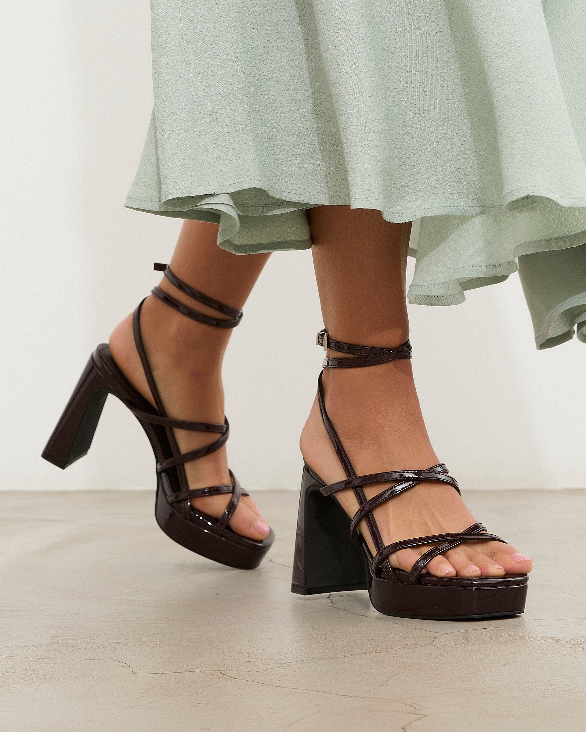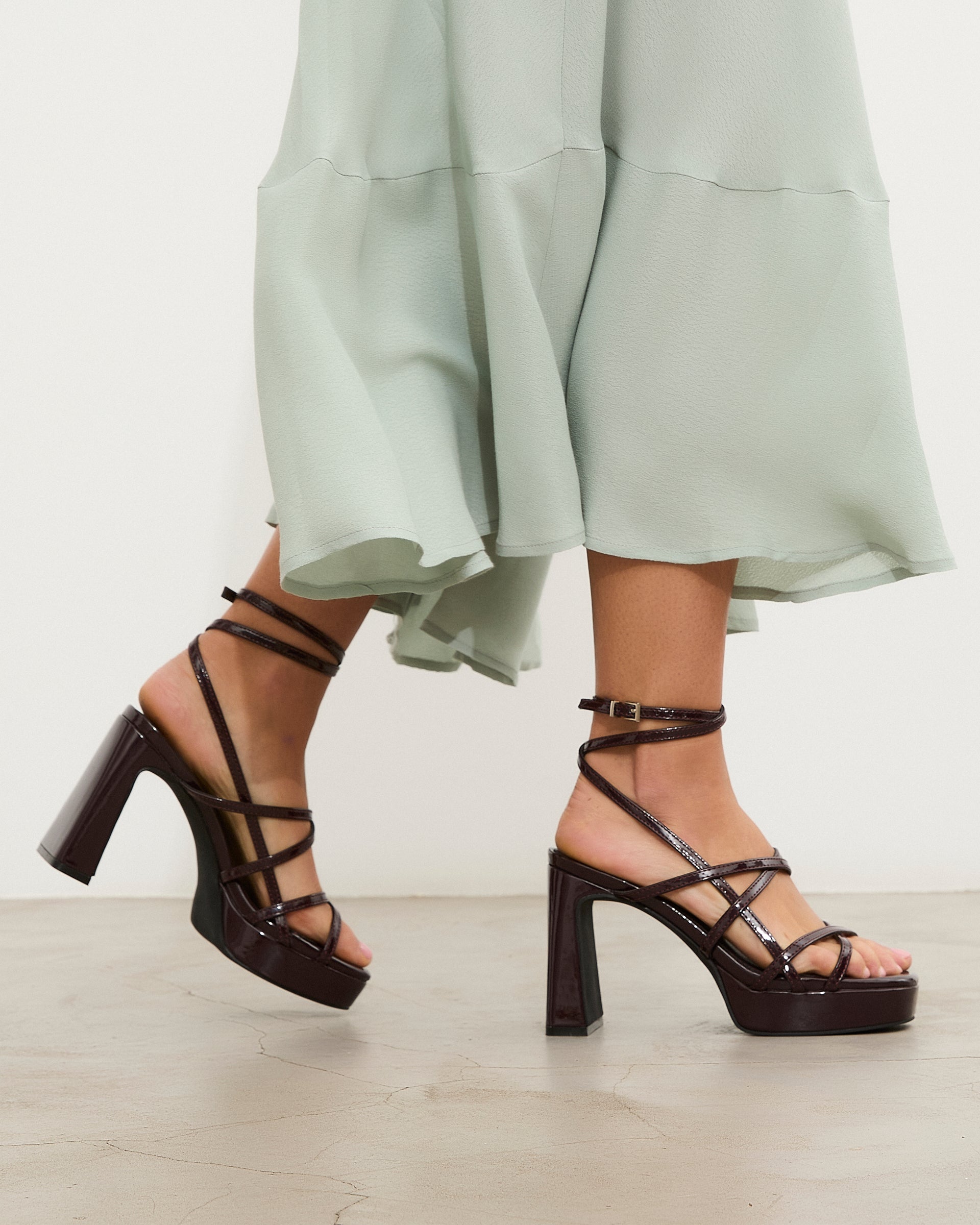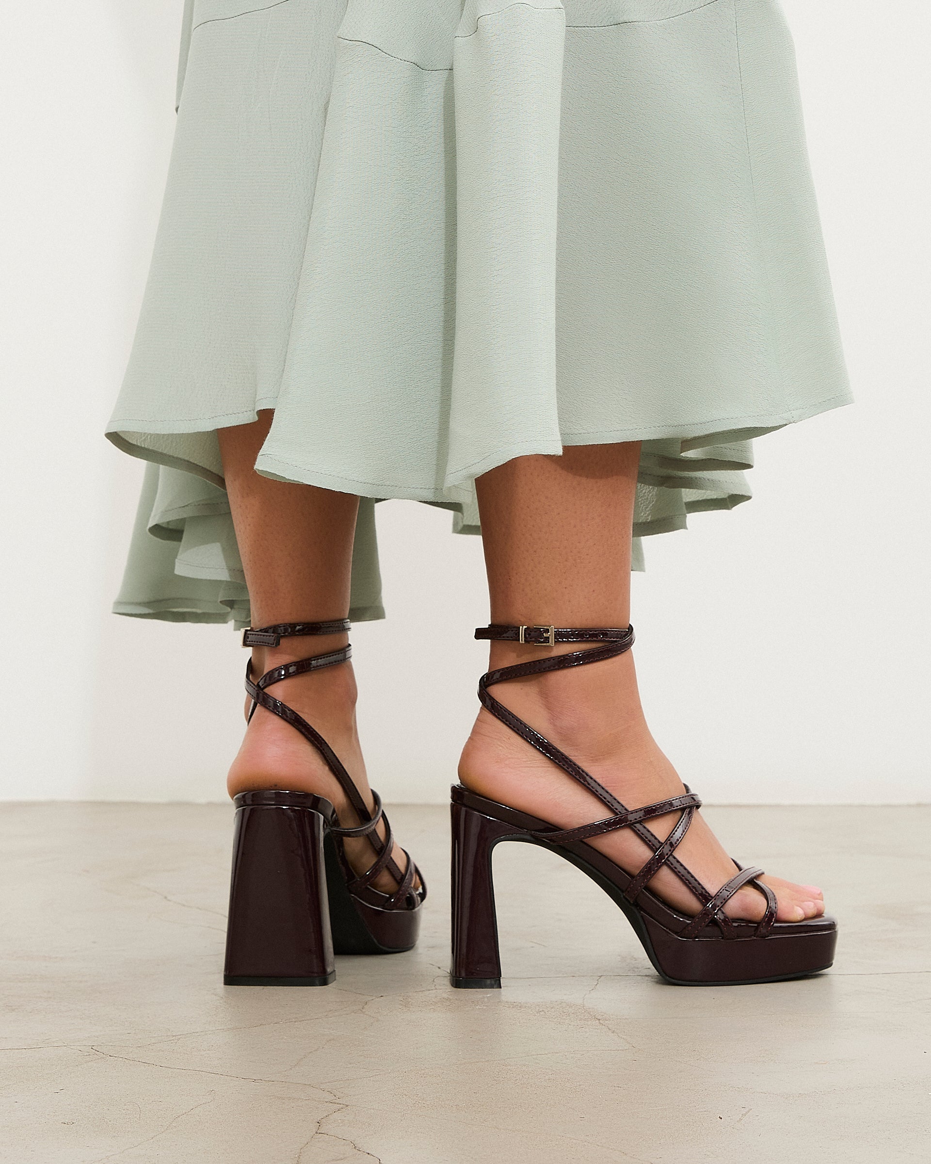 Burgundy-colored heeled sandal with platform. Open front with straps and rectangular heel. Ankle strap closure with metal buckle.