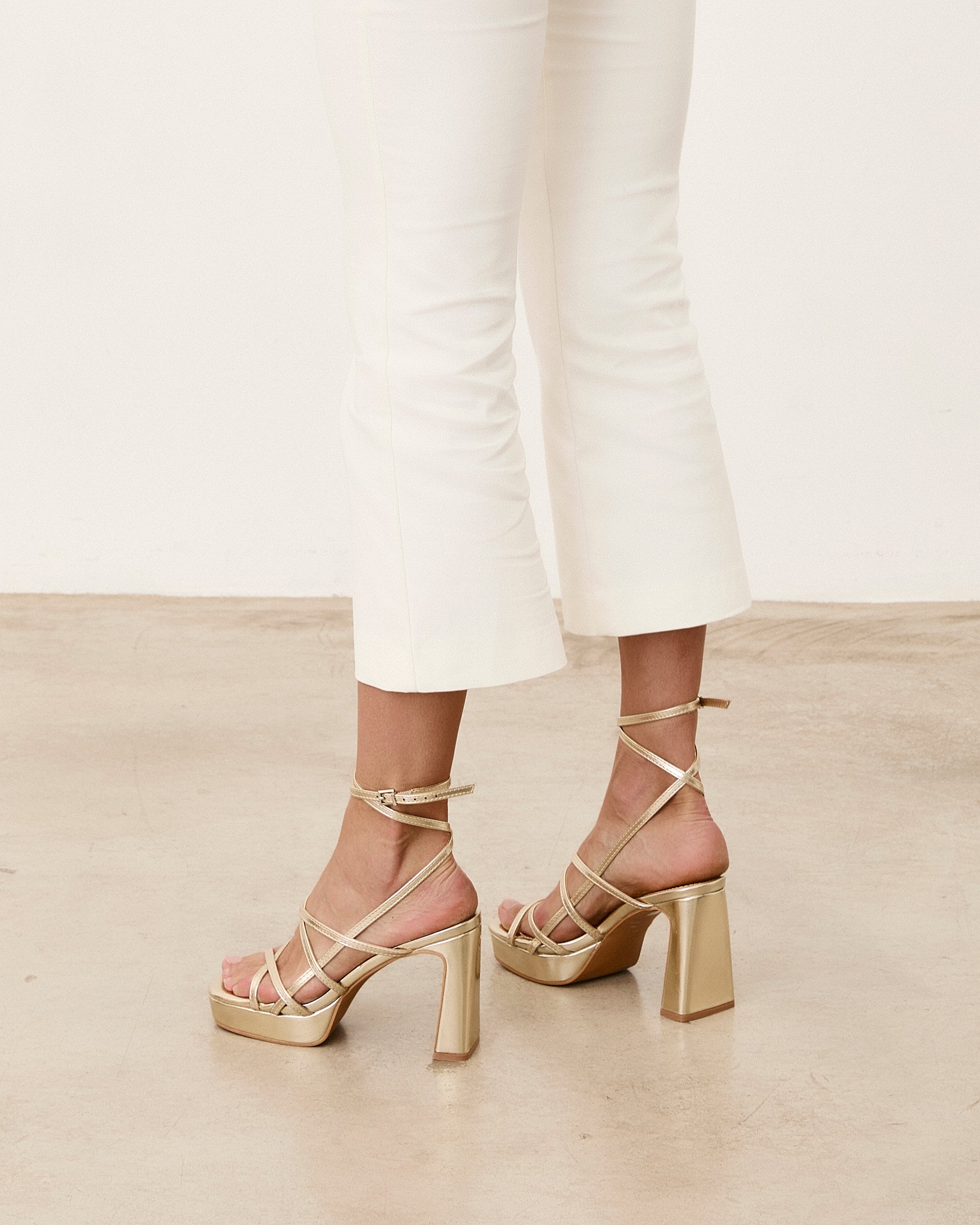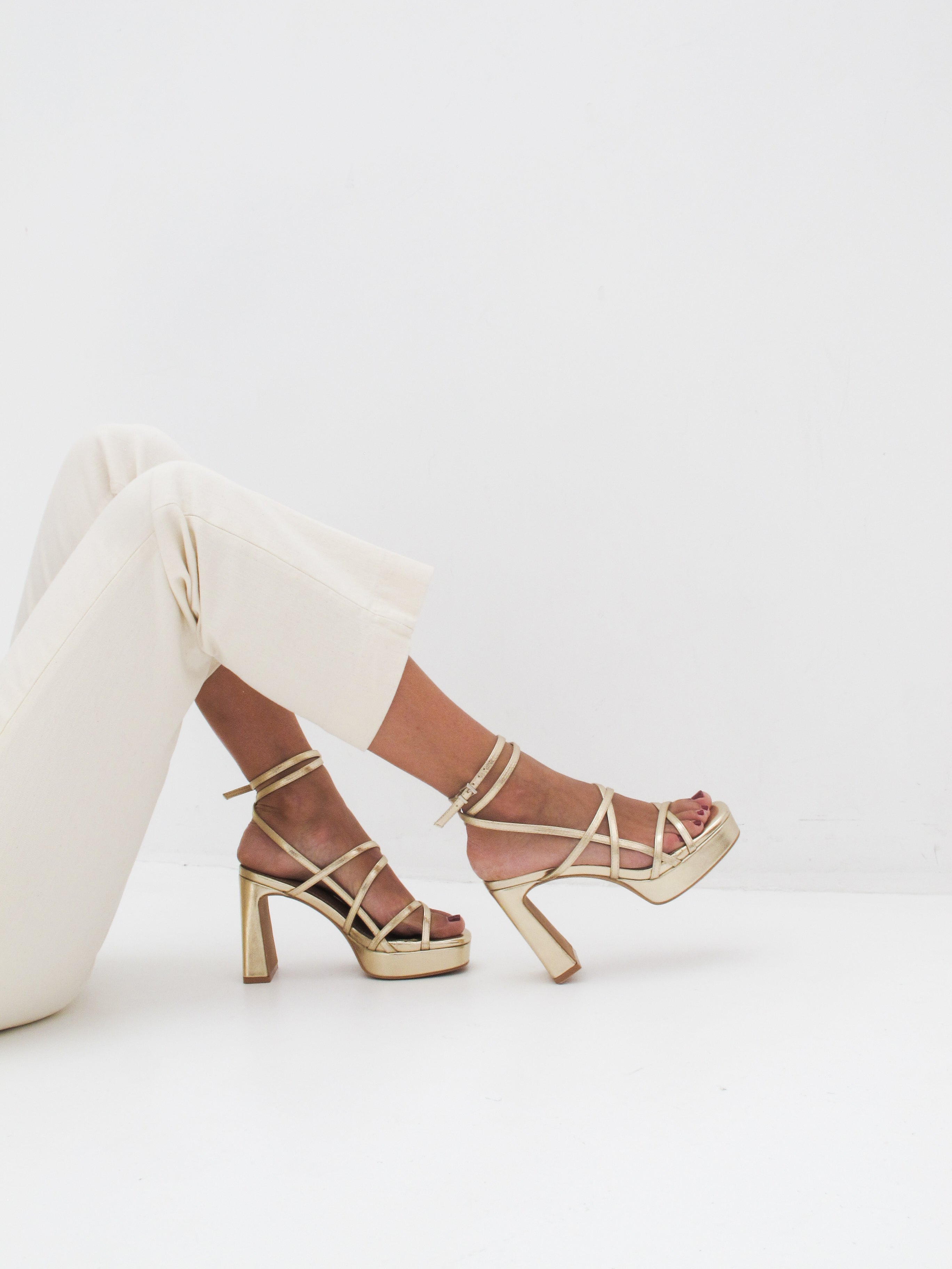 Shiny gold heel and platform sandal. Open front with several asymmetrical straps and rectangular heel. Ankle strap closure with metal buckle.