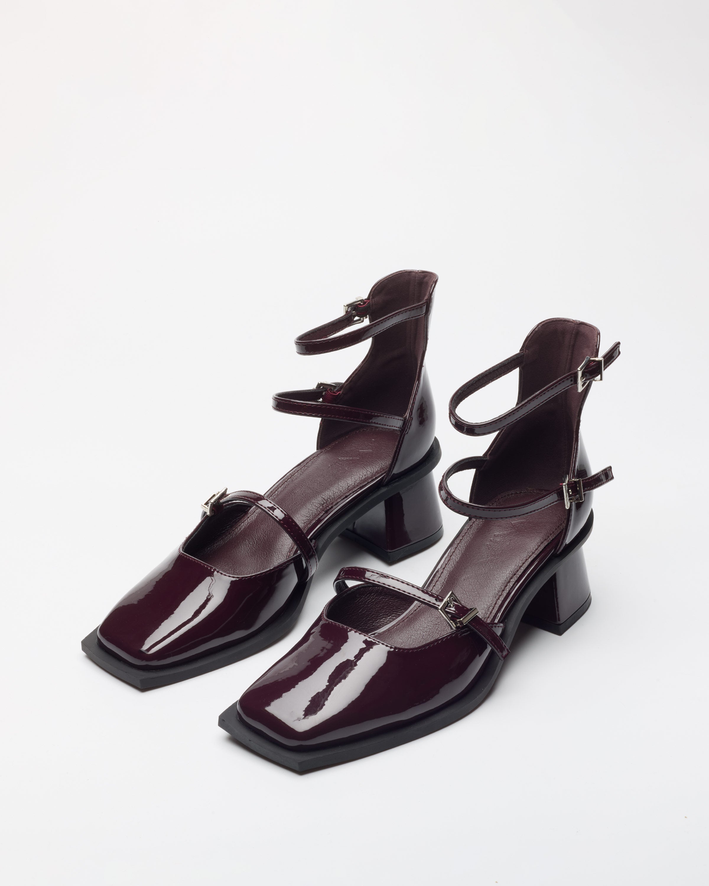 Closed heel shoe in burgundy patent PU. Open front with several straps with buckles along the instep and ankle. Square heel. Ankle strap closure with buckle