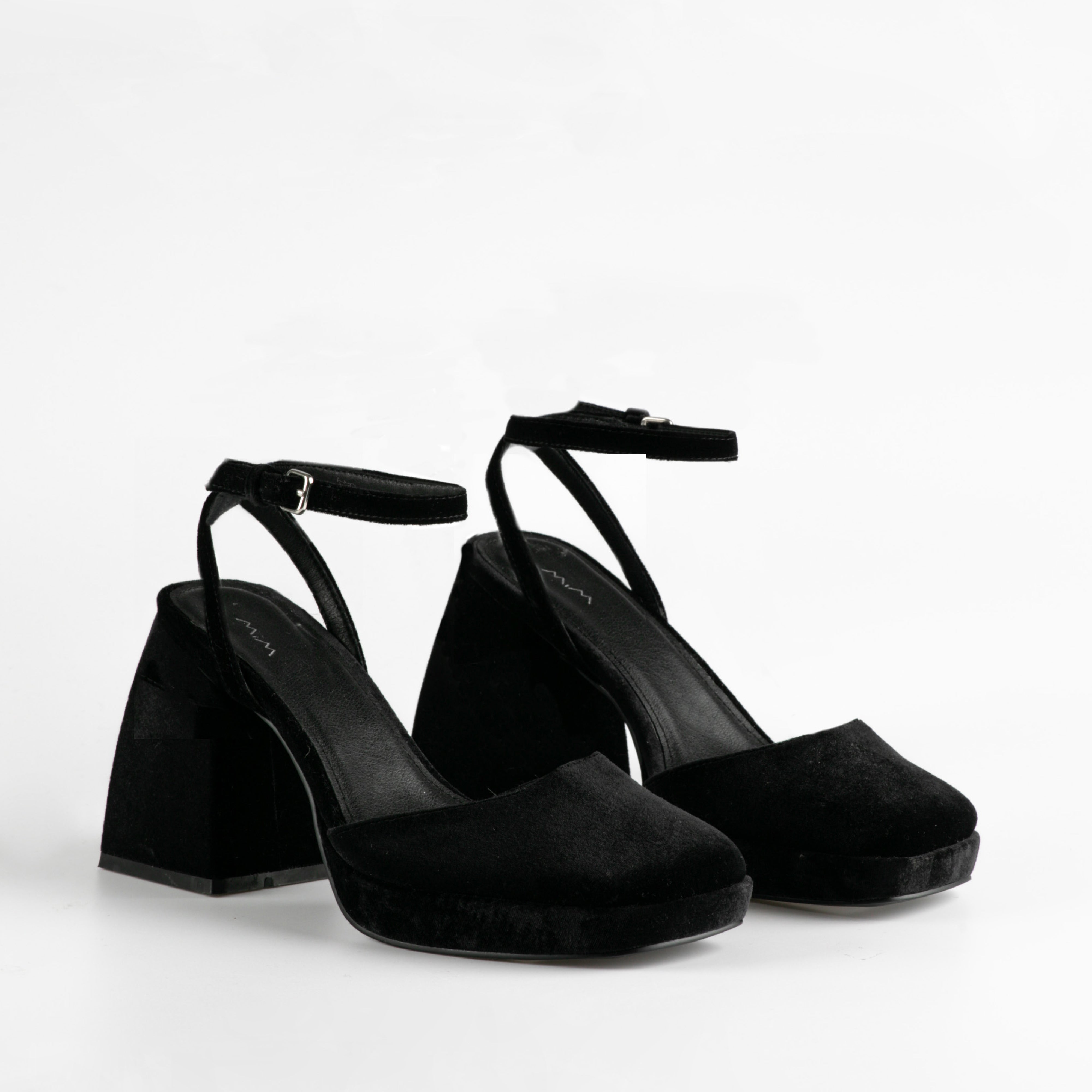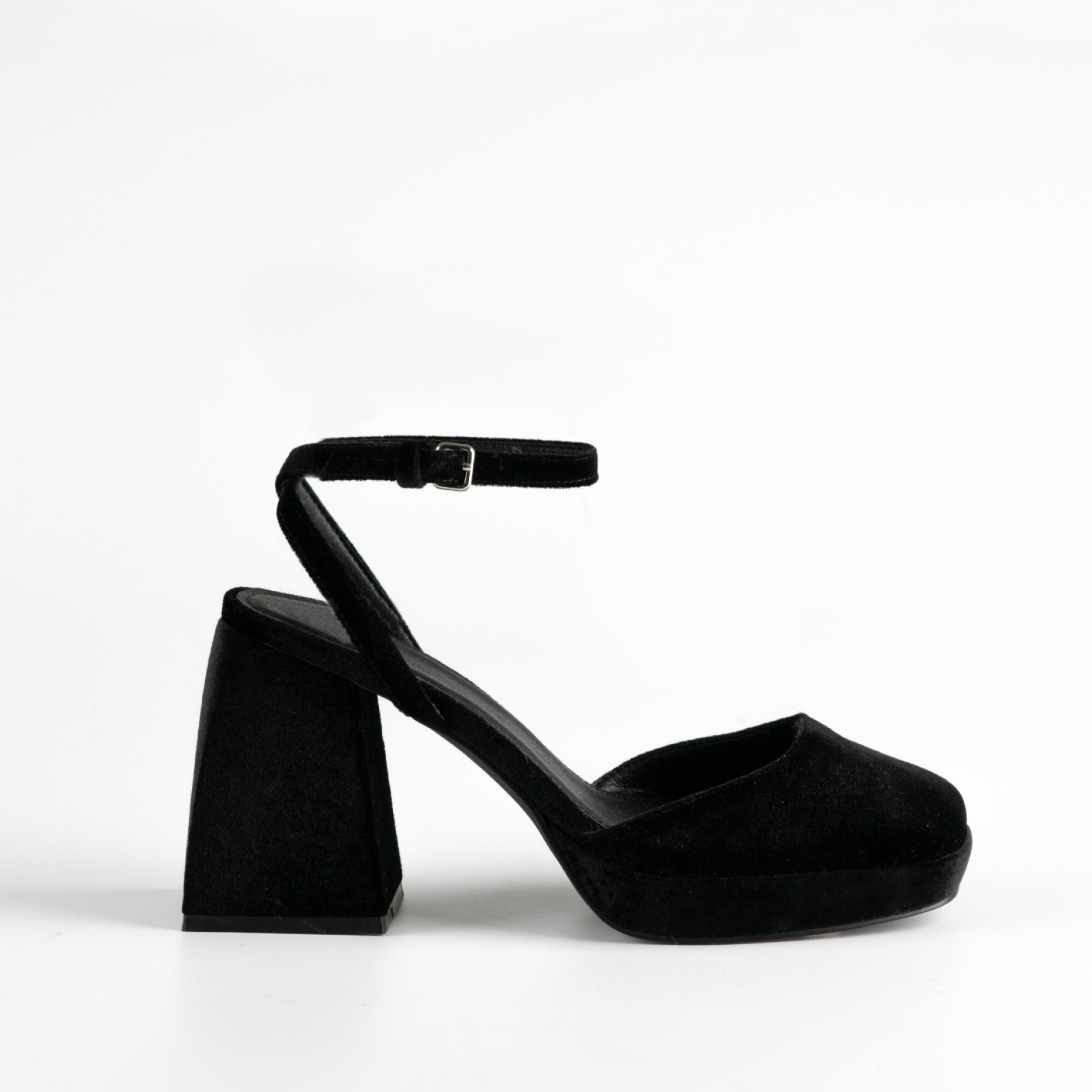 Closed heel shoe in black velvet. Two straps for ankle support.