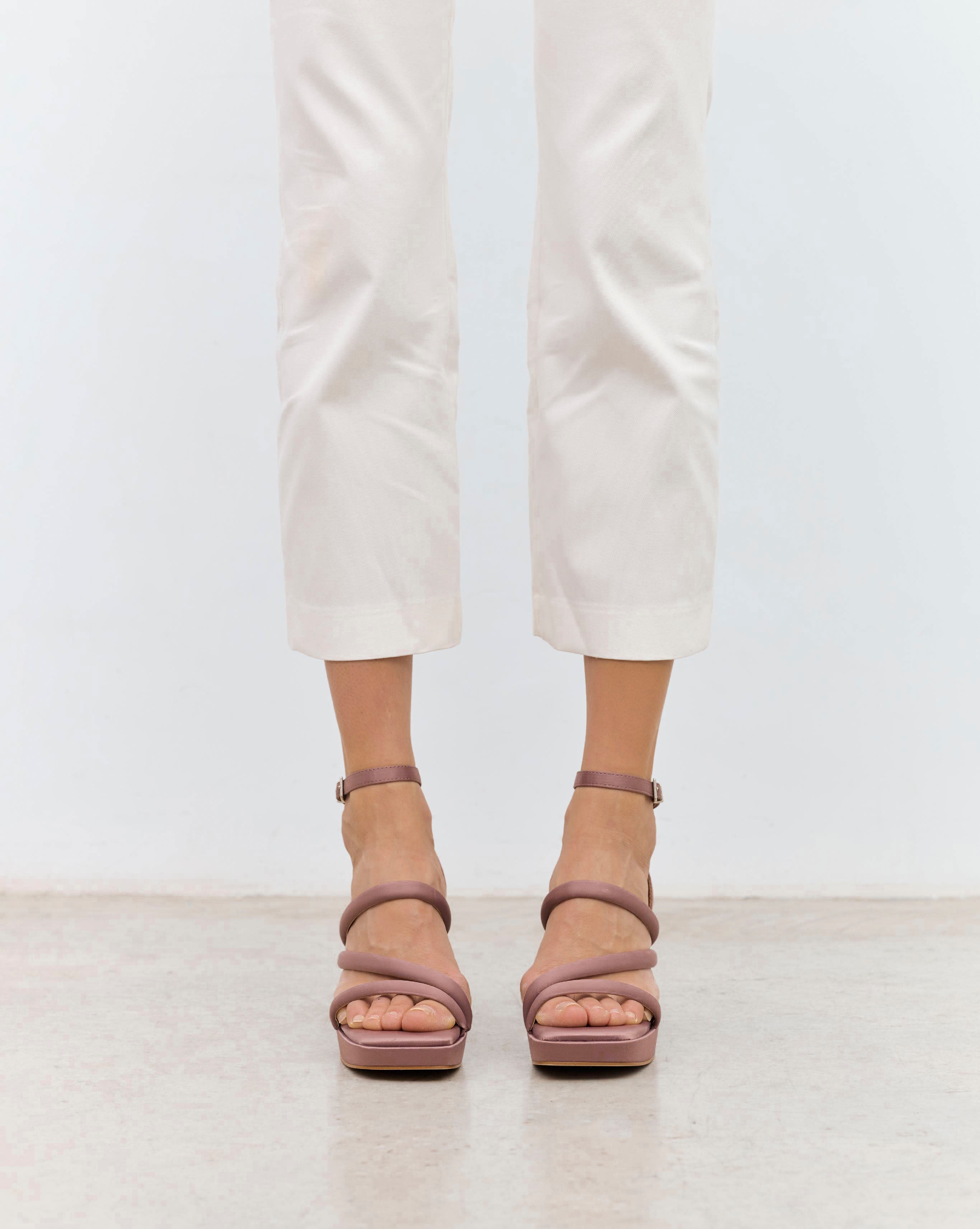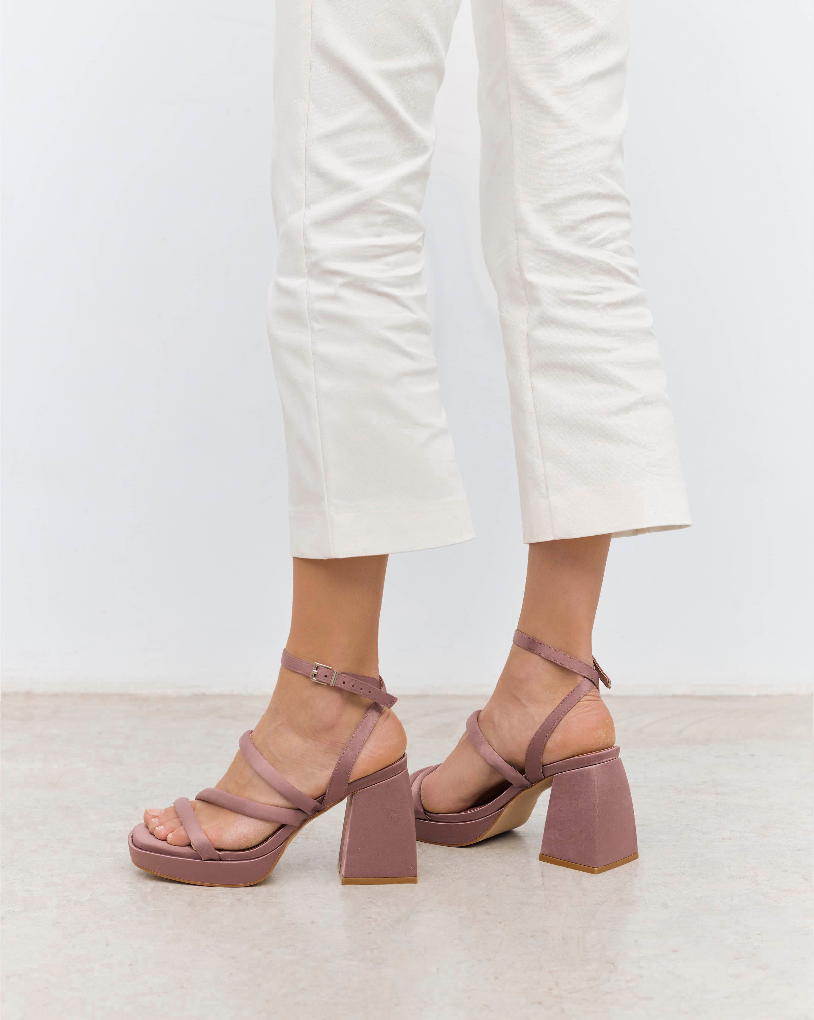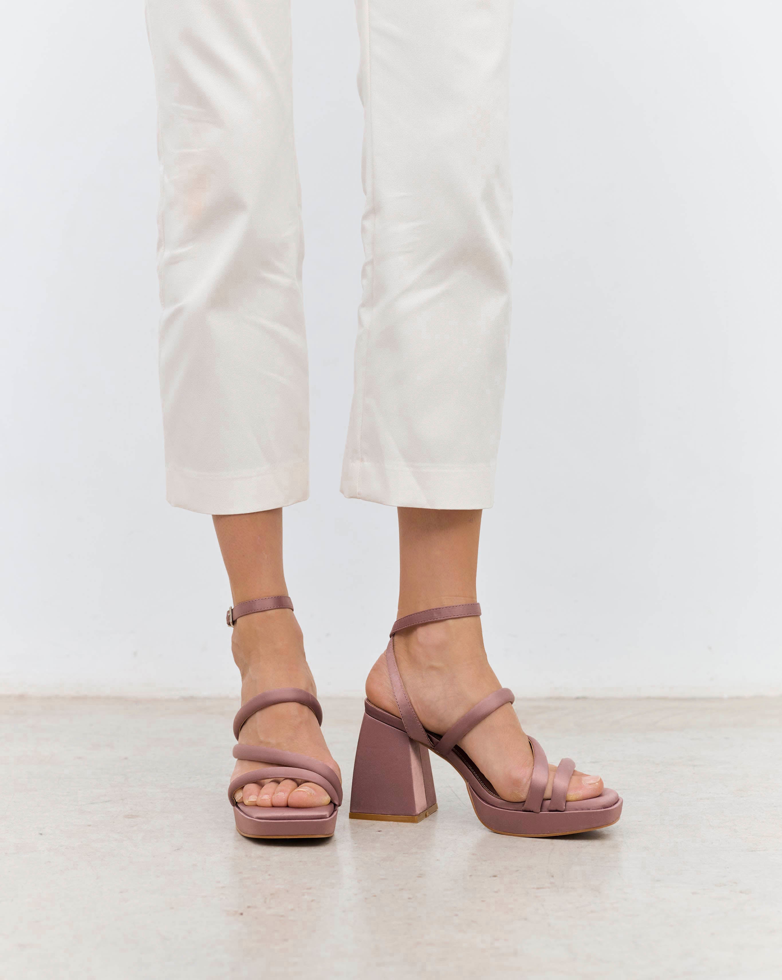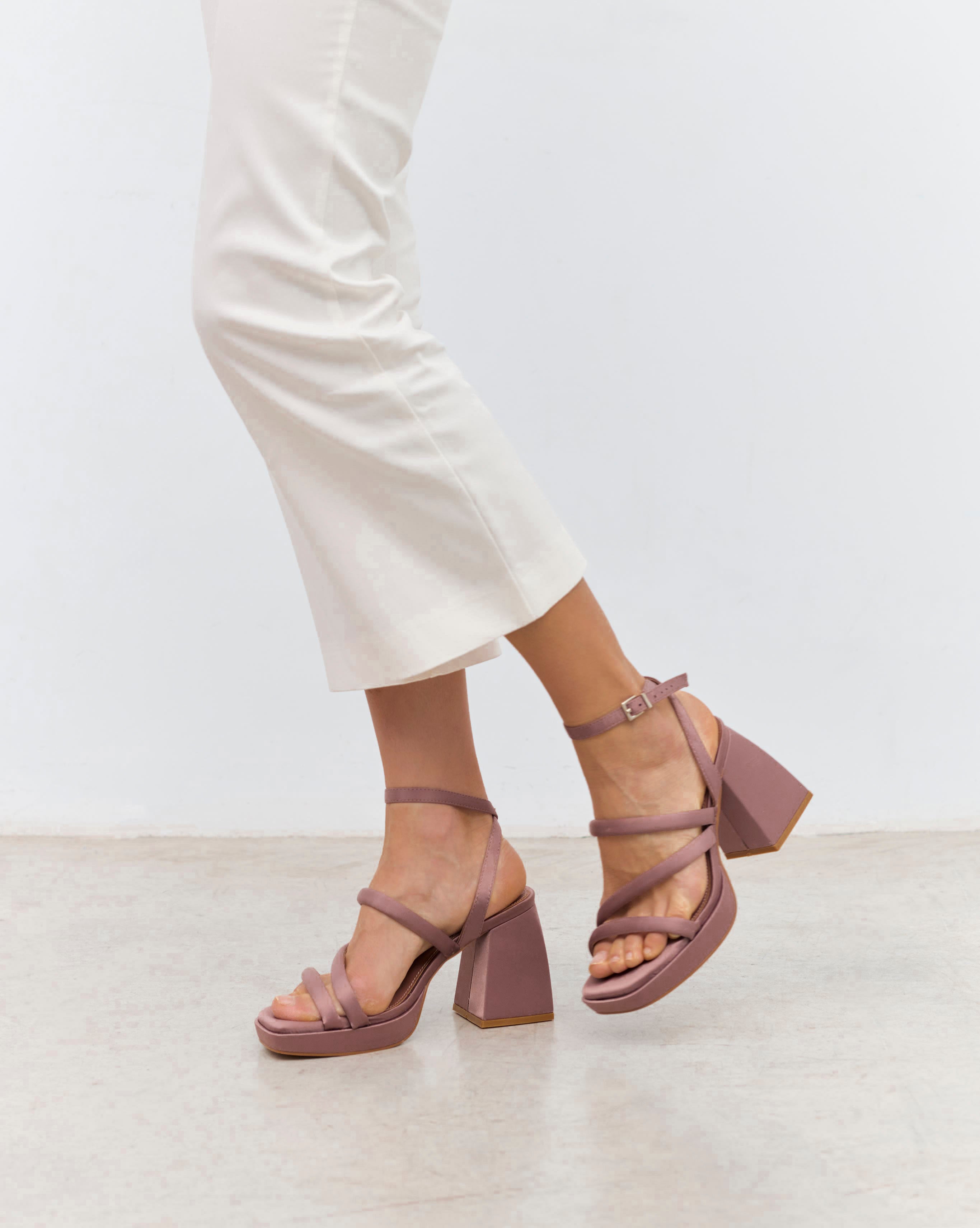 Heeled sandal in mauve satin. Open front with several tubular straps. Square heel. Ankle bracelet closure with metal buckle.