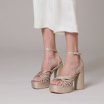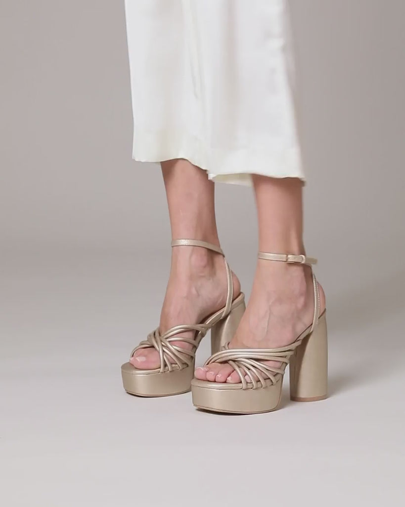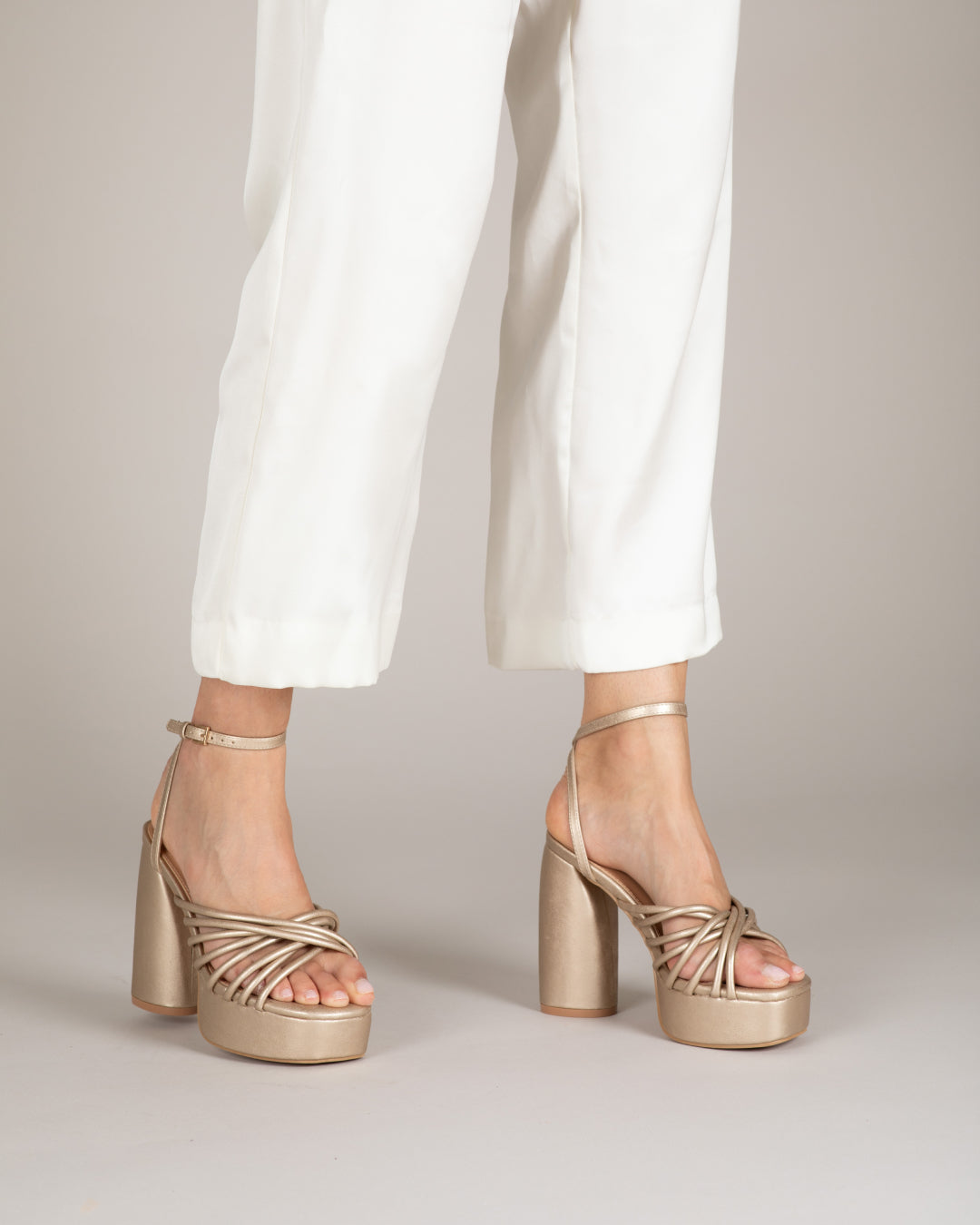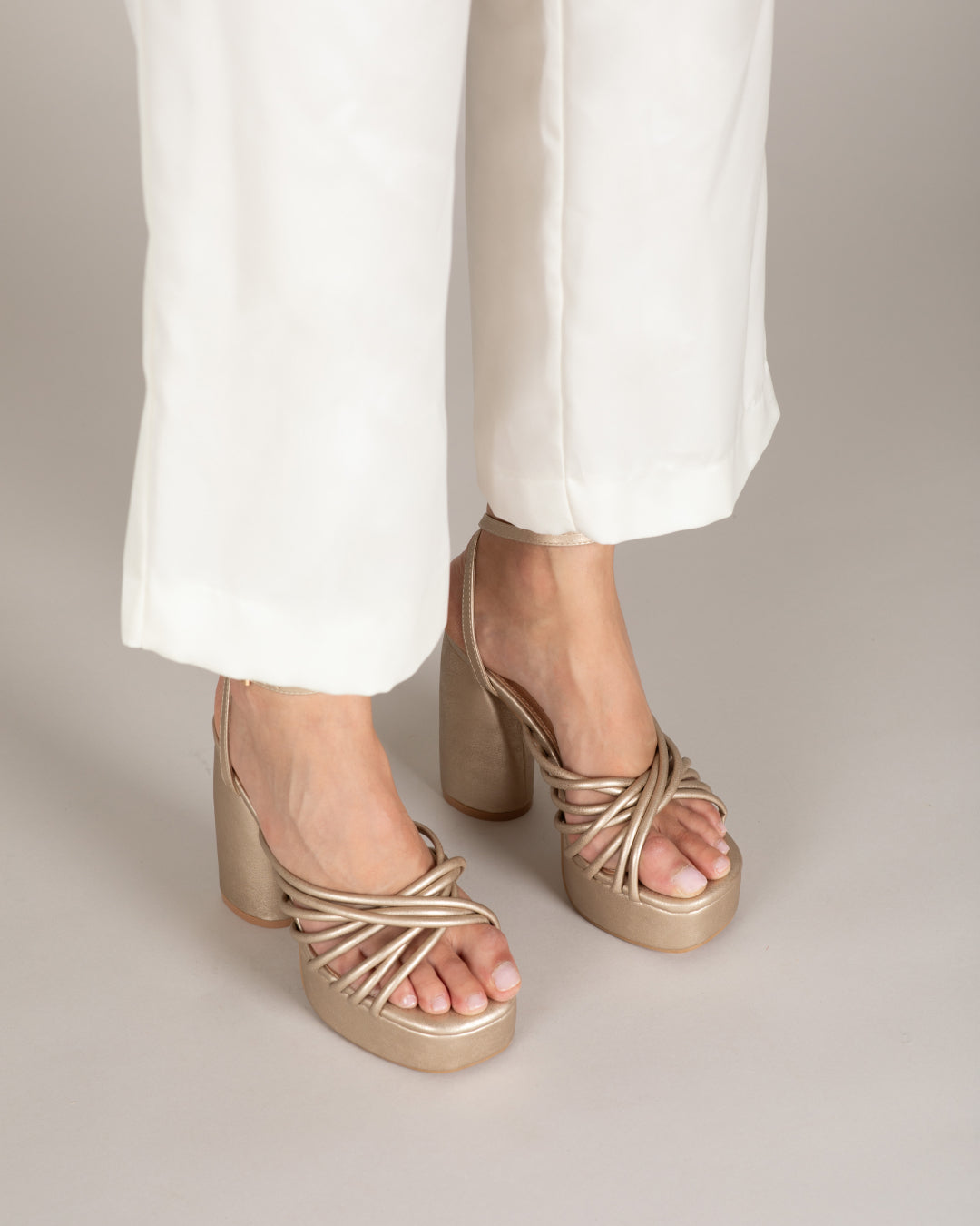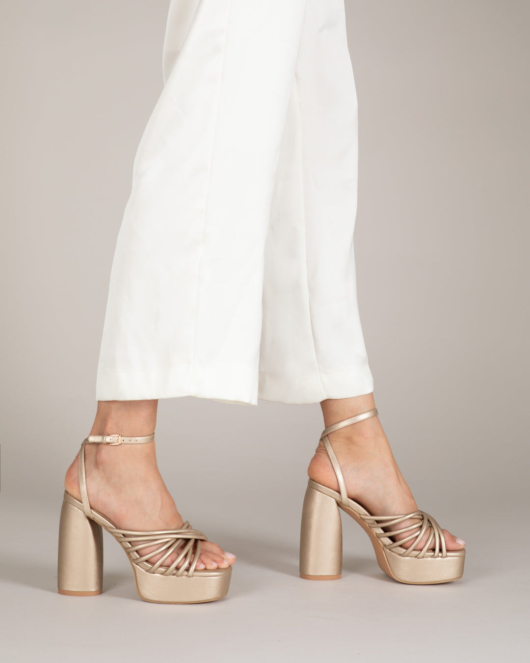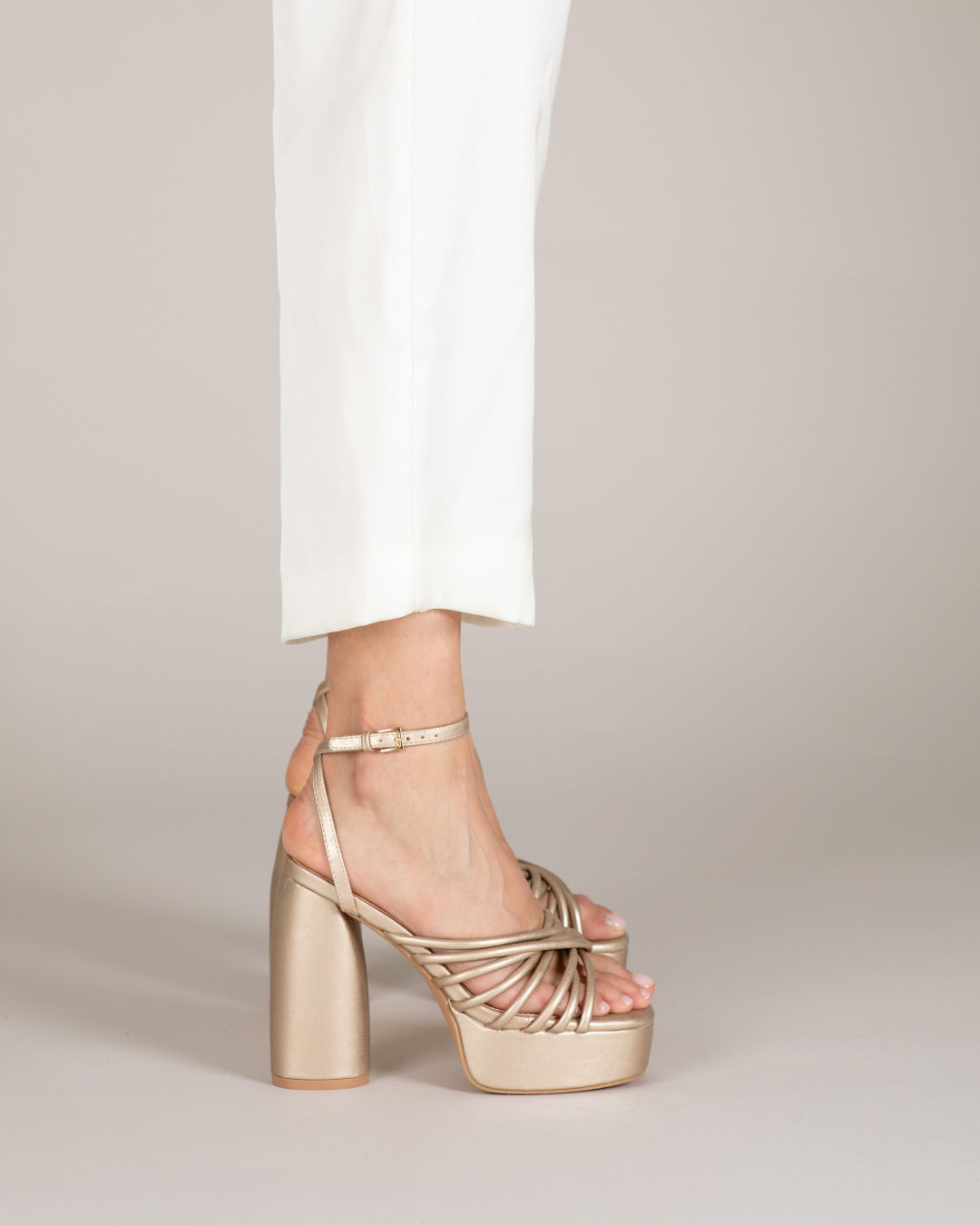 Heeled sandal in gold vegan leather. Open front with several straps and platform. Ankle bracelet closure with metal buckle.