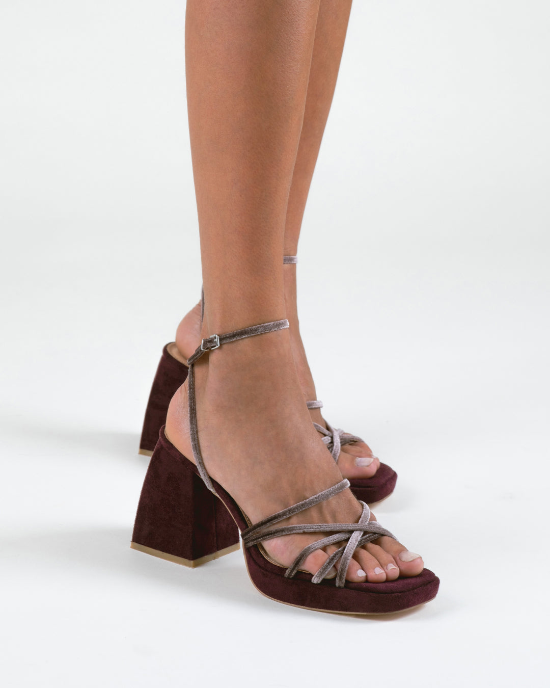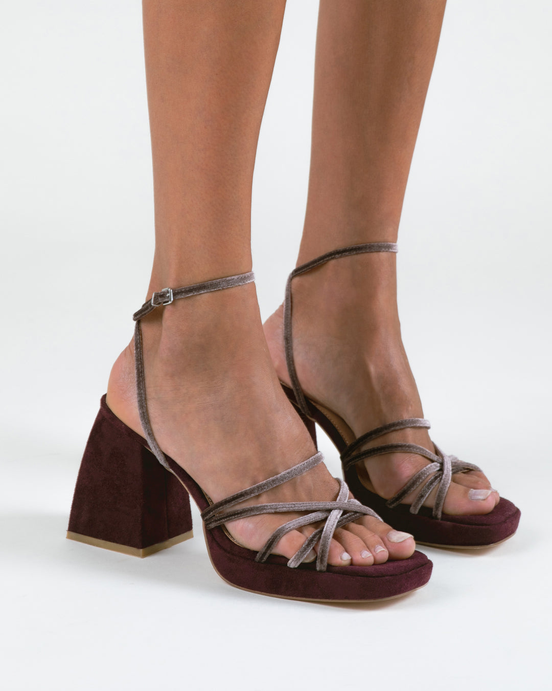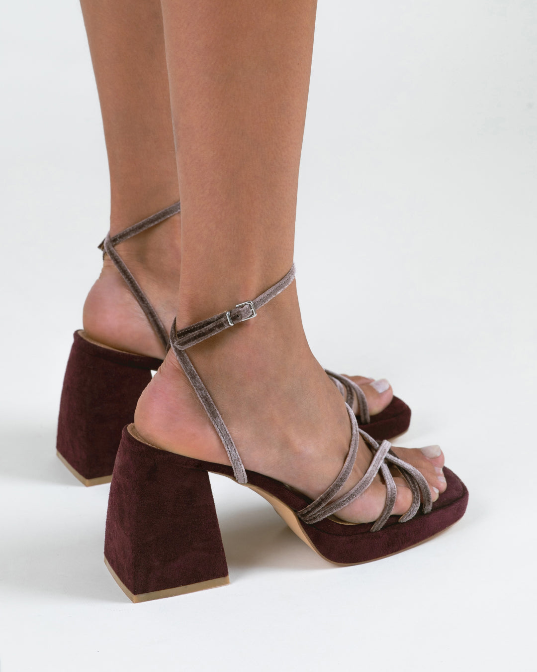 Sandalia de tacón en ante vegano en tonos burdeos con varias tiras finas en la parte delantera y tiras traseras en el tobillo con cierre de hebillas.