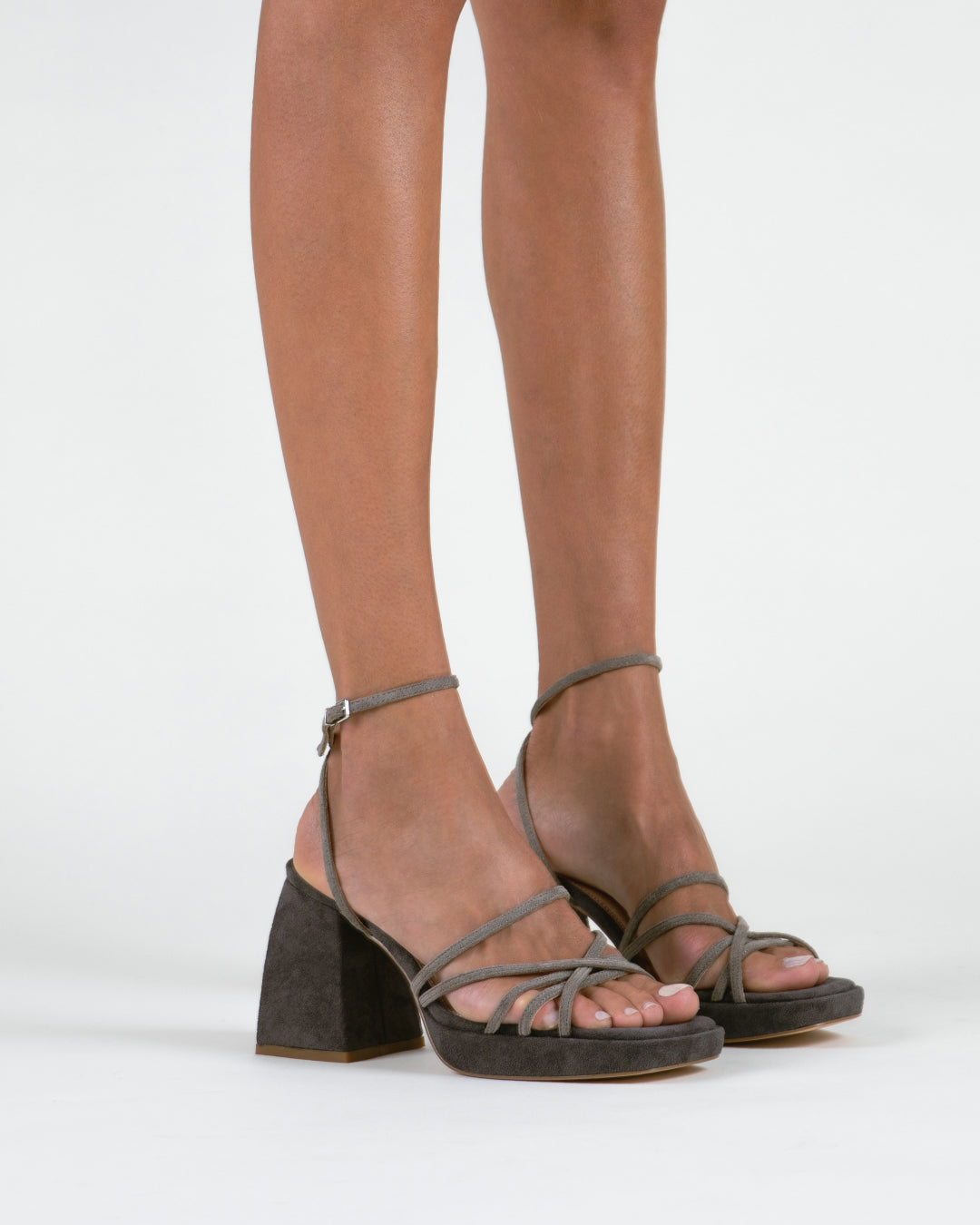 Sandalia de tacón en ante vegano color topo con varias tiras finas en la parte delantera y tiras traseras en el tobillo con cierre de hebillas.