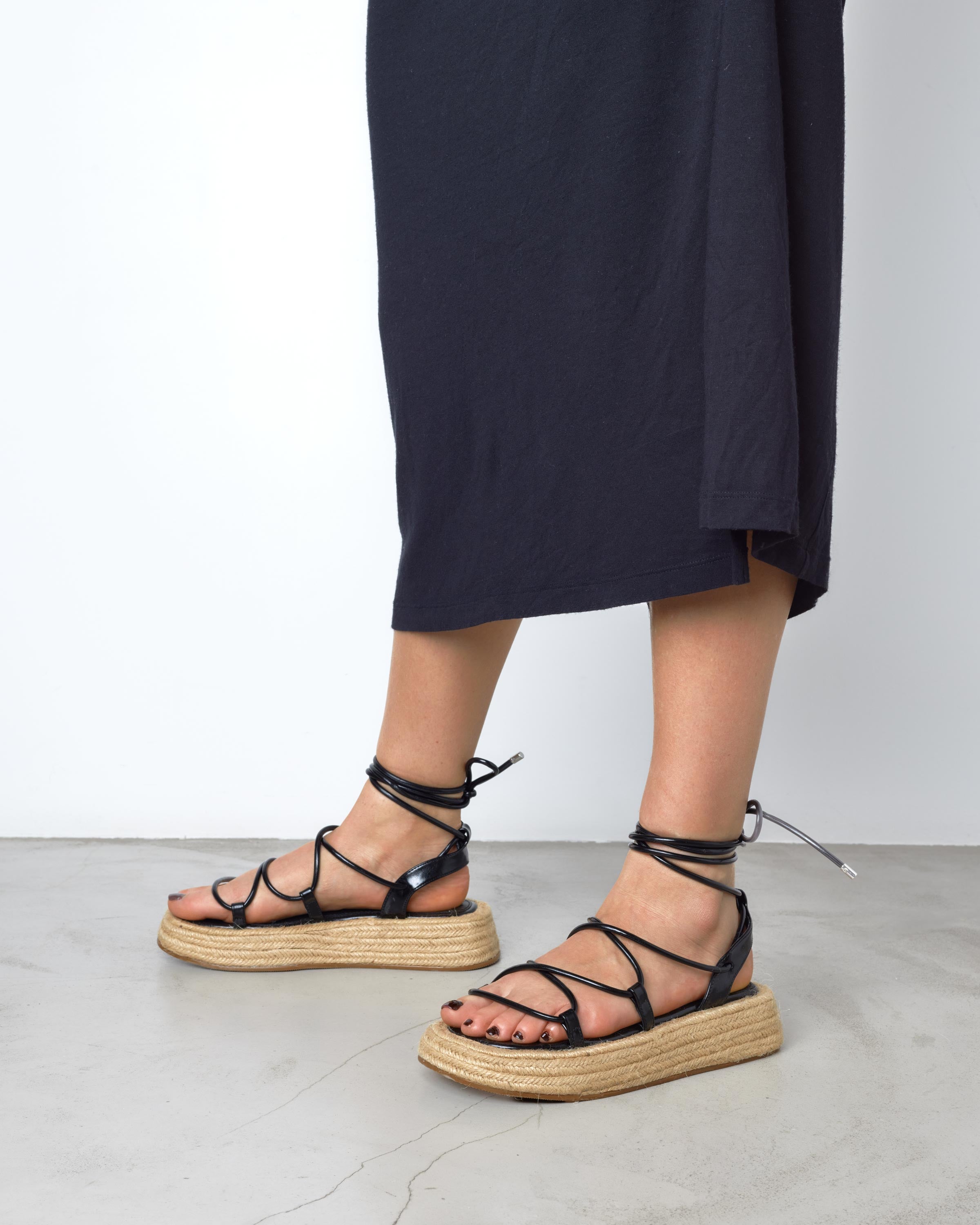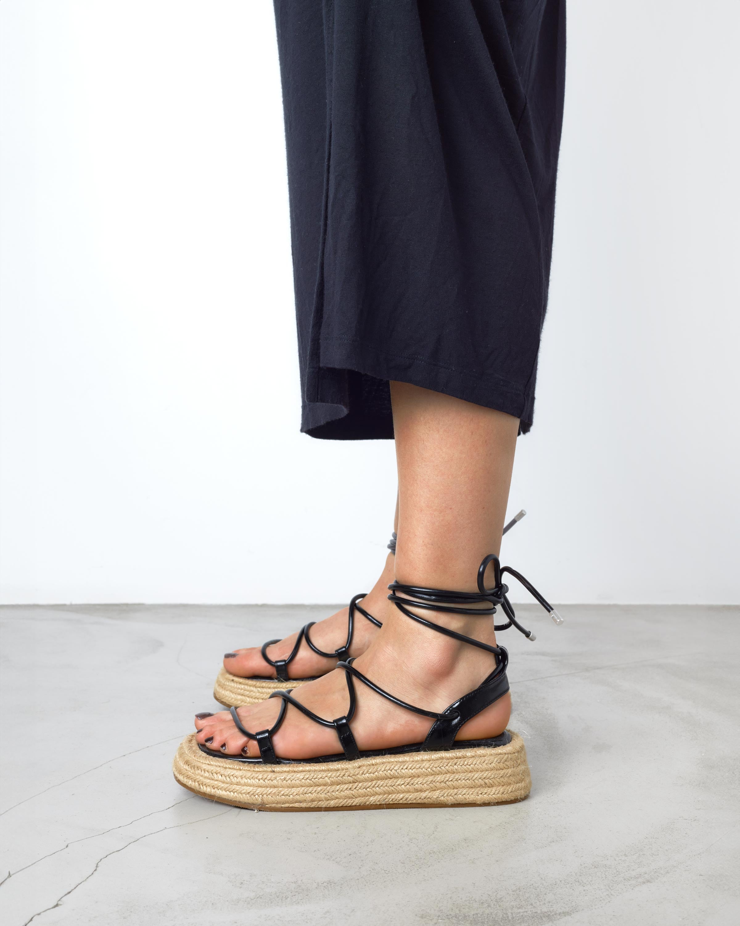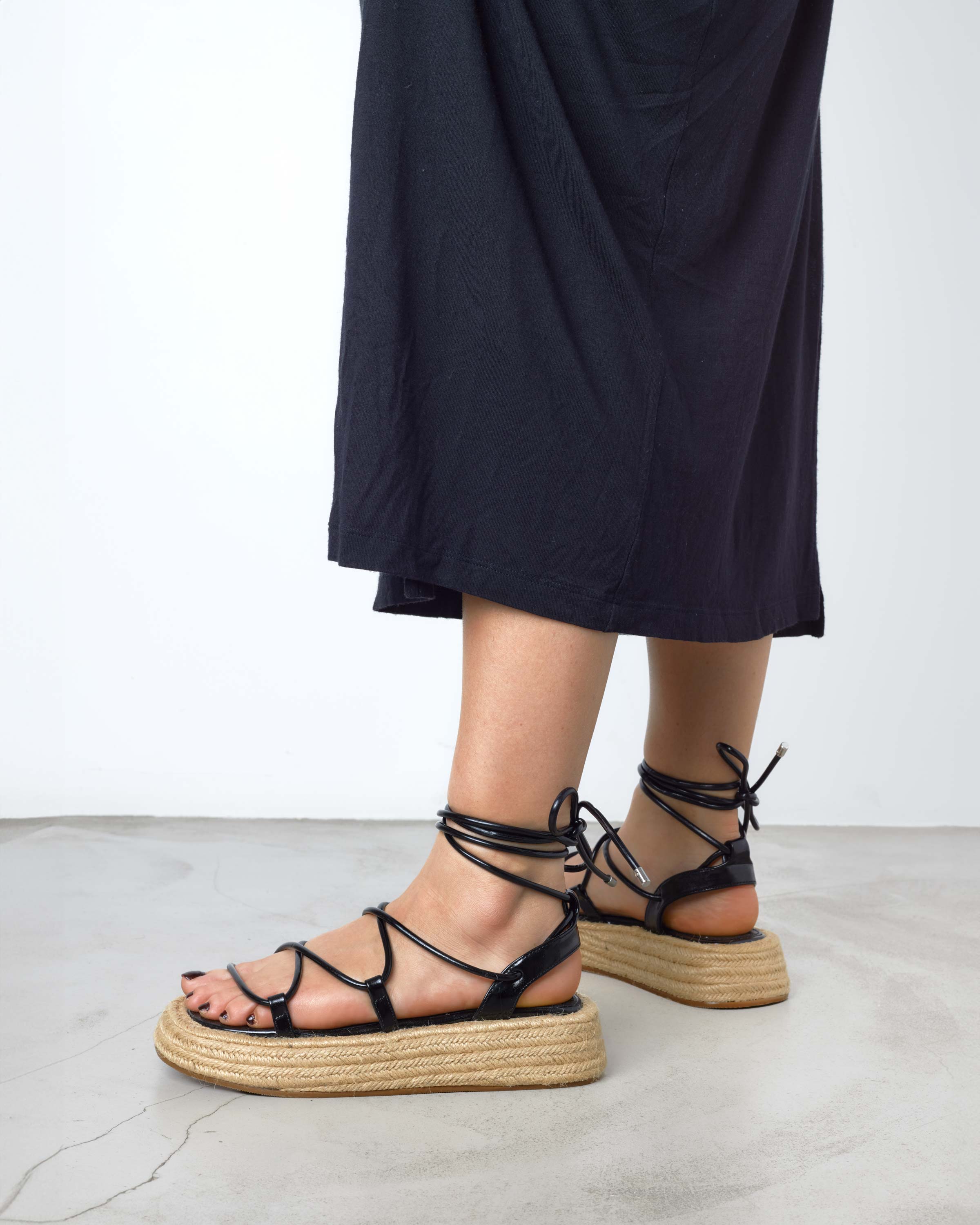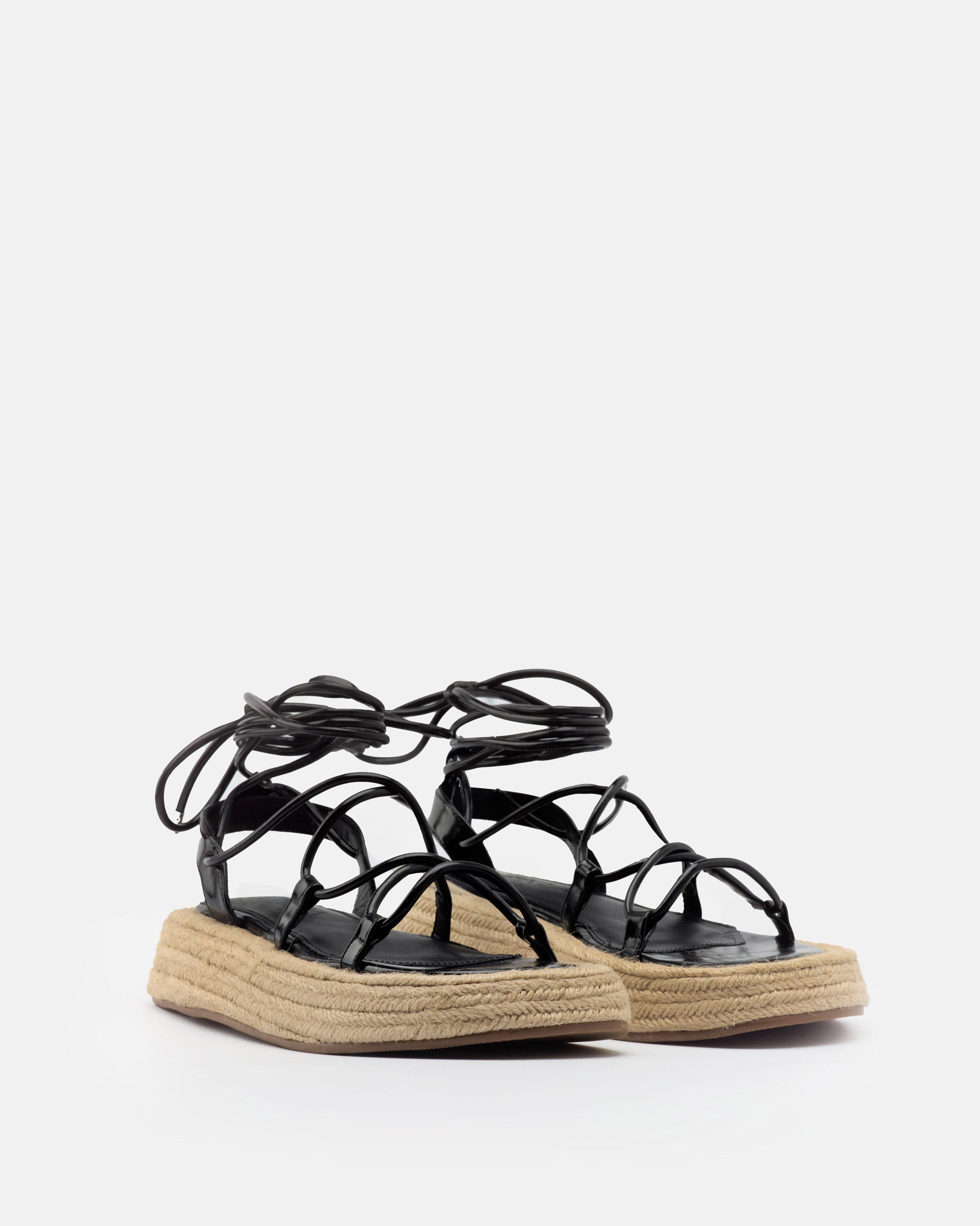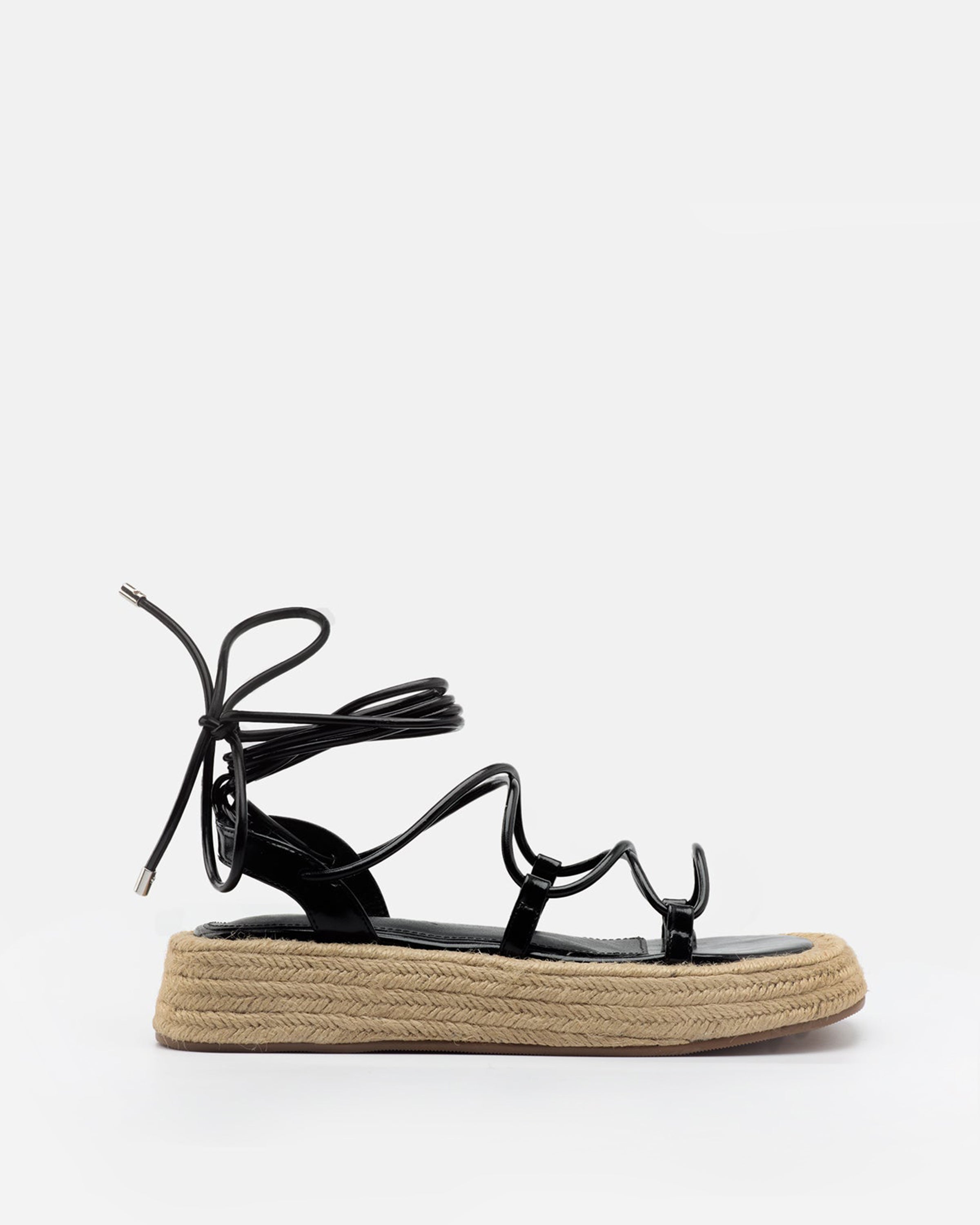 Sandalia esparto con plataforma en color negro. Compuesto por varias tiras tubulares y cierre con tiras anudadas al tobillo.