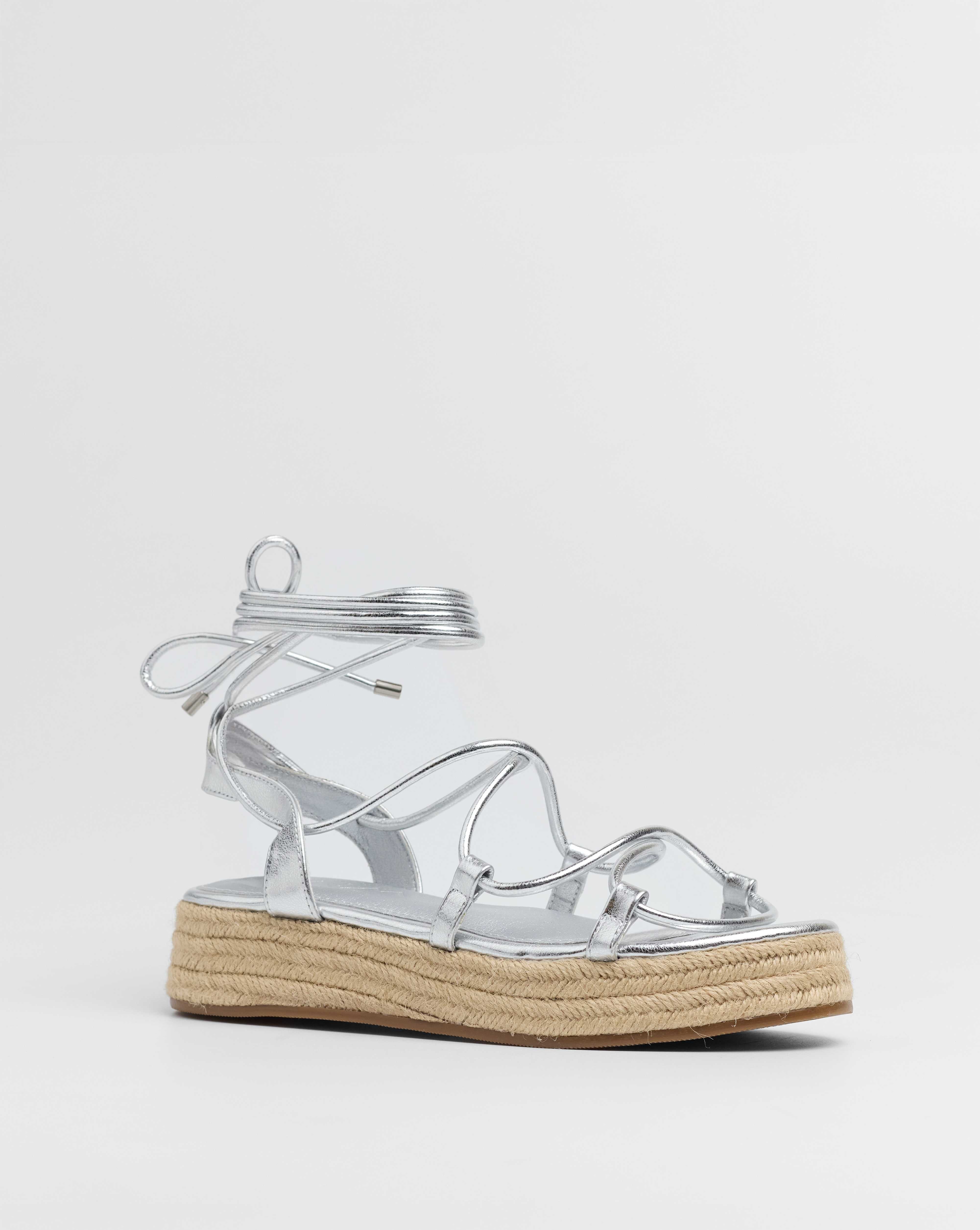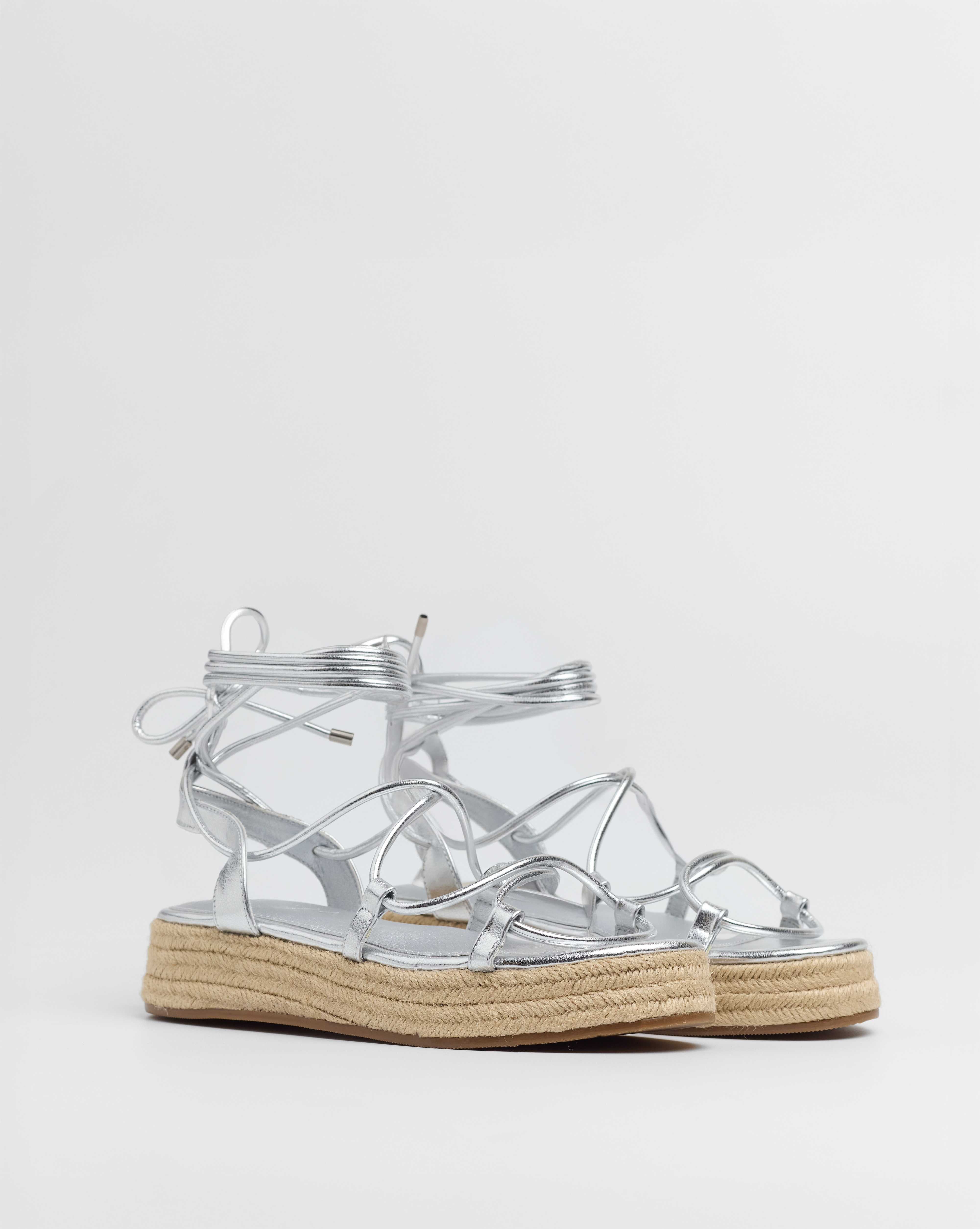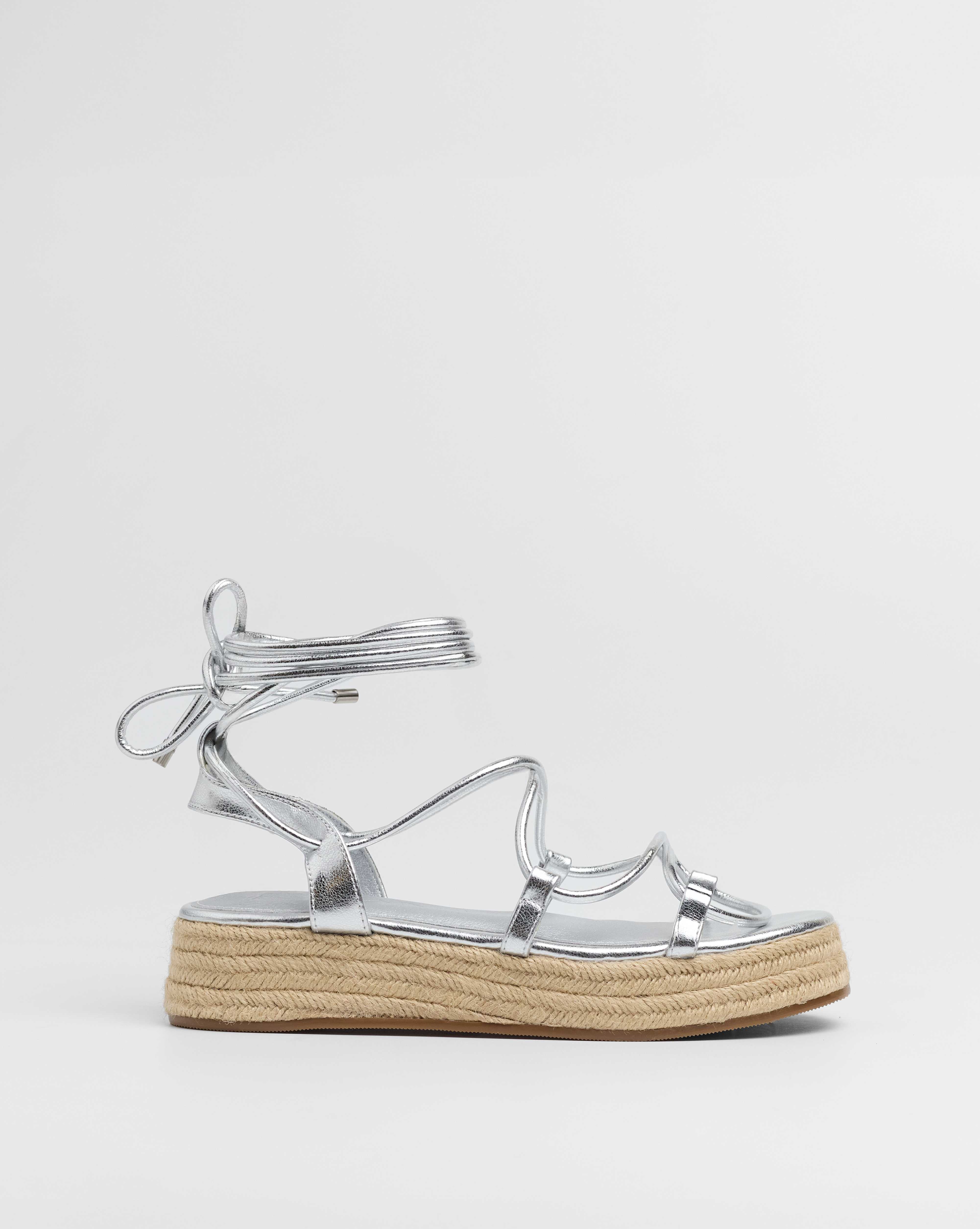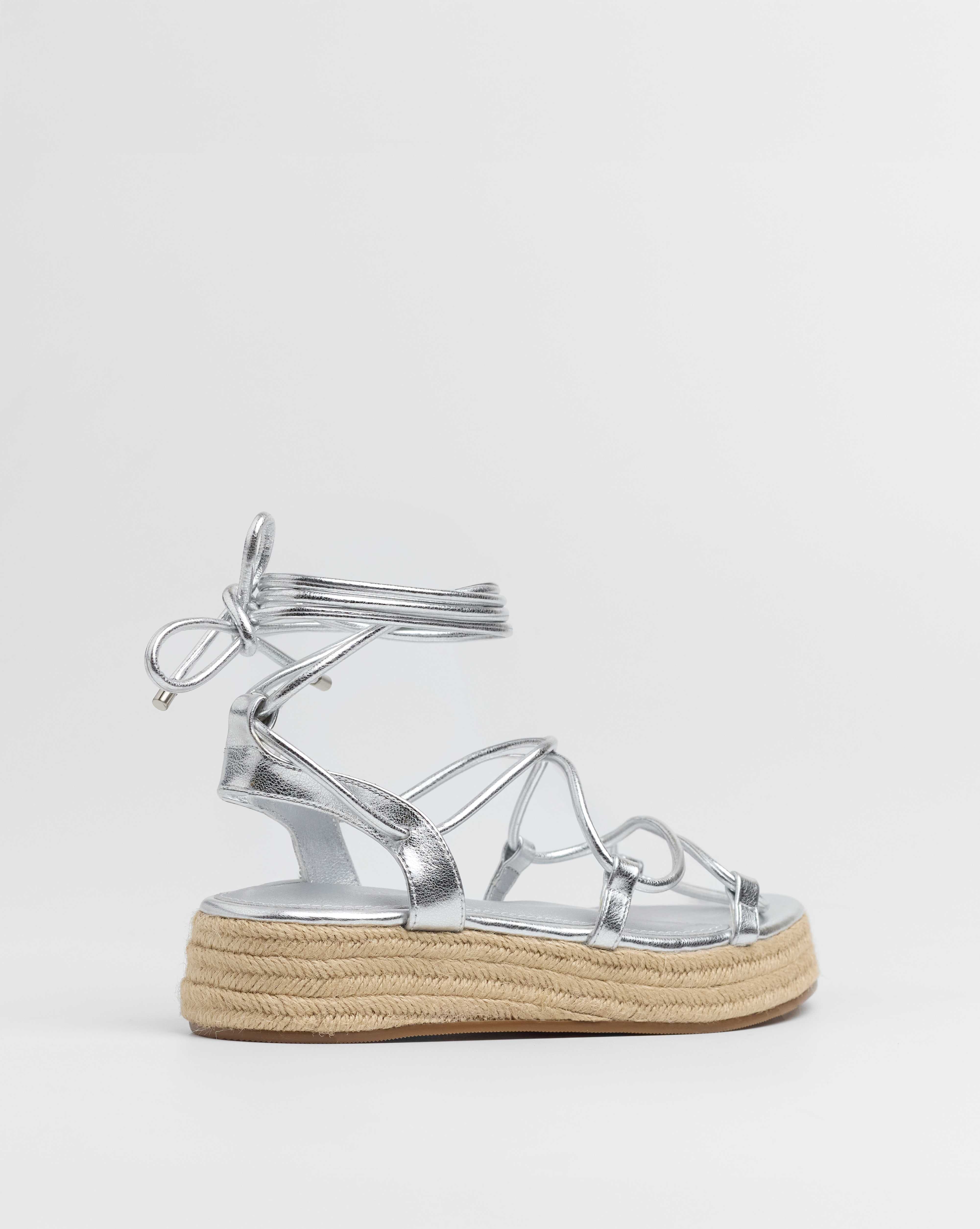Sandalia esparto con plataforma en color plata. Compuesto por varias tiras tubulares y cierre con tiras anudadas al tobillo.