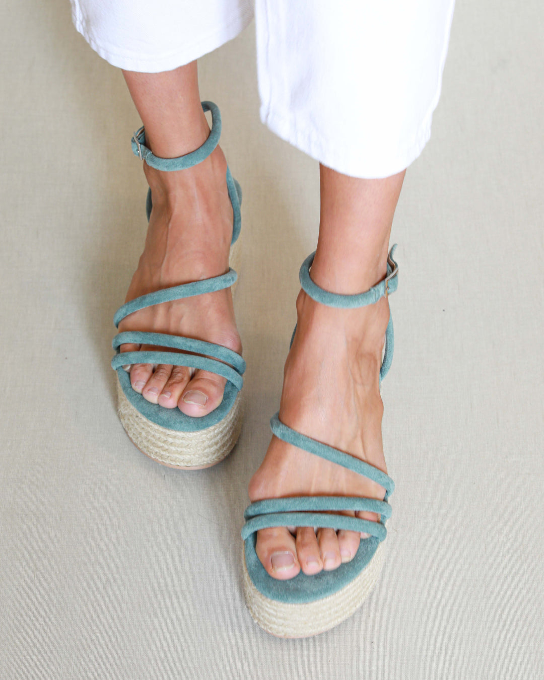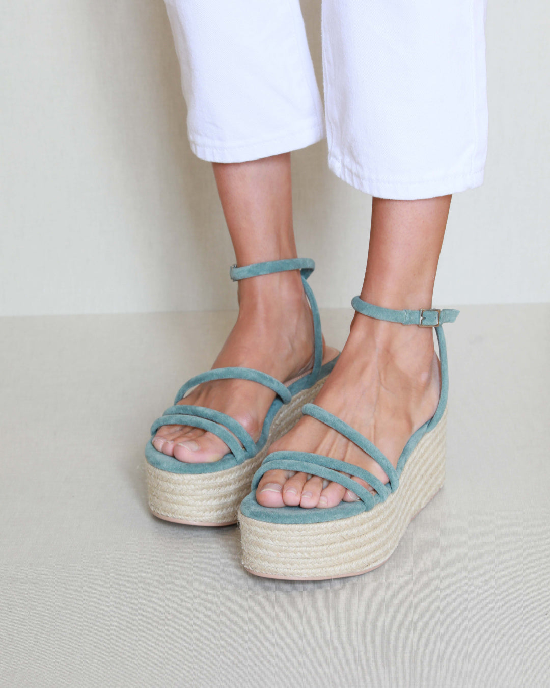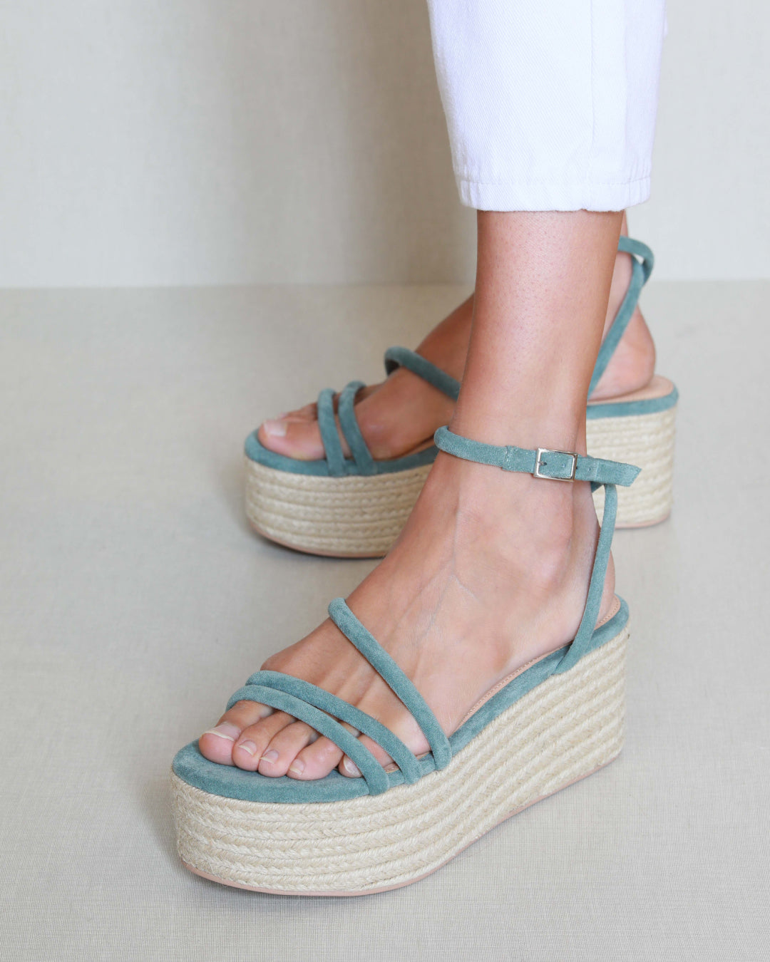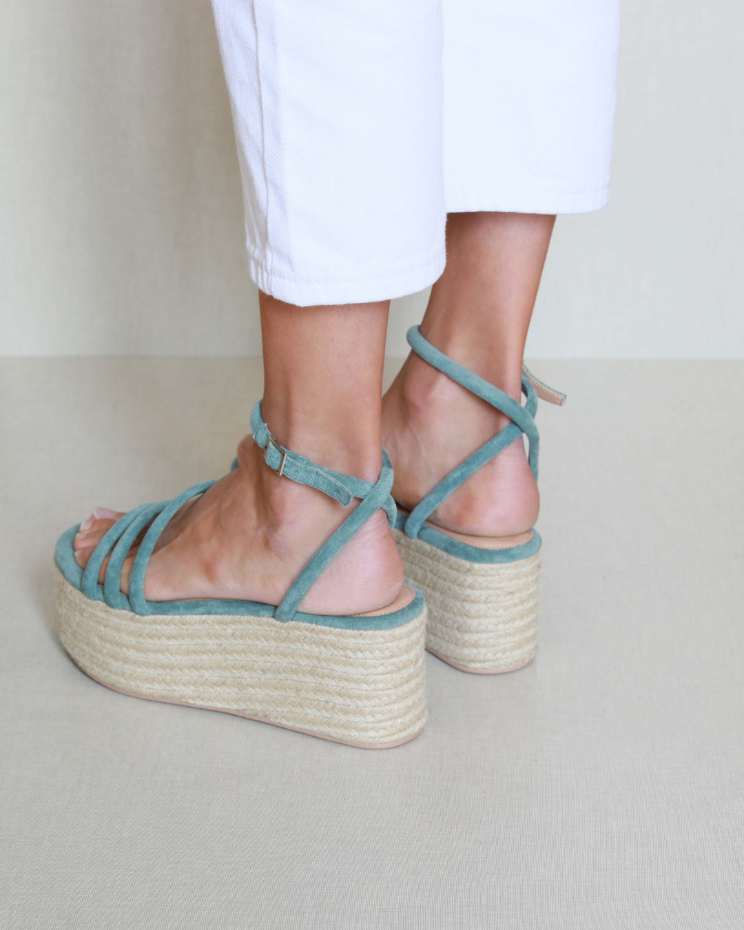 Sandalia de plataforma de esparto con tiras en ante vegano de color aguamarina en la parte superior y atadas al tobillo a modo de pulsera.