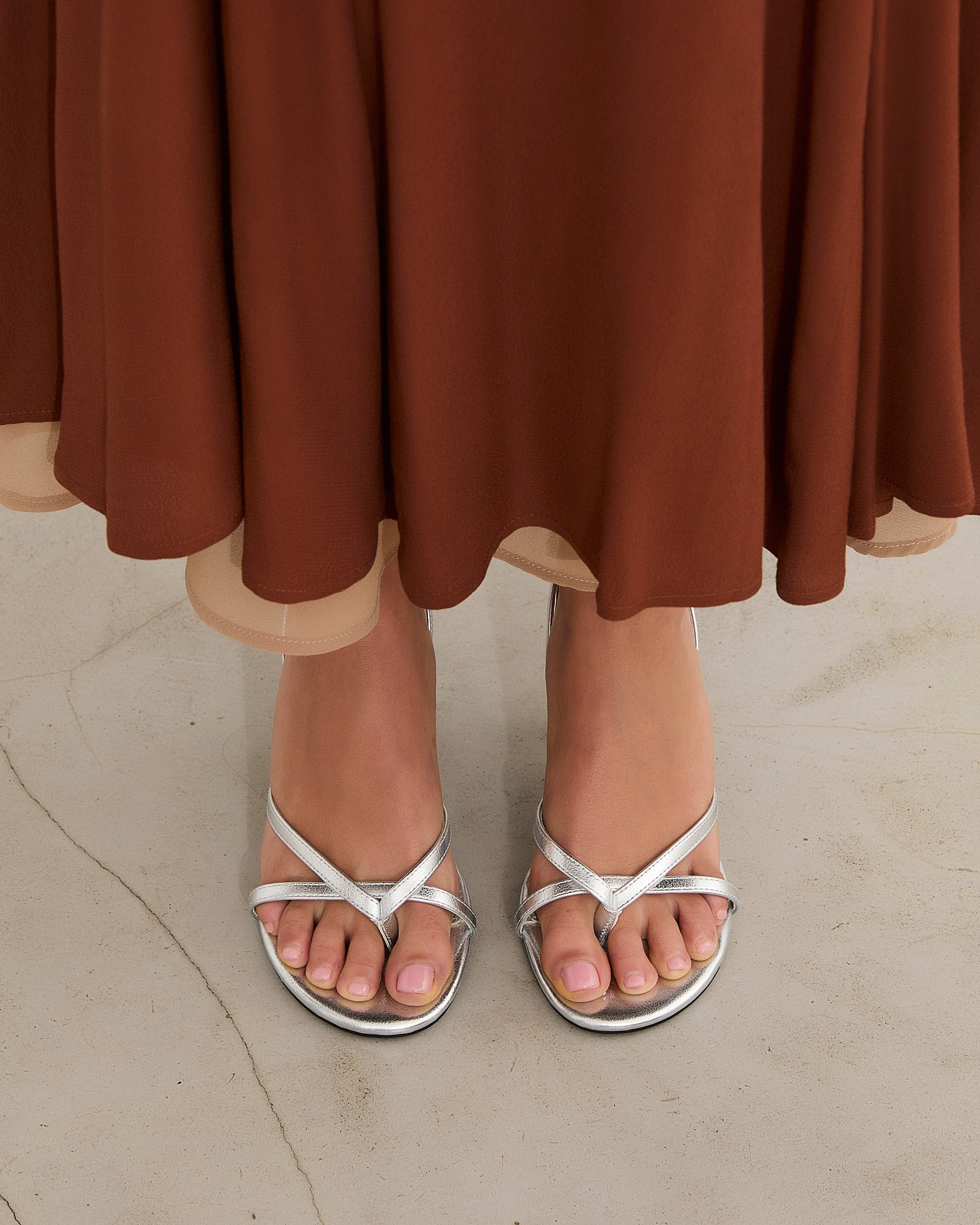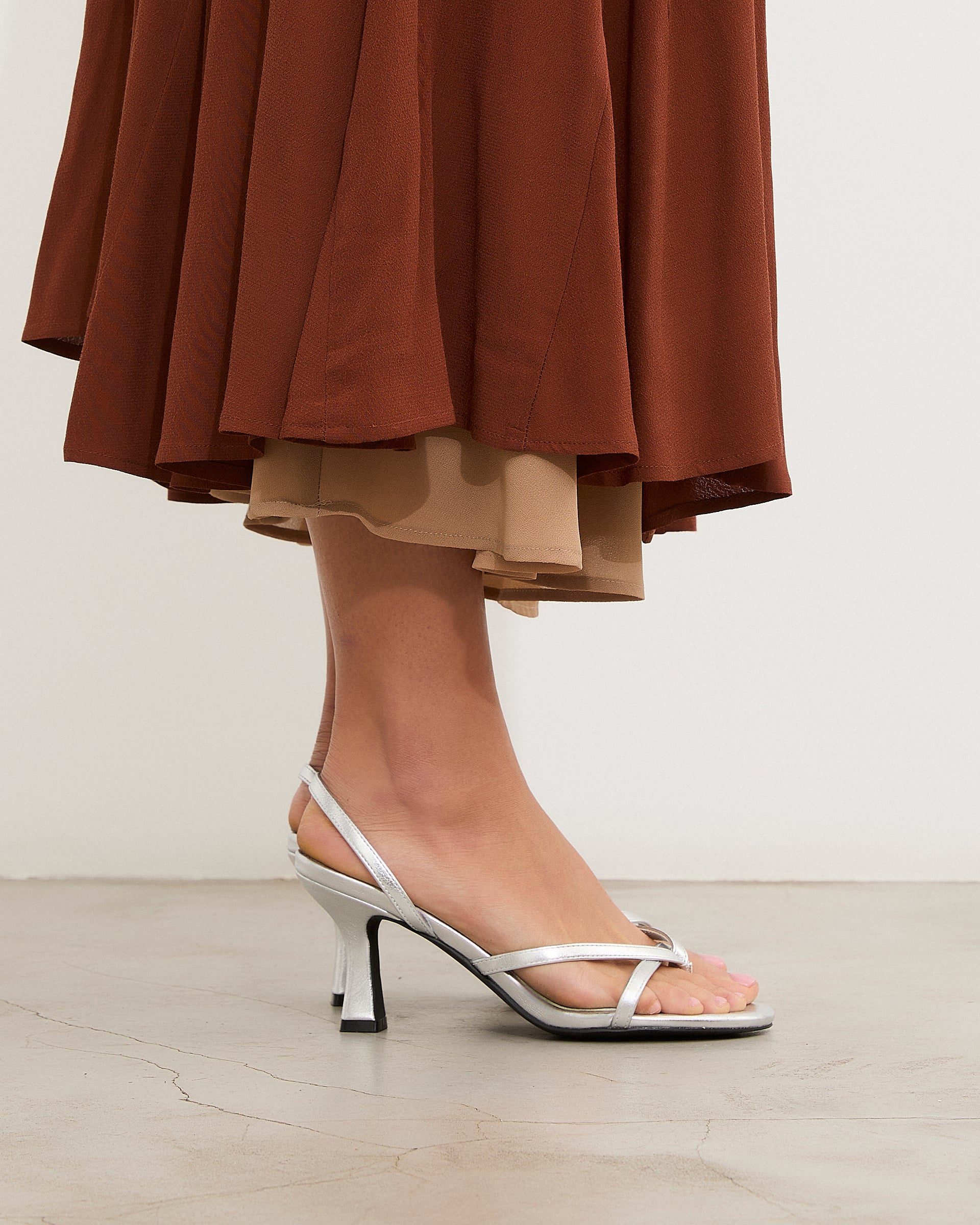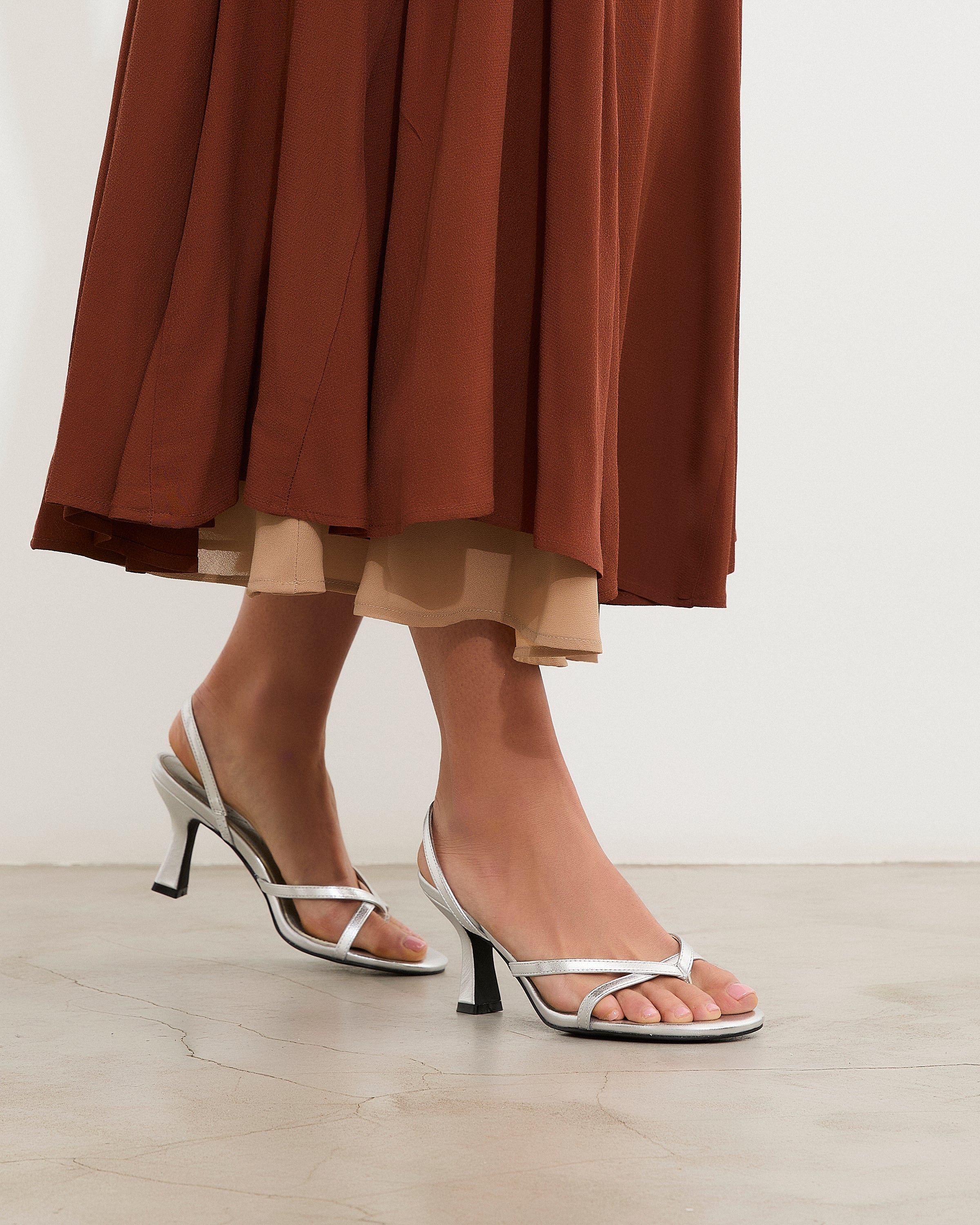 Sandalia de tacón con puntera redondeada en color plata. Tiras finas cruzadas en la parte delantera. Tira trasera con elástico para ajuste en talón. Tacón tipo aguja de base ancha.