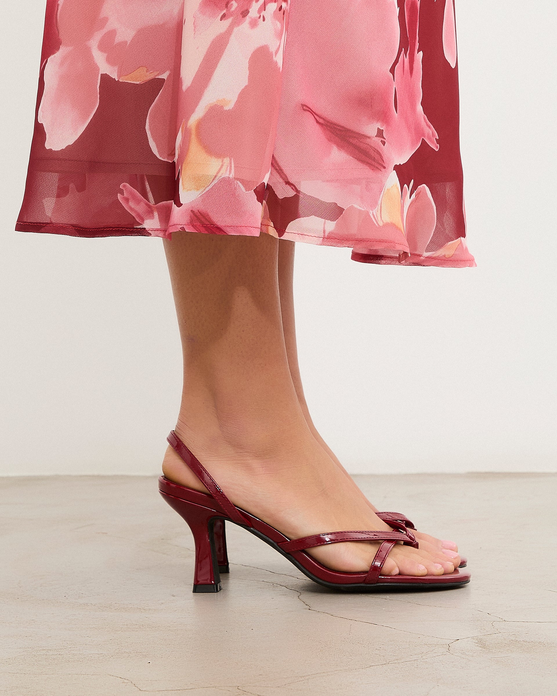 Sandalia de tacón con puntera redondeada en color rojo. Tiras finas cruzadas en la parte delanter. Tira trasera con elástico para ajuste en talón. Tacón tipo aguja de base ancha.
