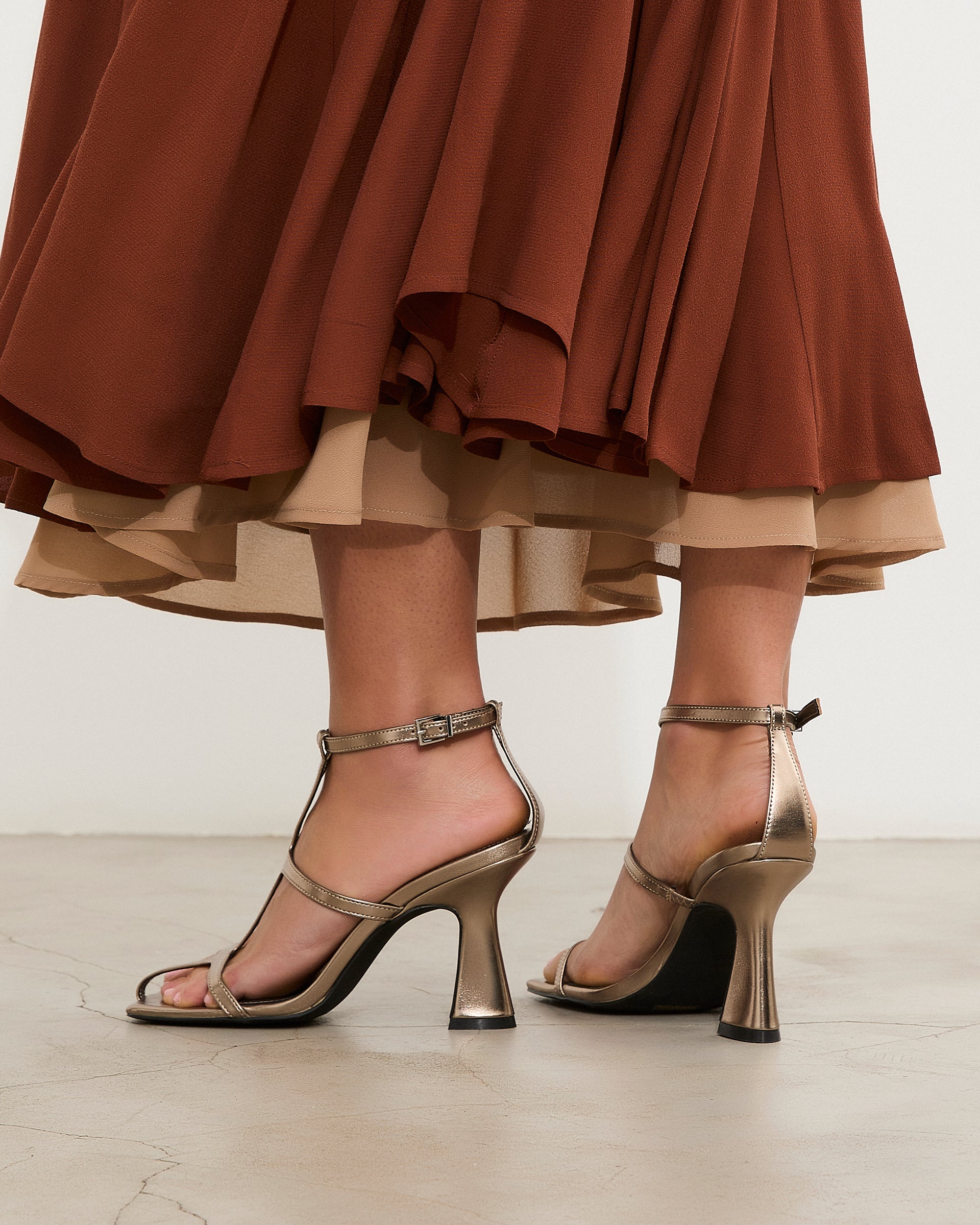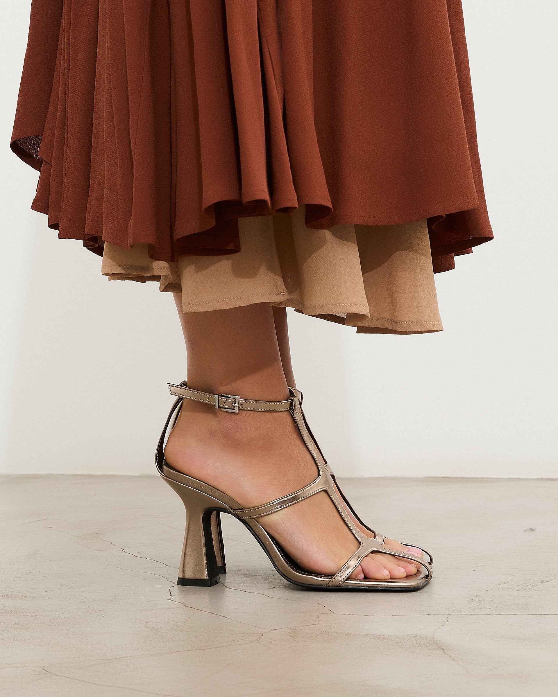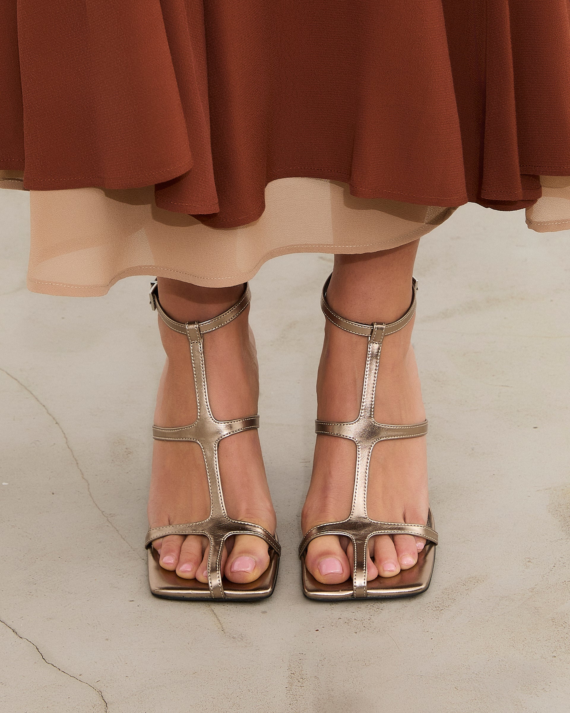 Sandalia de tacón en color metalizado con puntera cuadrada. Composión de las tiras estilo romana con cierre en tobillo con hebilla. Tacón tipo aguja de base ancha.