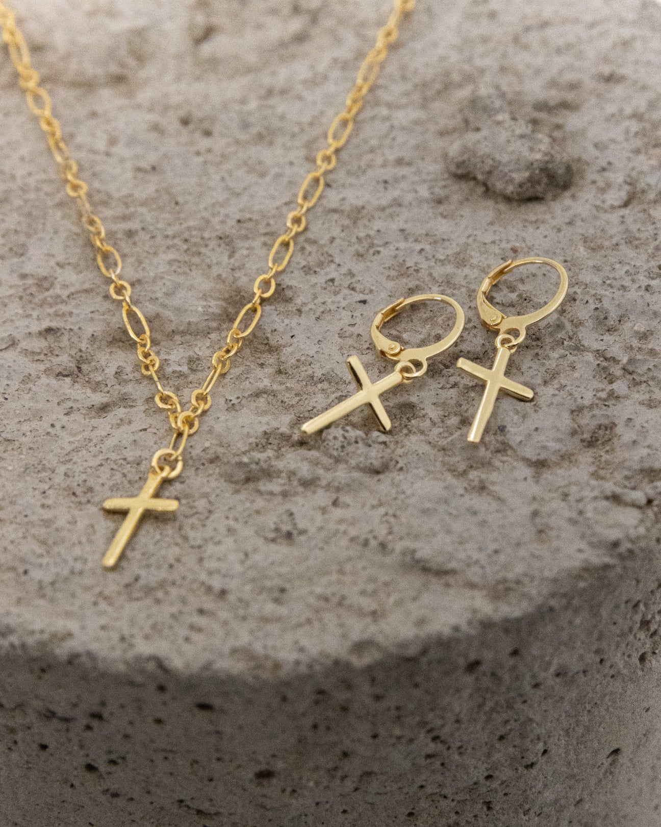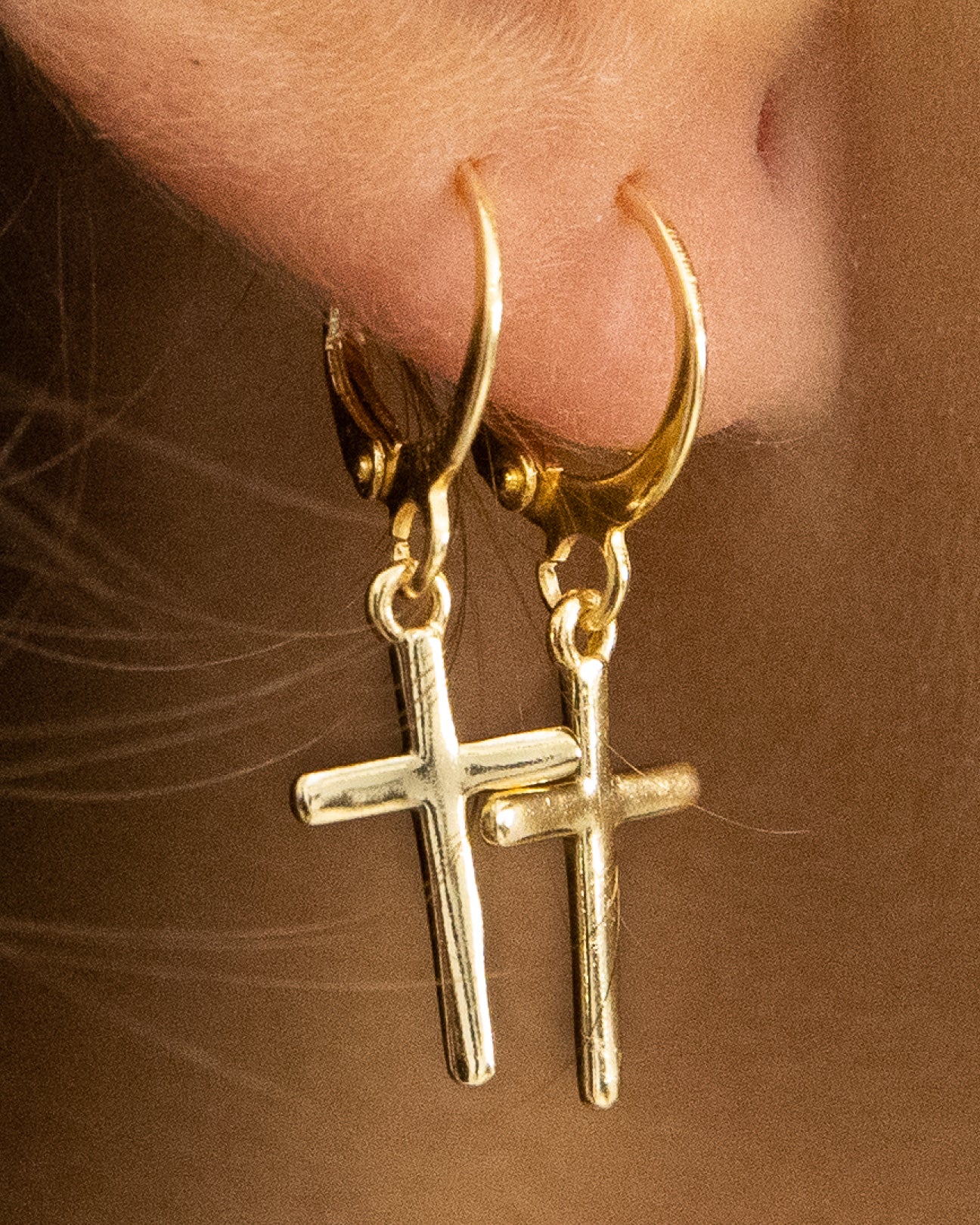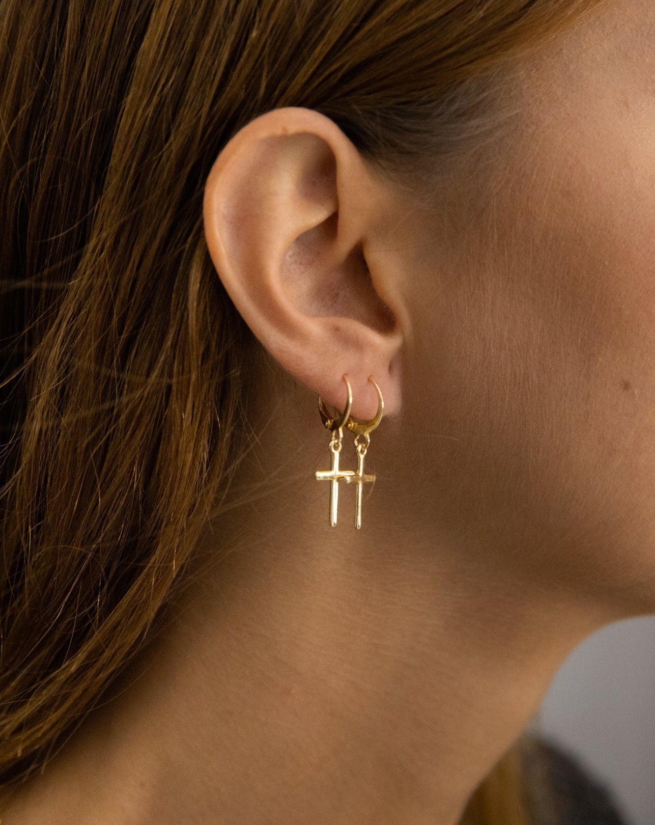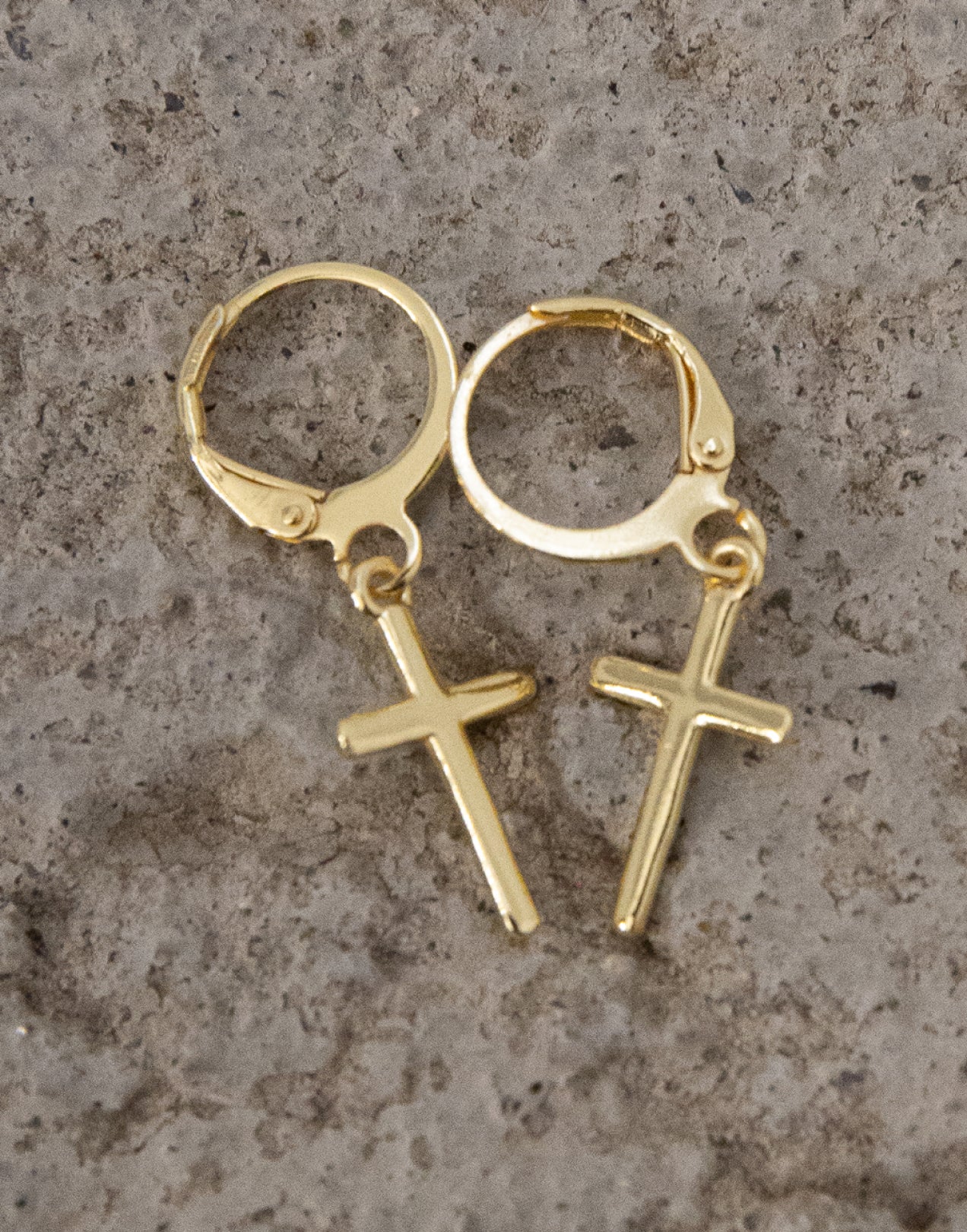 Pendientes de aro pequeño en dorado con cruces colgantes en el mismo material. Cierre fácil con clip.