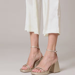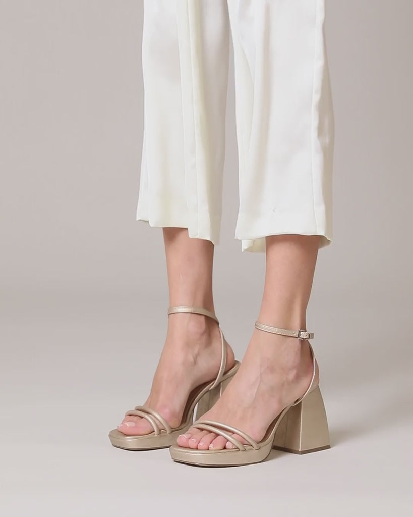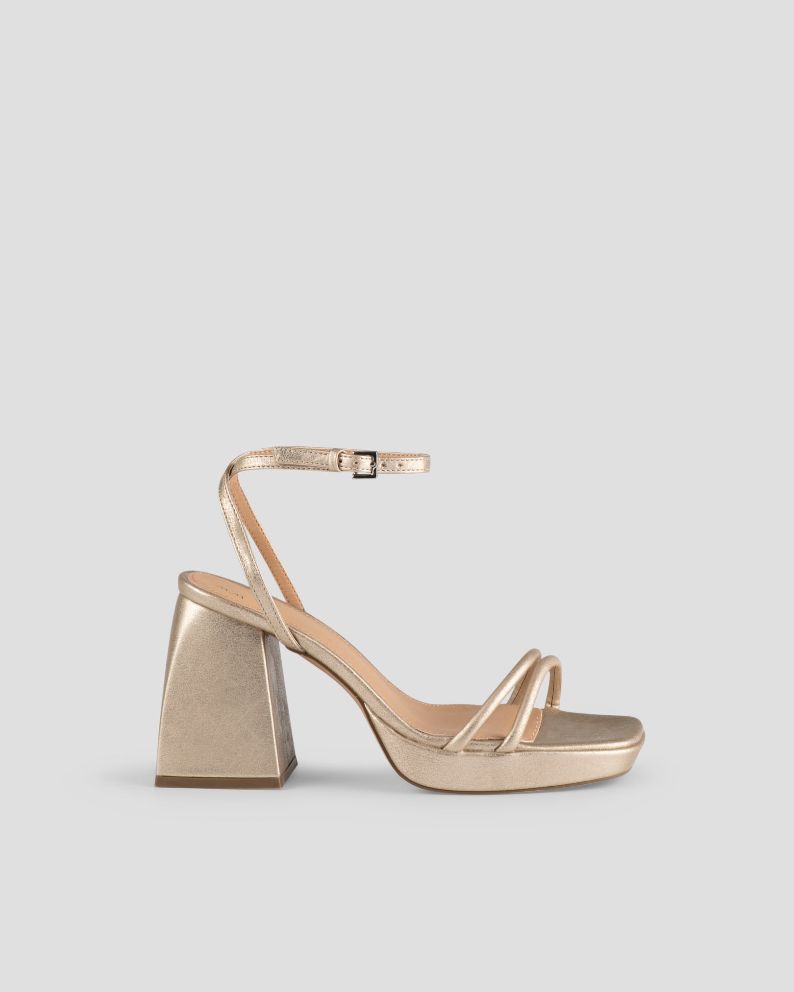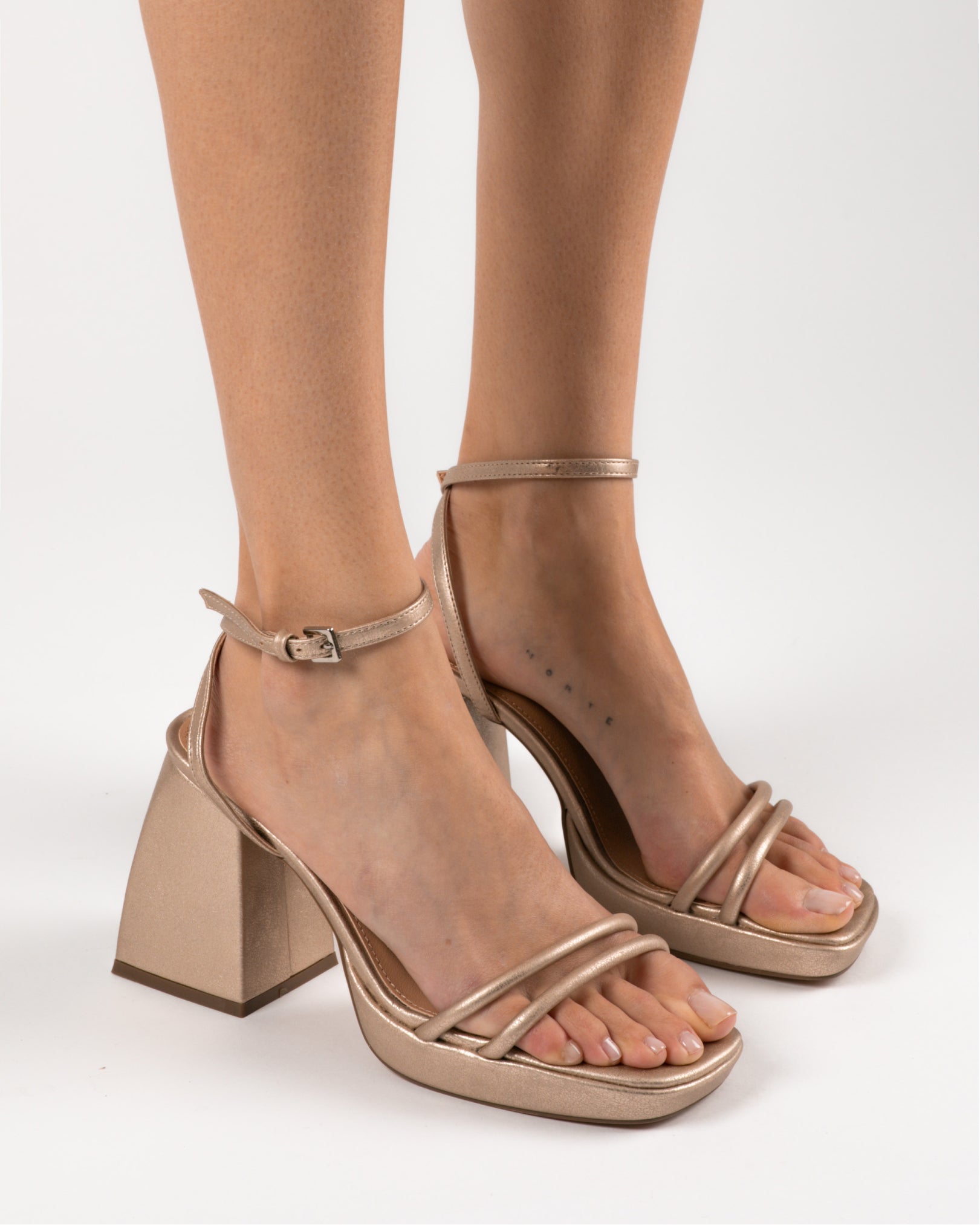 Sandalia de tacón en piel vegana color dorado. Parte delantera abierta cuadrada con plataforma y dos tiras simétricas delanteras. Cierre de pulsera al tobillo con hebilla metálica.
