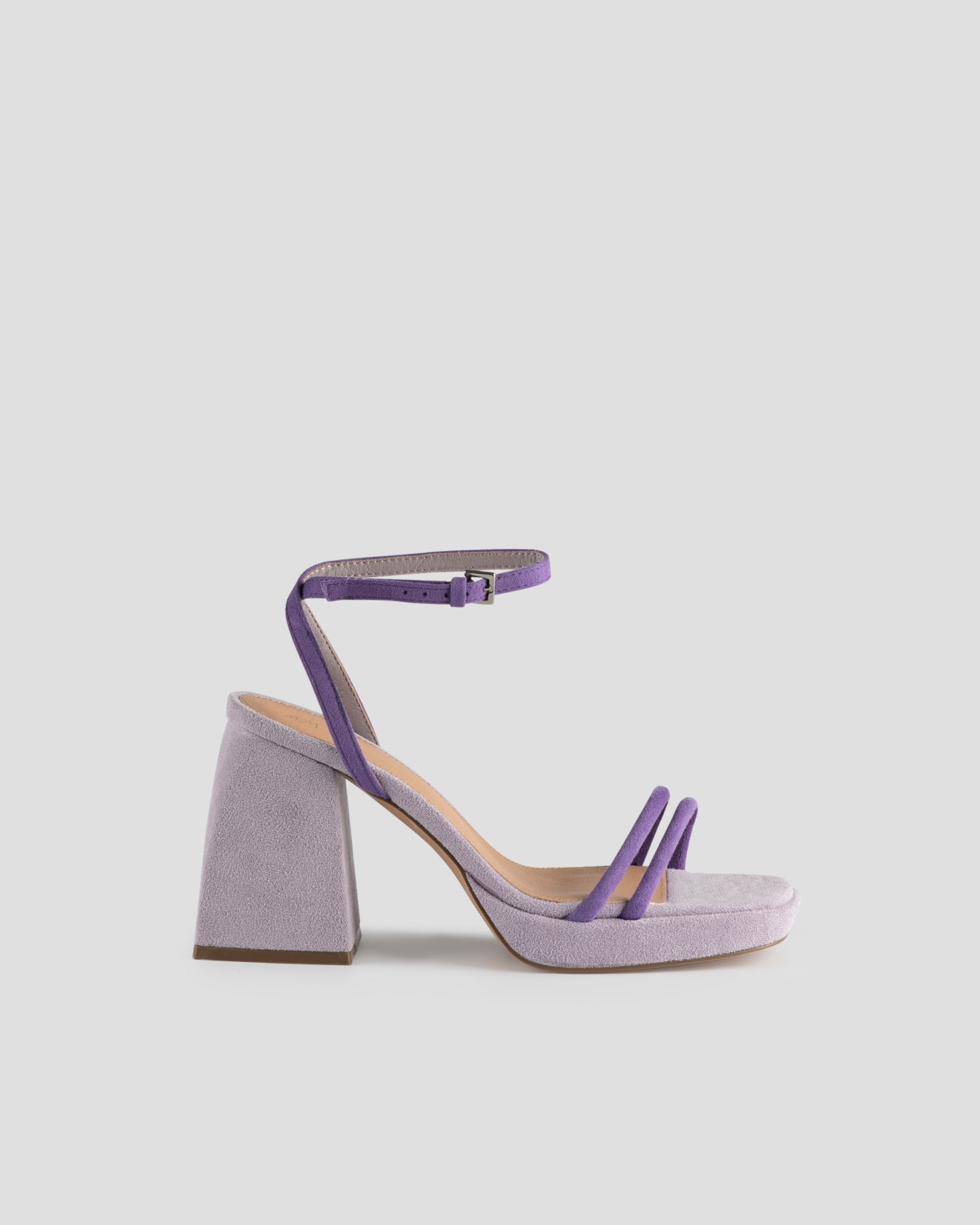 Sandalia de tacón en ante vegano color malva. Parte delantera abierta cuadrada con plataforma y dos tiras simétricas delanteras. Cierre de pulsera al tobillo con hebilla metálica.
