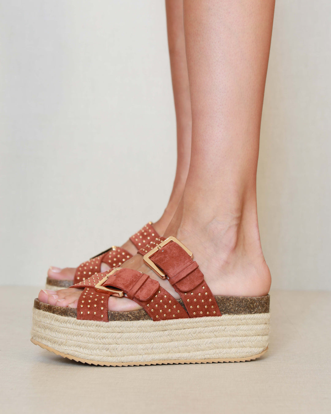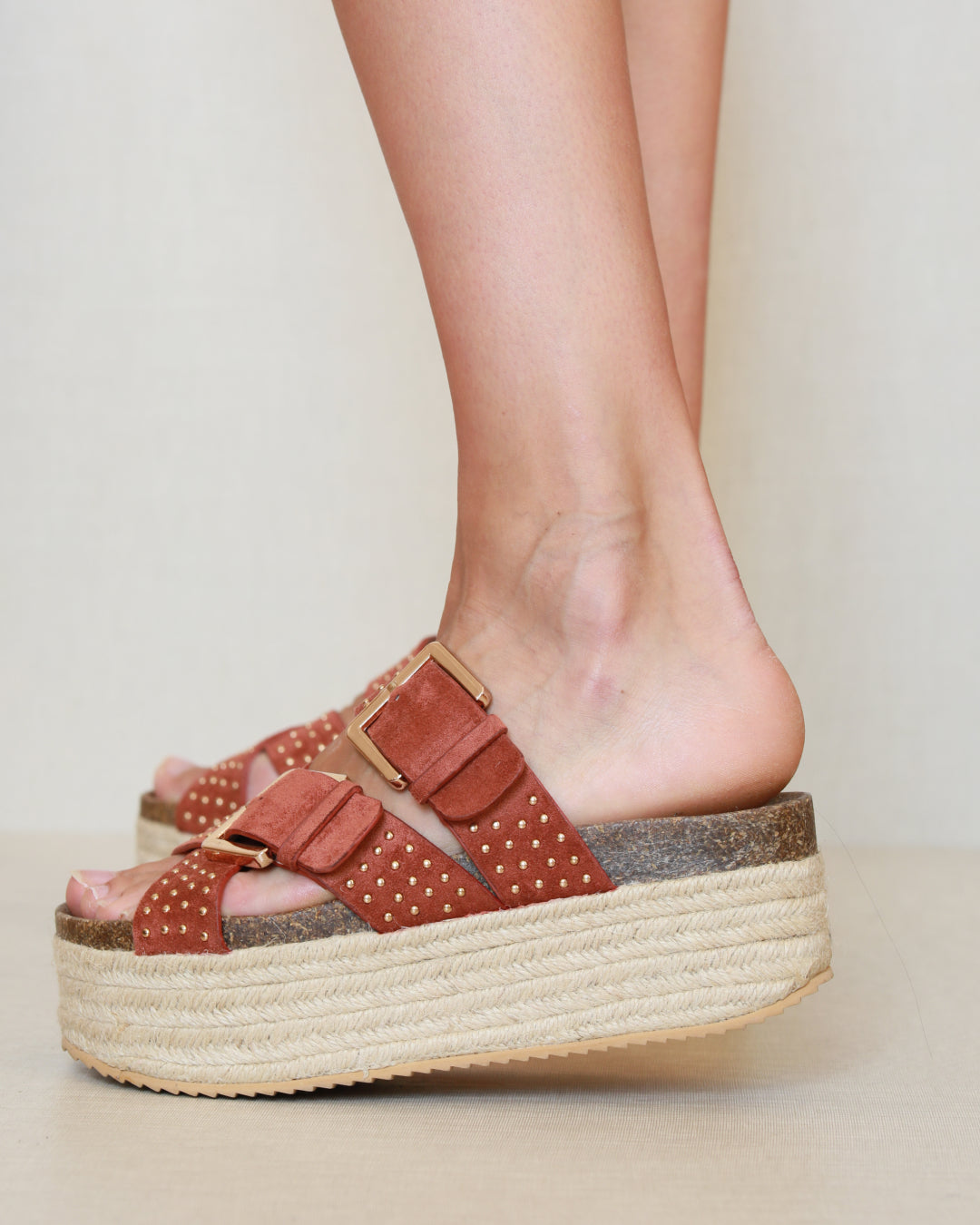 Sandalia con plataforma de esparto y recubrimiento de corcho en la parte superior de esta. Dos tiras cruzadas en ante vegano con cierre de hebilla en la parte delantera y una tira horizontal con hebilla en la parte trasera. Detalles de tachuelas doradas en las tiras.