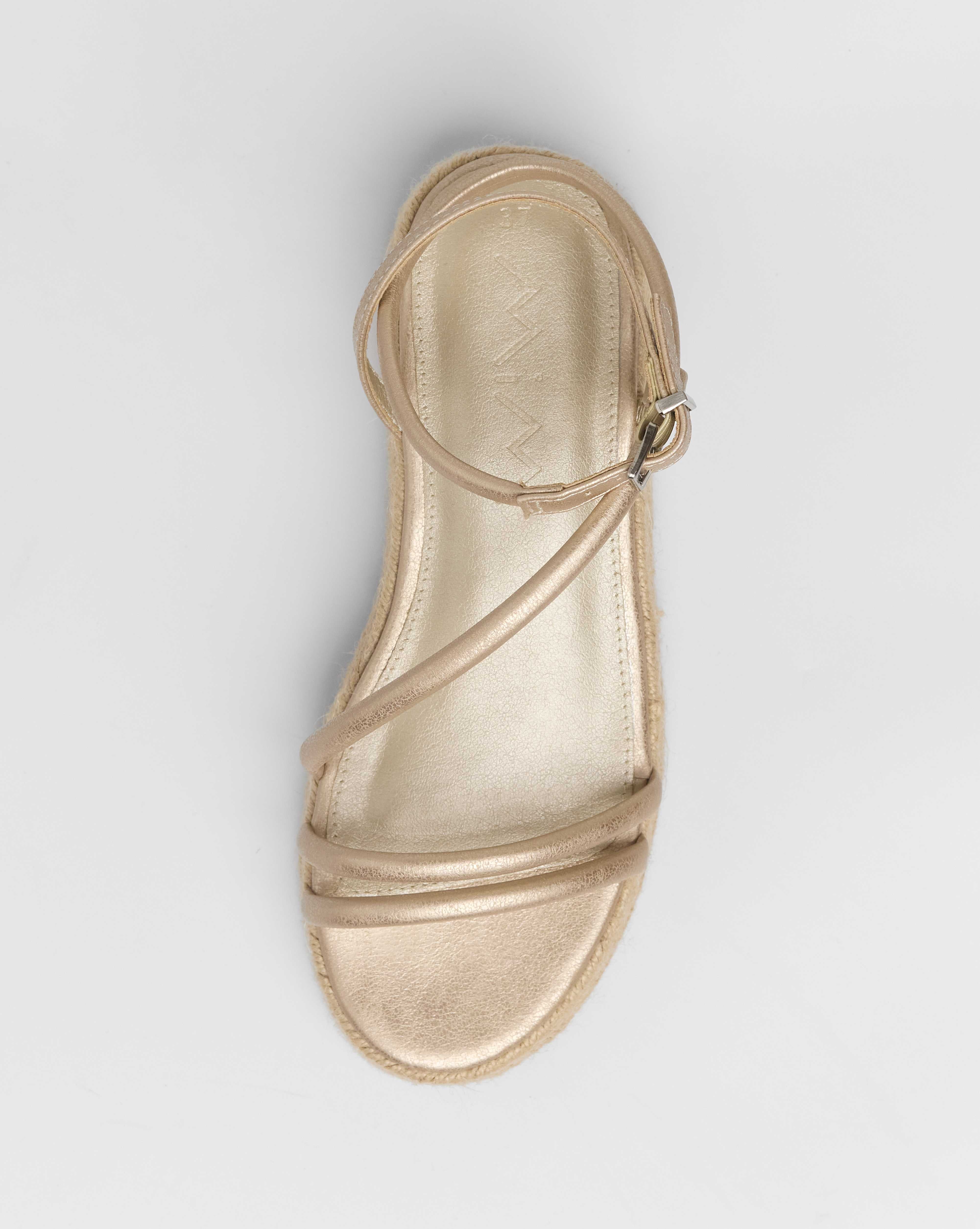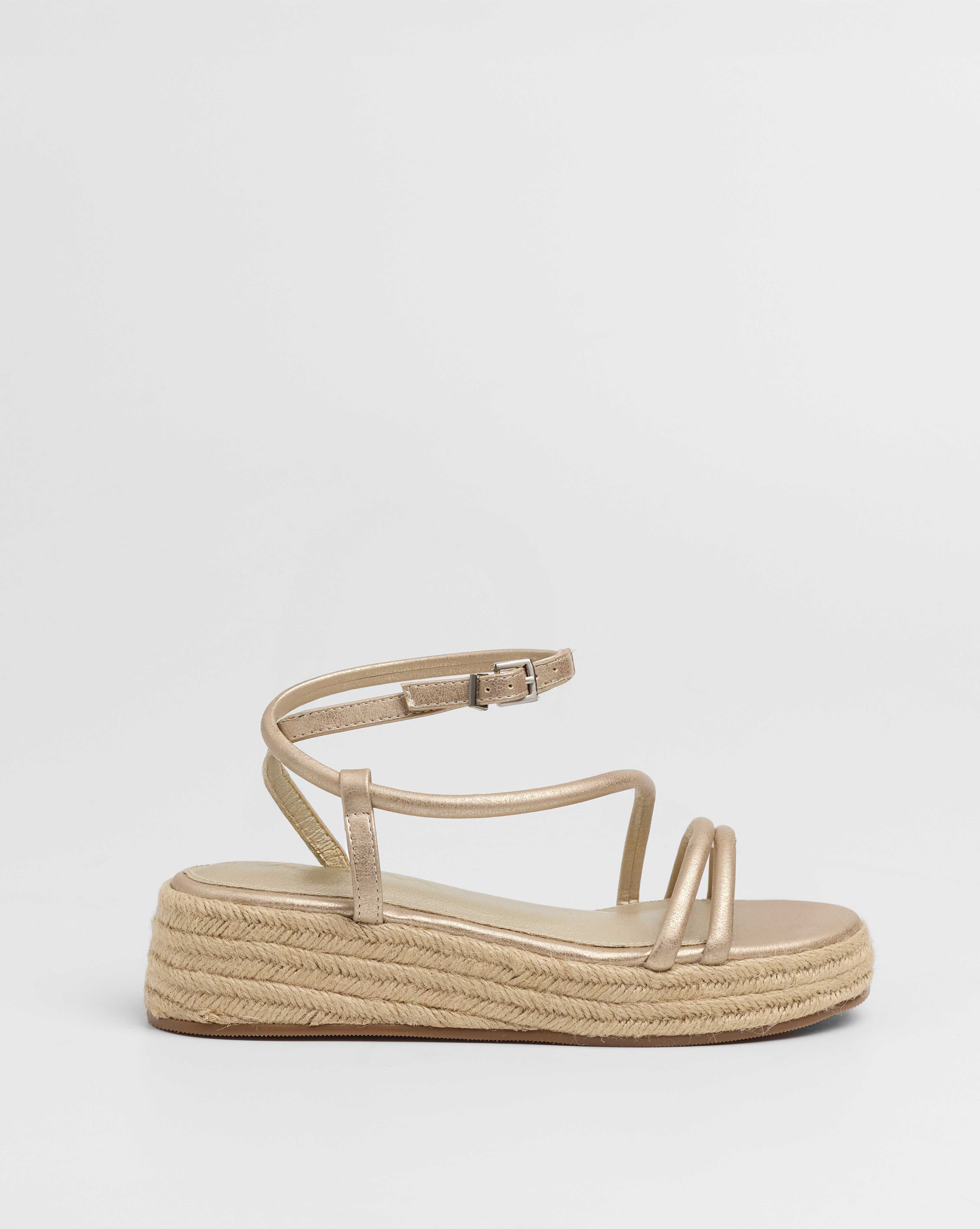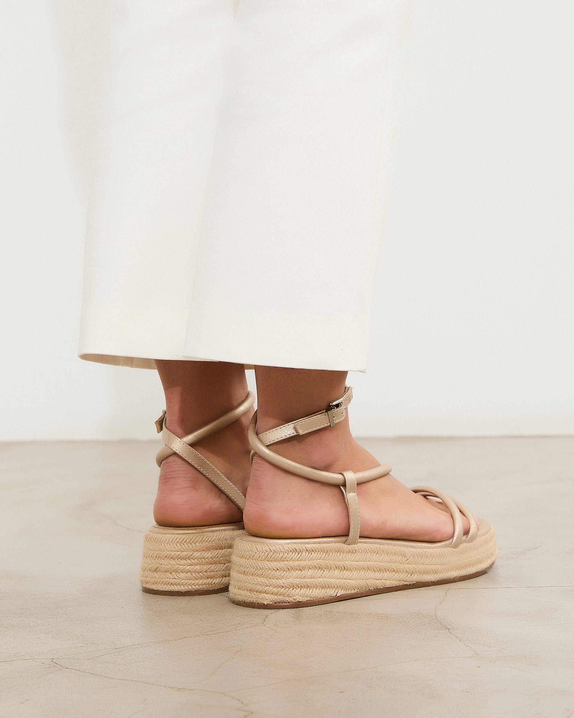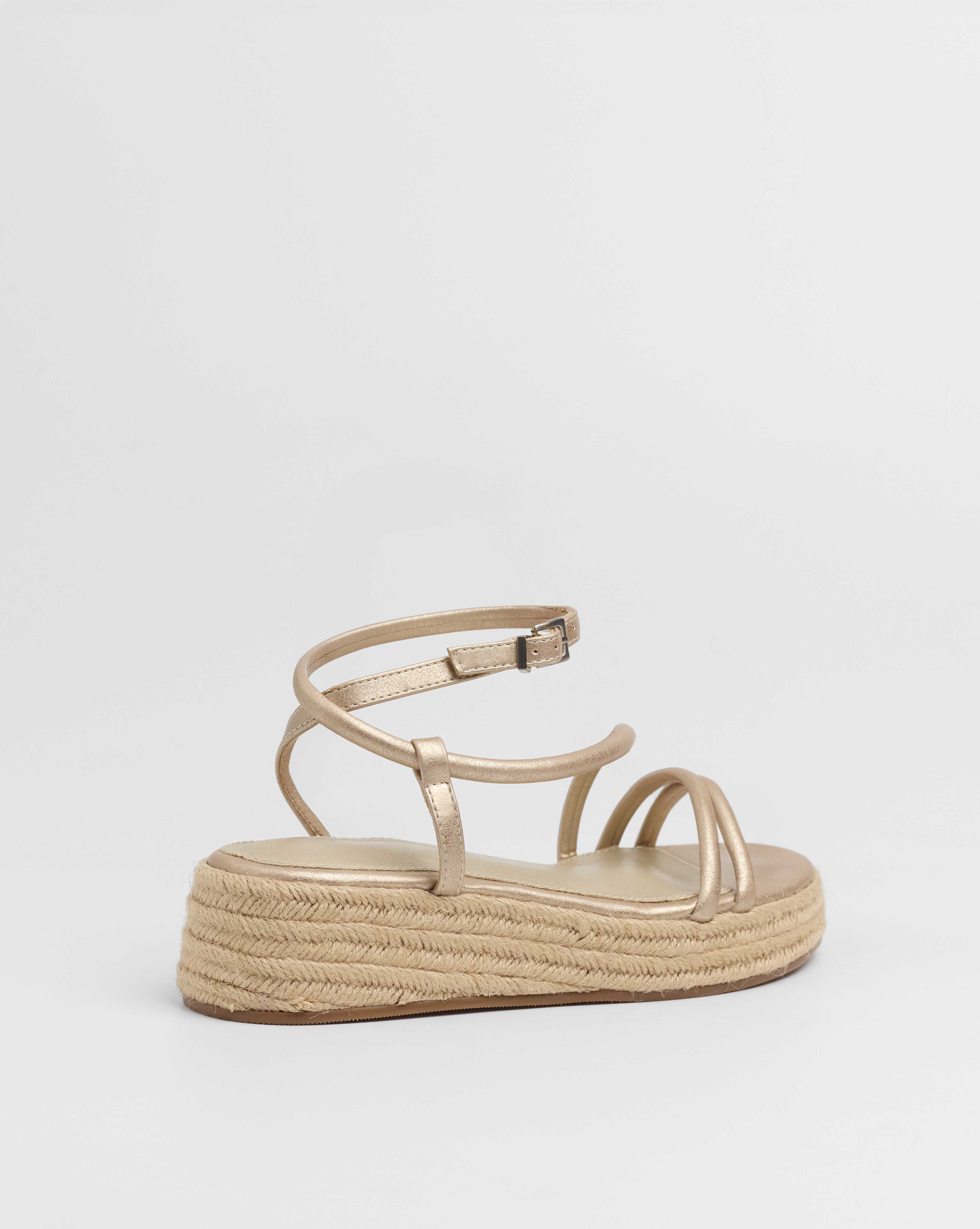 Sandalia de plataforma baja en esparto. Dos tiras en la parte delantera y tira fina alrededor del tobillo en piel vegana color dorado. Cierre con hebilla.