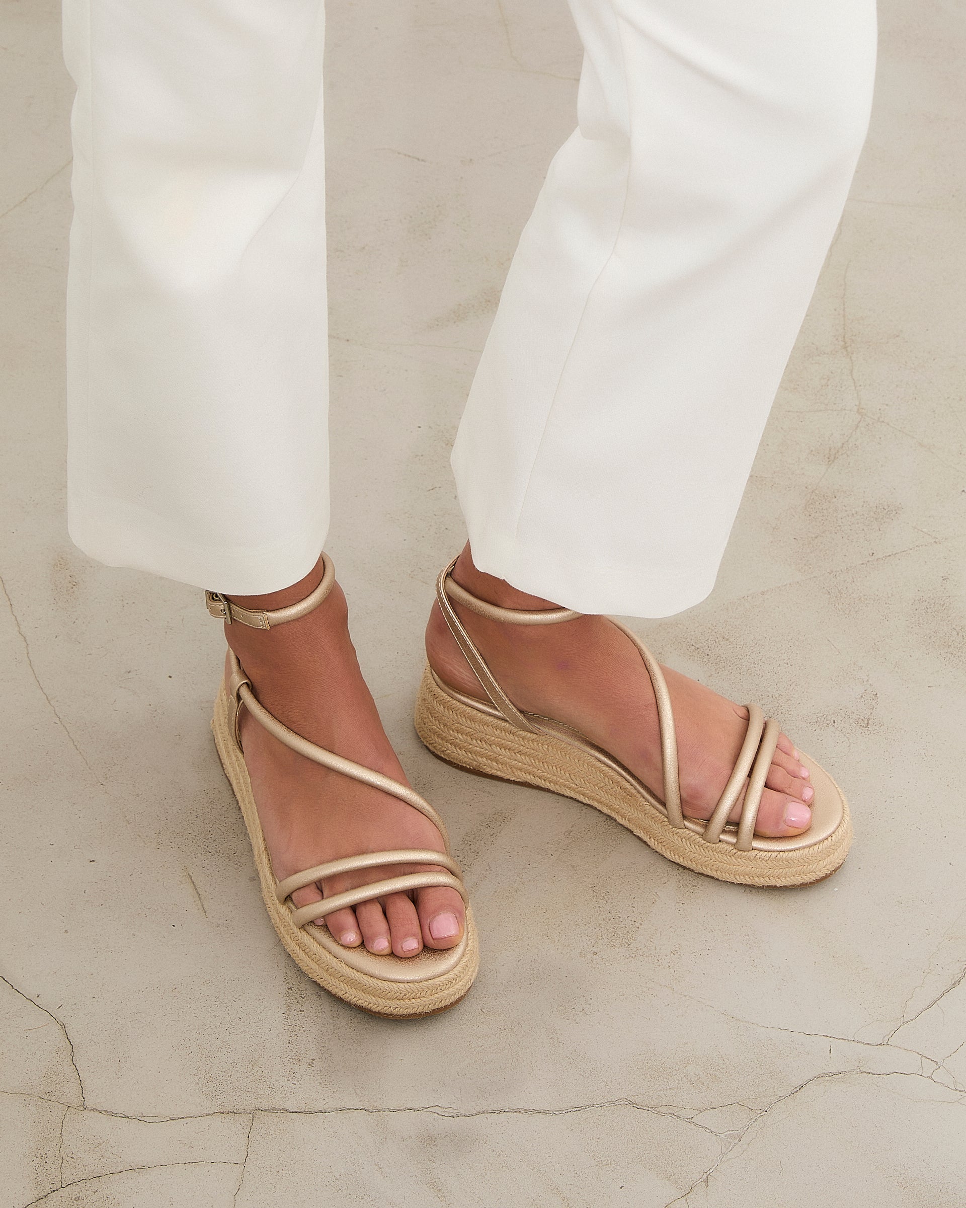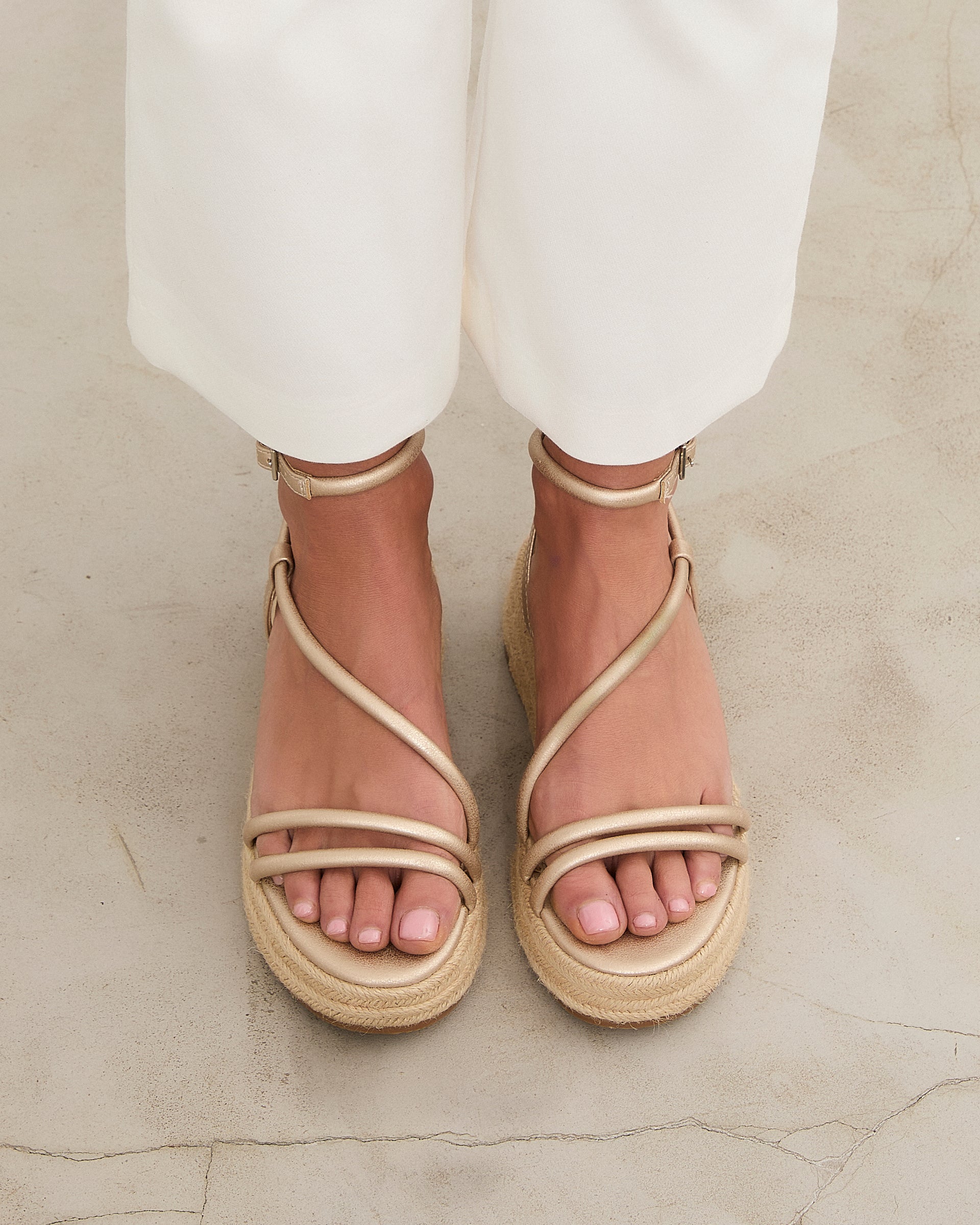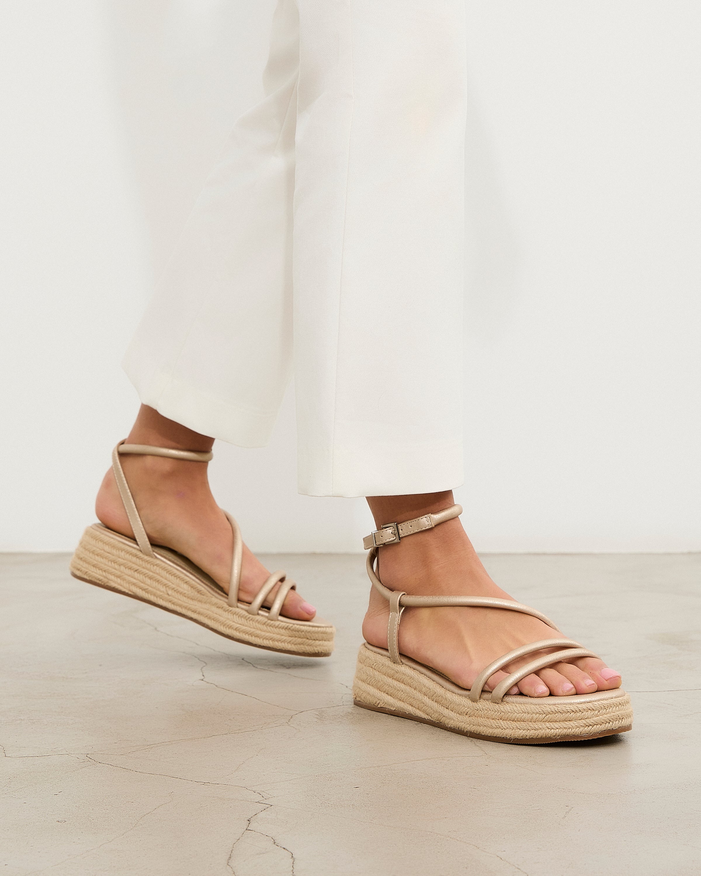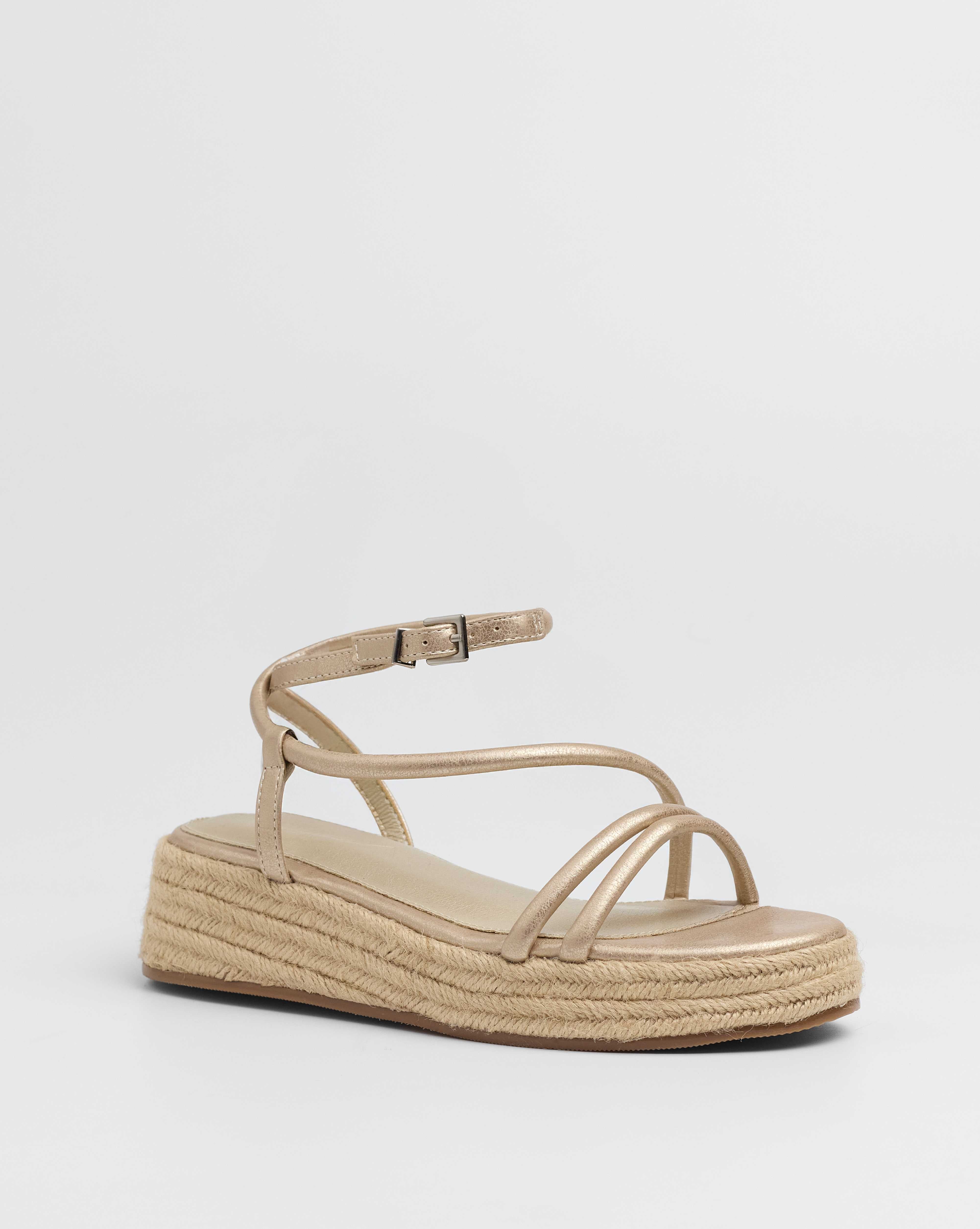Sandalia de plataforma baja en esparto. Dos tiras en la parte delantera y tira fina alrededor del tobillo en piel vegana color dorado. Cierre con hebilla.