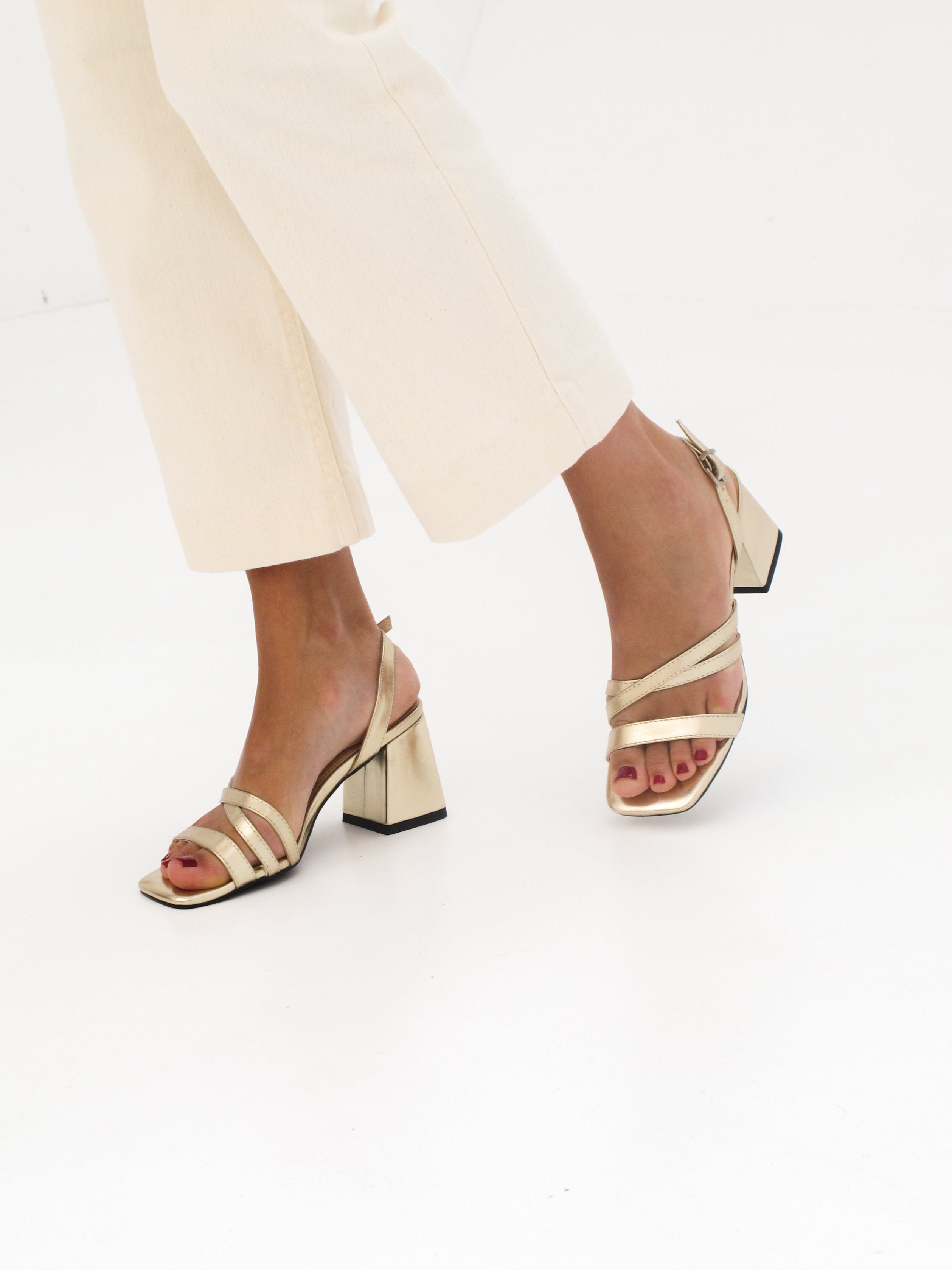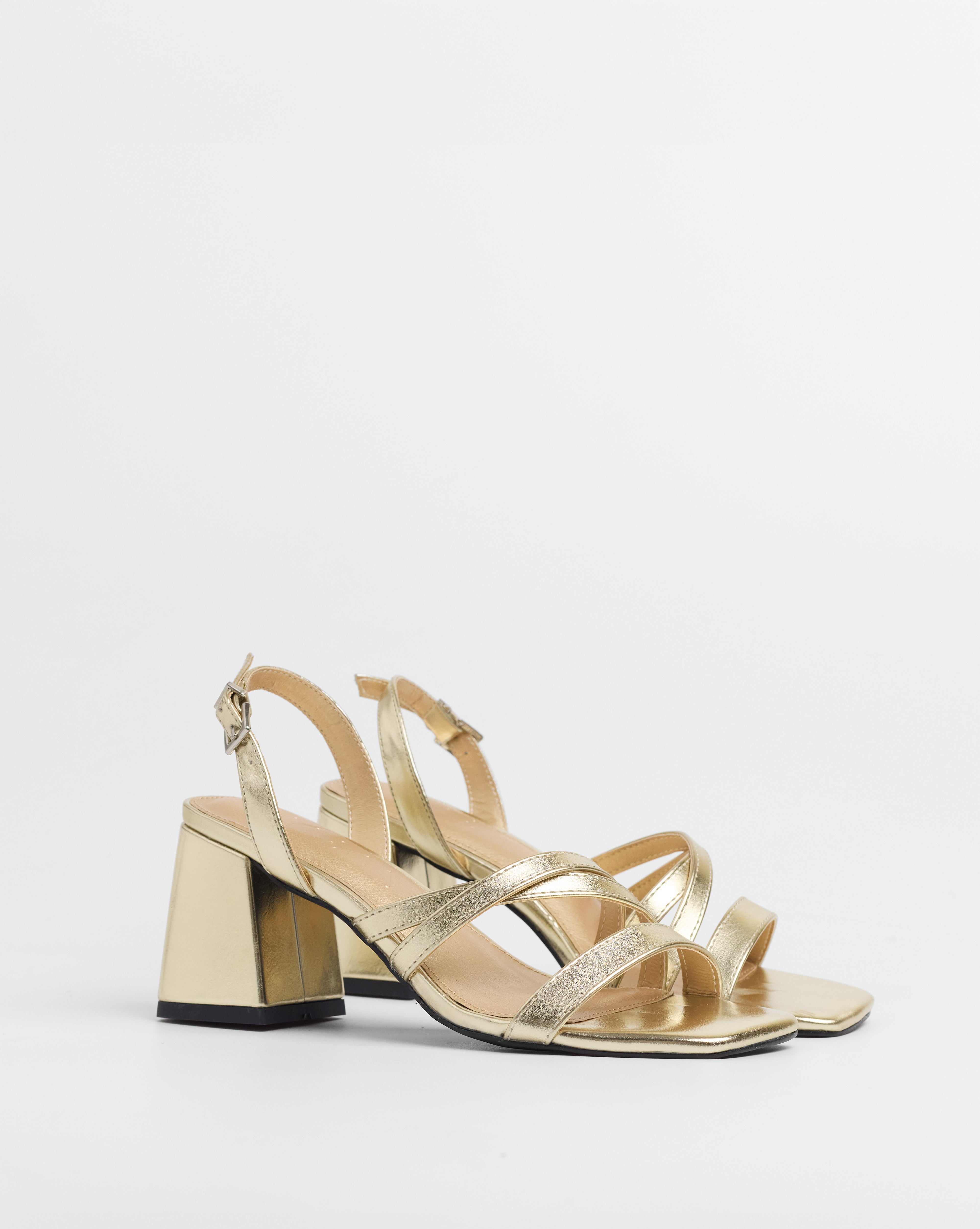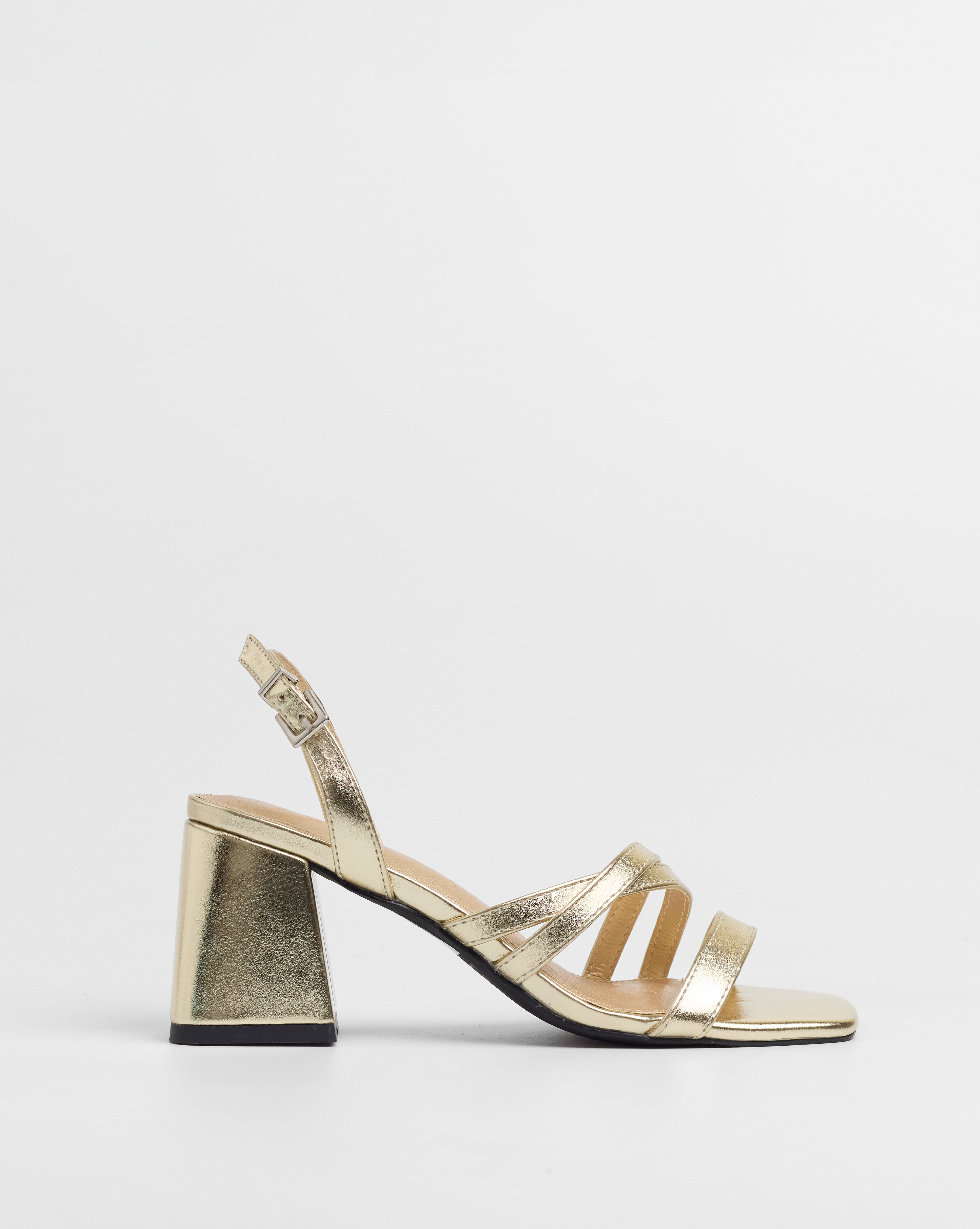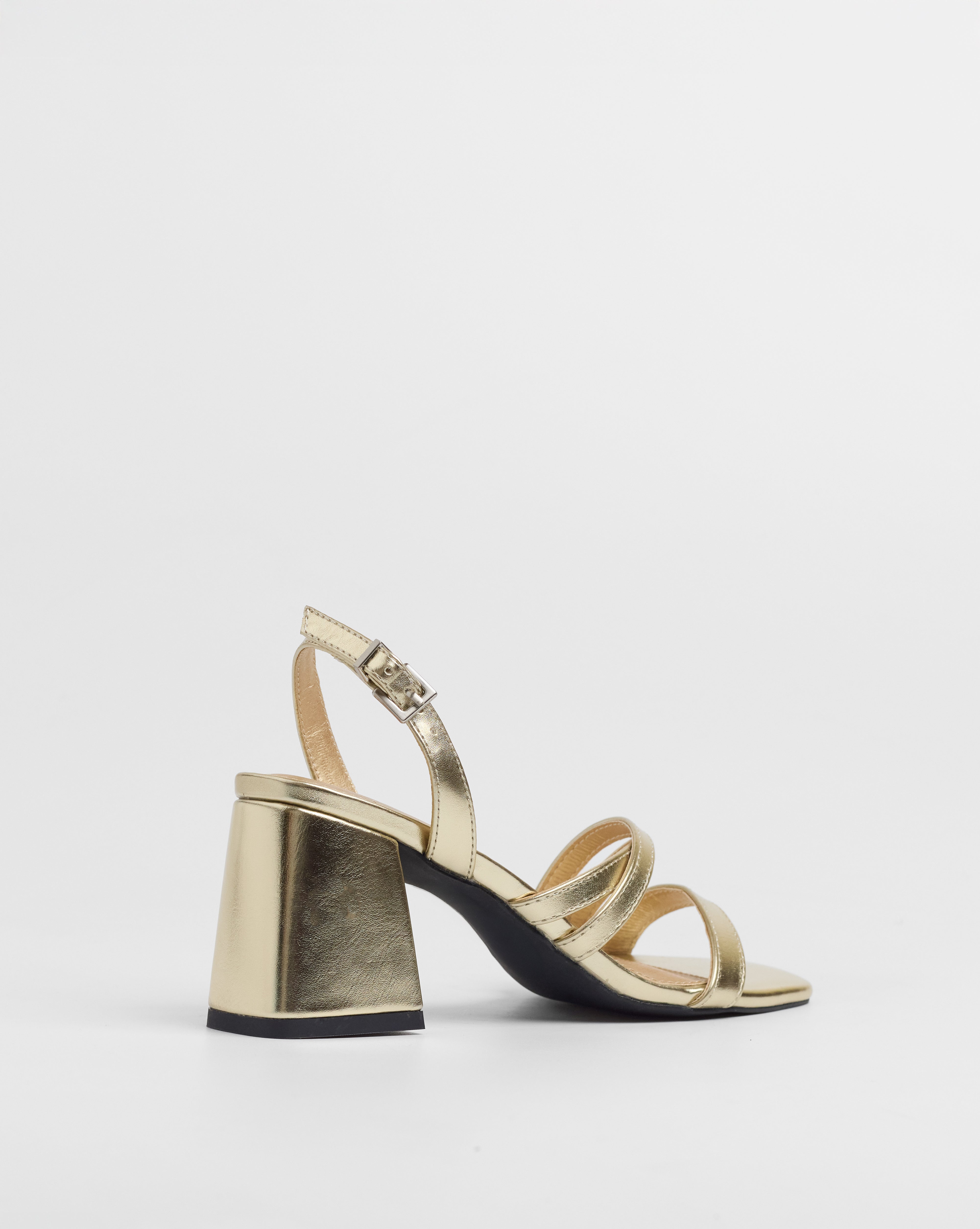 Sandalia de tacón en color dorado brillante. Parte delantera abierta con varias tiras. Tacón cuadrado. Cierre con tira al talón con hebilla metálica.