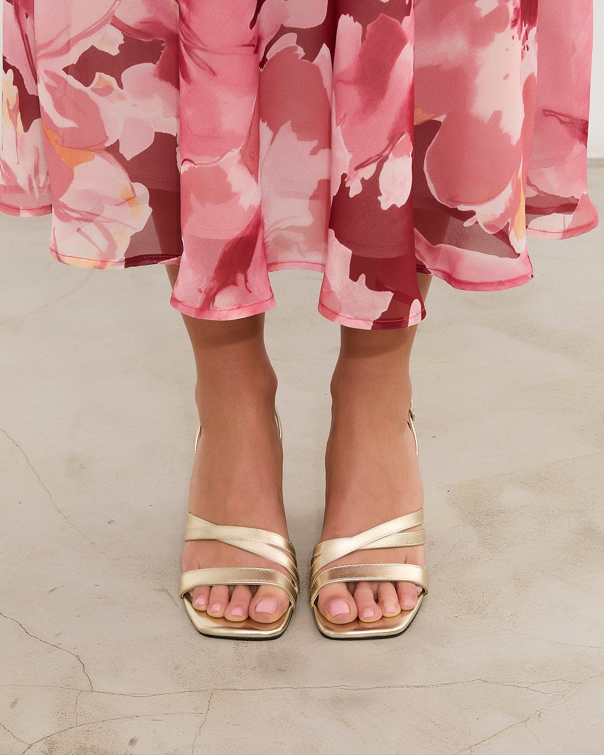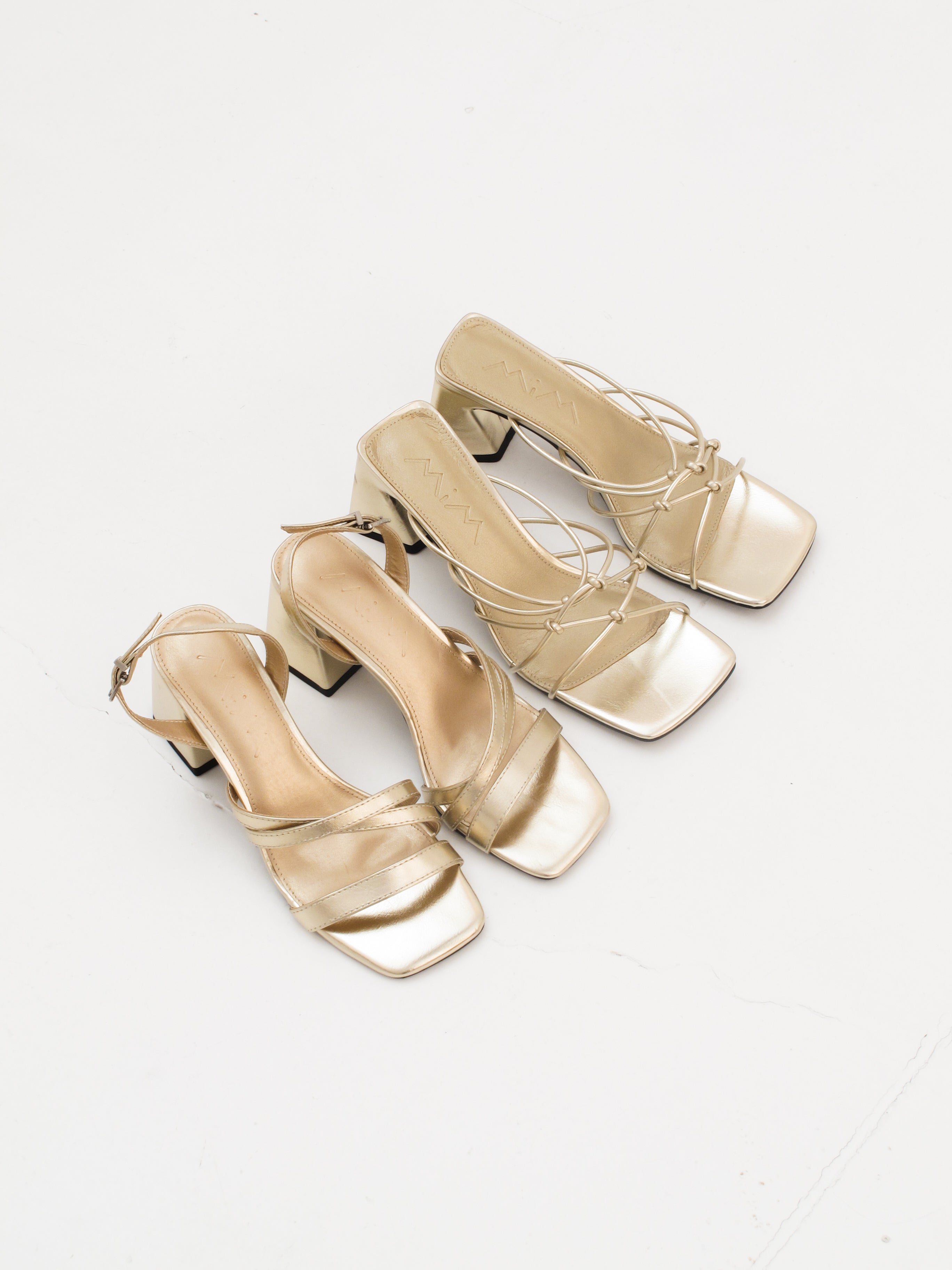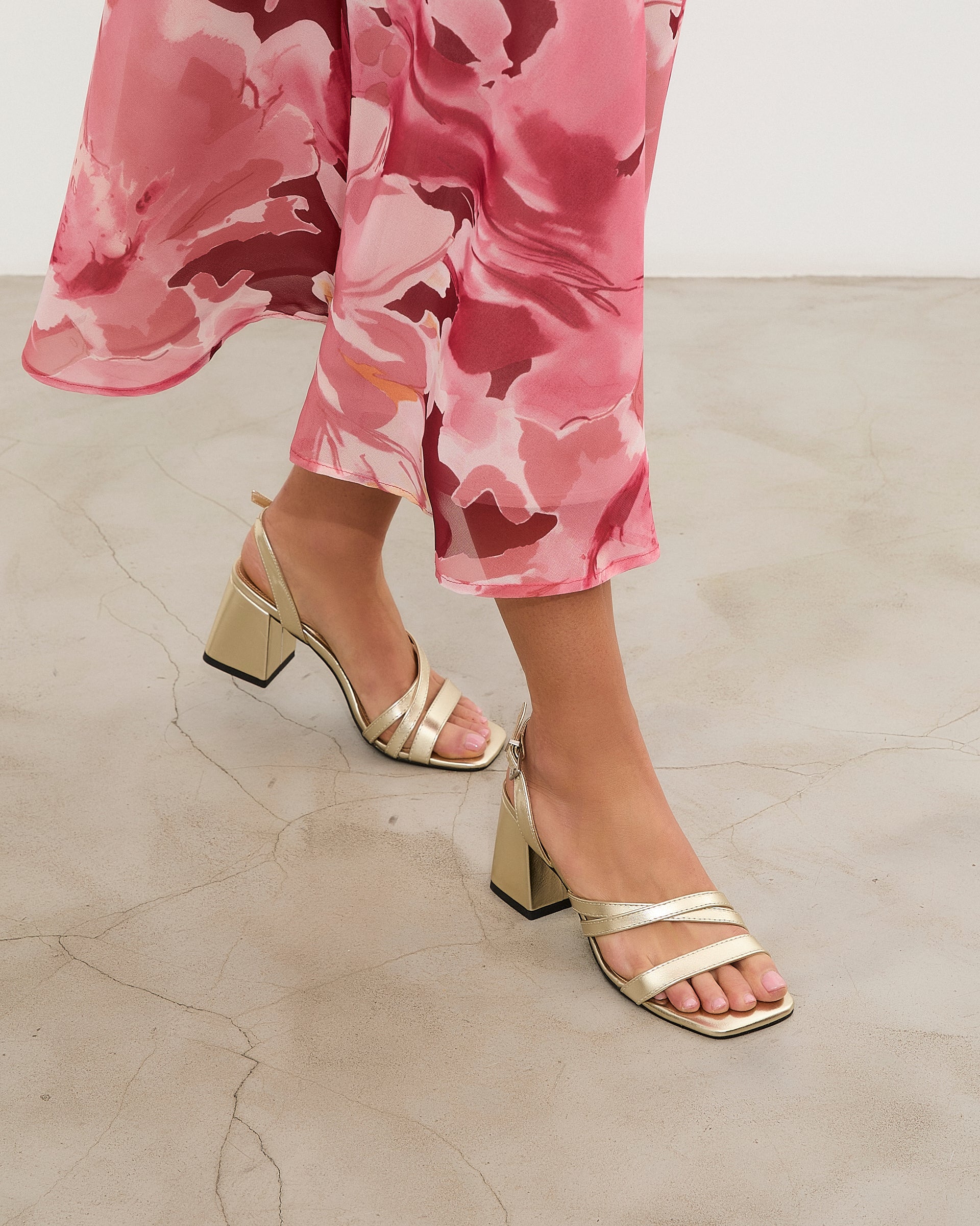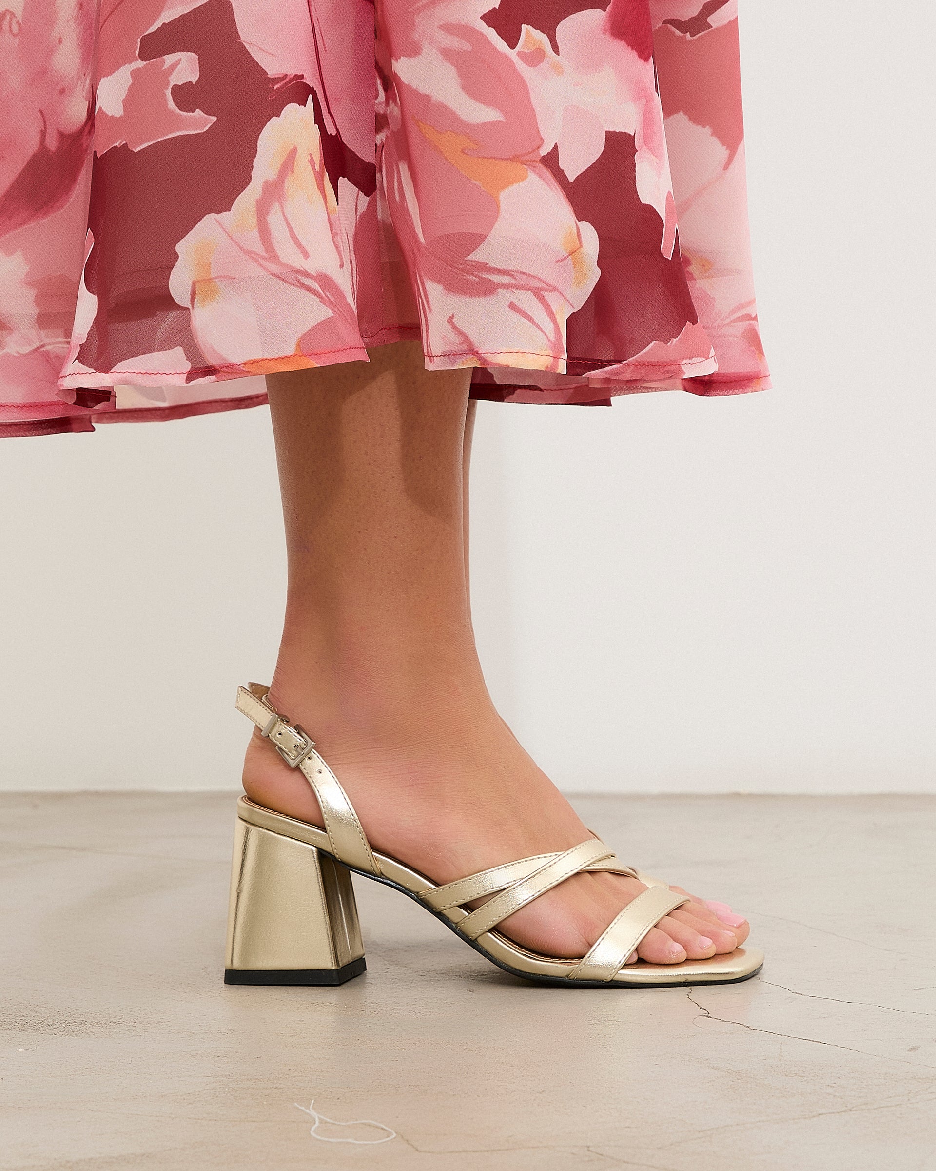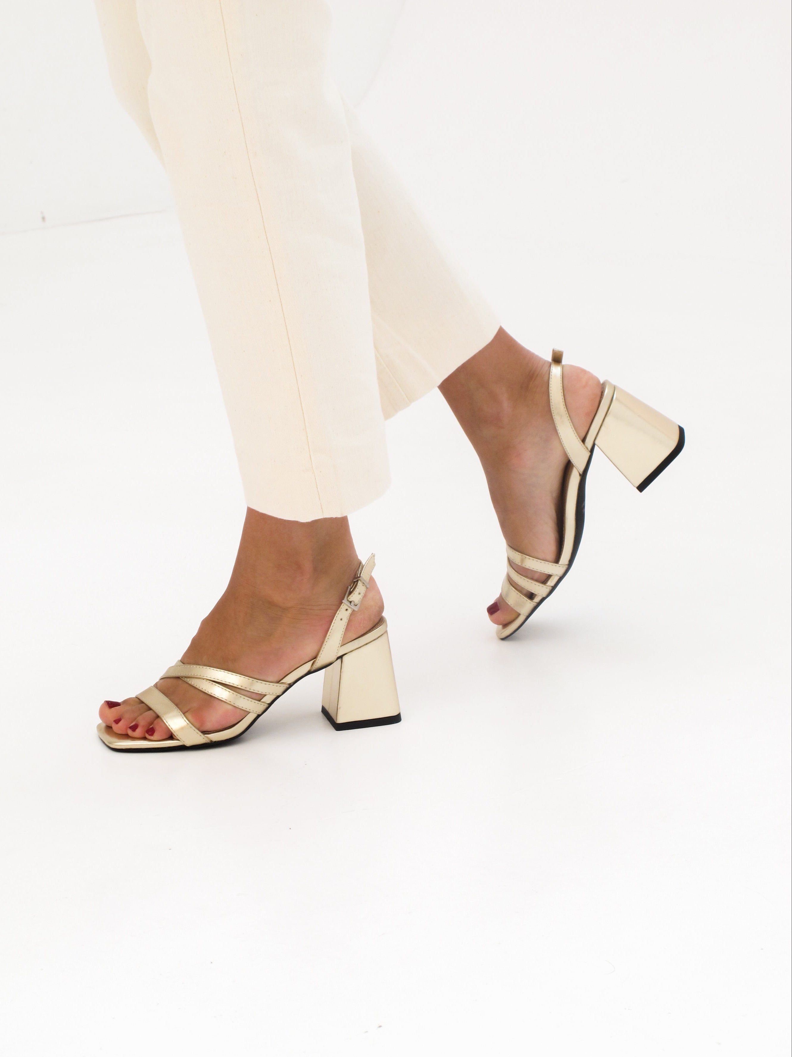 Sandalia de tacón en color dorado brillante. Parte delantera abierta con varias tiras. Tacón cuadrado. Cierre con tira al talón con hebilla metálica.