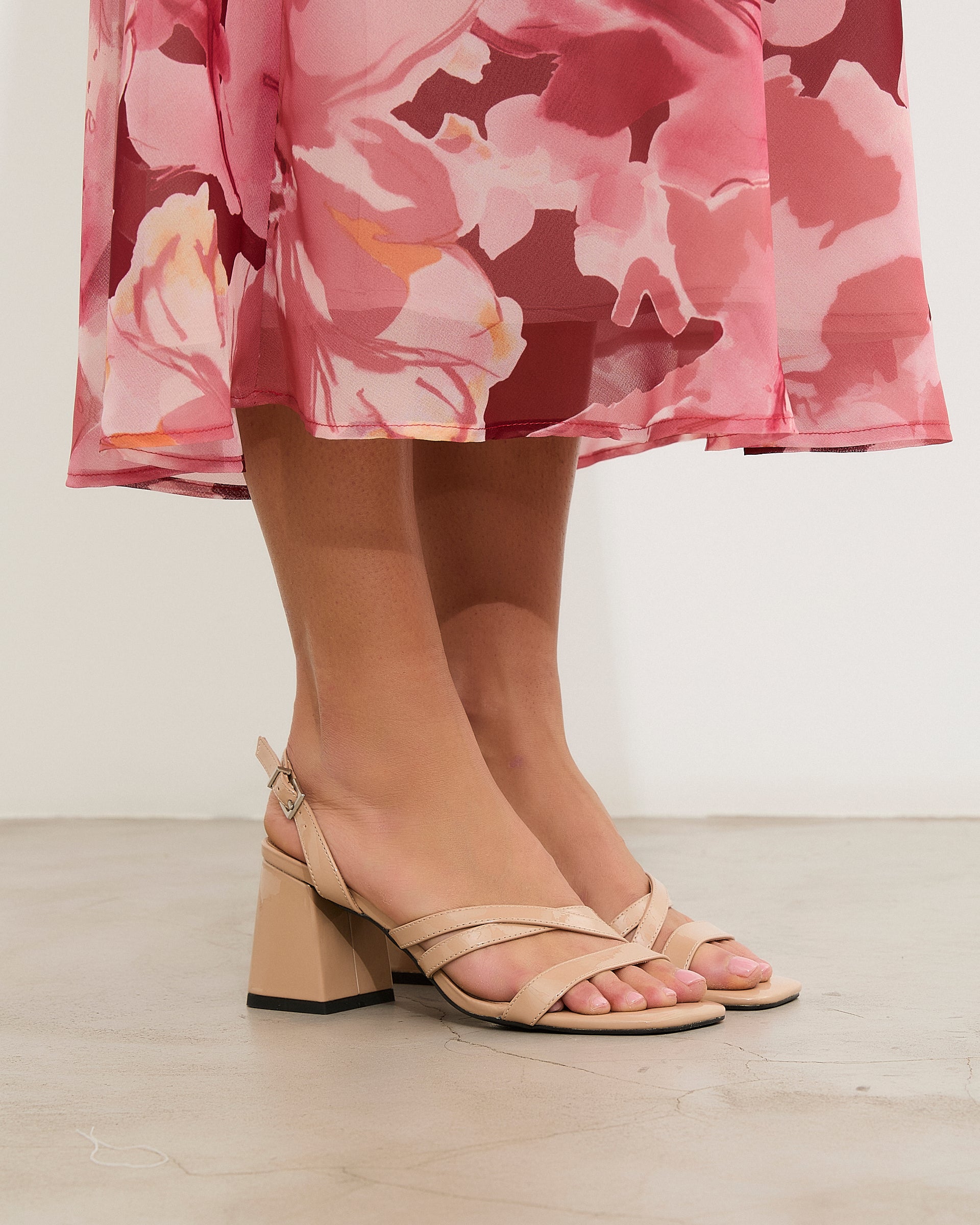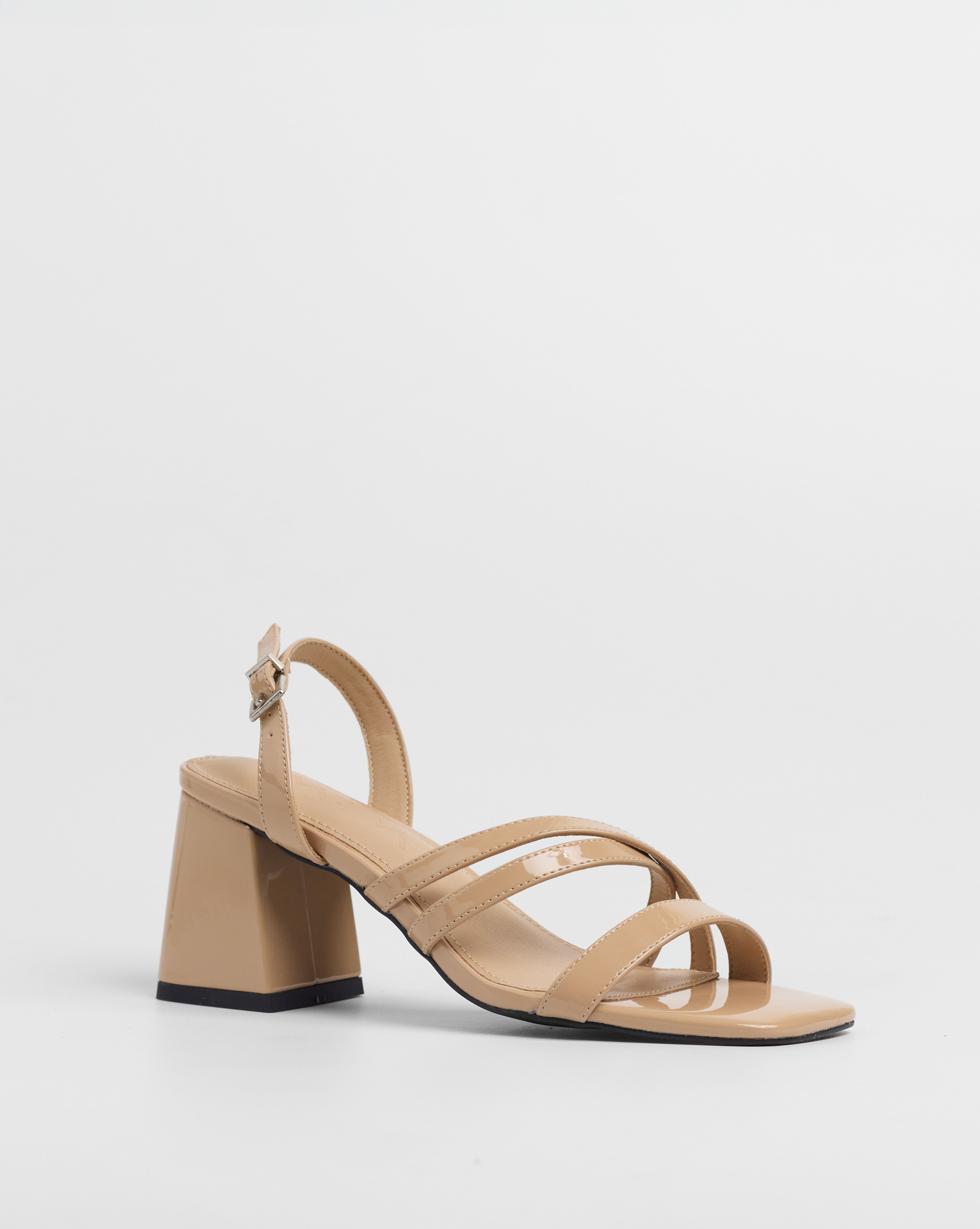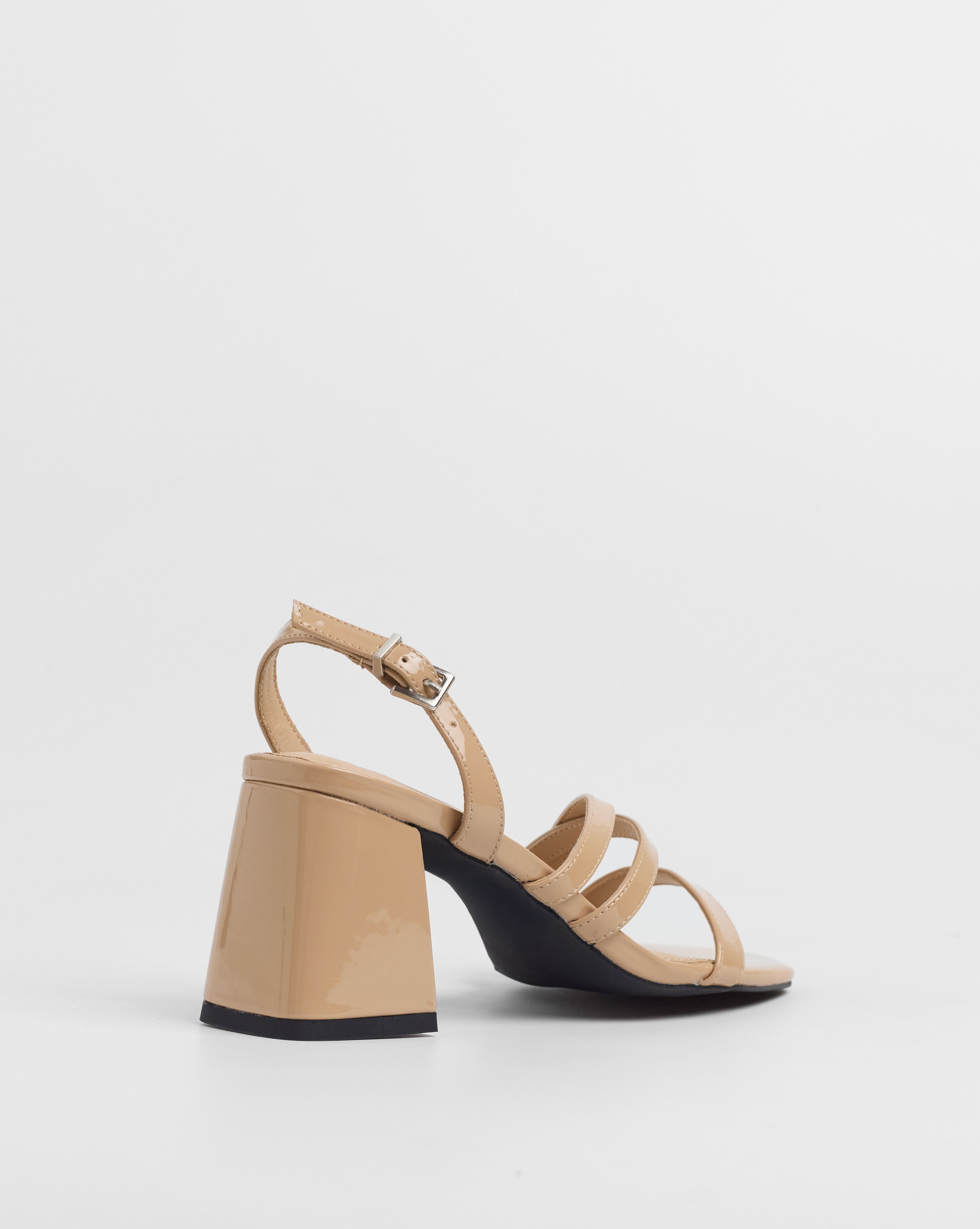 Sandalia de tacón en color nude con puntera cuadrada. Parte delantera abierta con varias tiras. Tacón cuadrado. Cierre con tira al talón con hebilla metálica.
