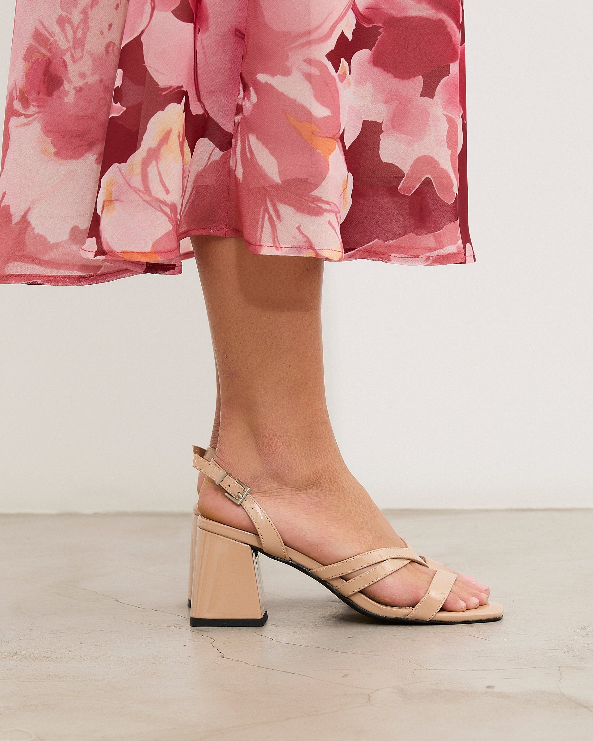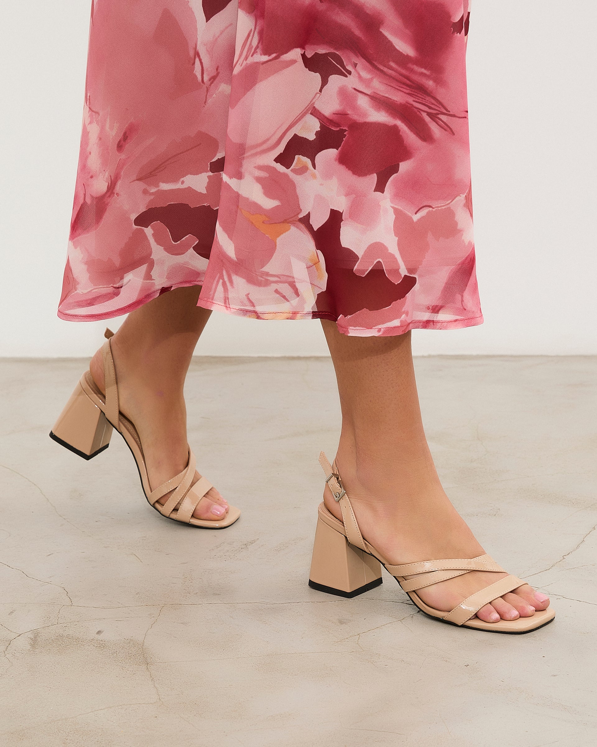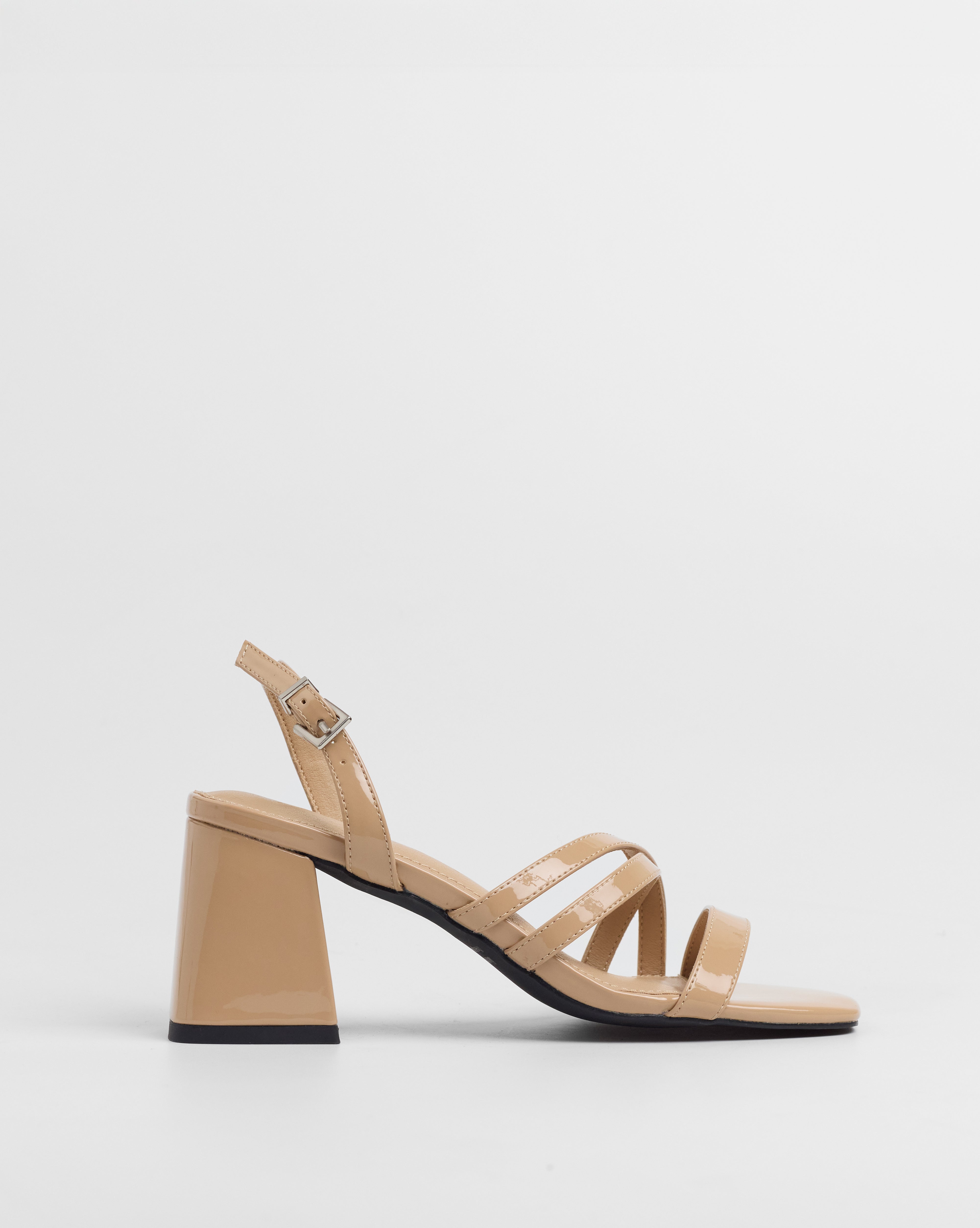 Sandalia de tacón en color nude con puntera cuadrada. Parte delantera abierta con varias tiras. Tacón cuadrado. Cierre con tira al talón con hebilla metálica.