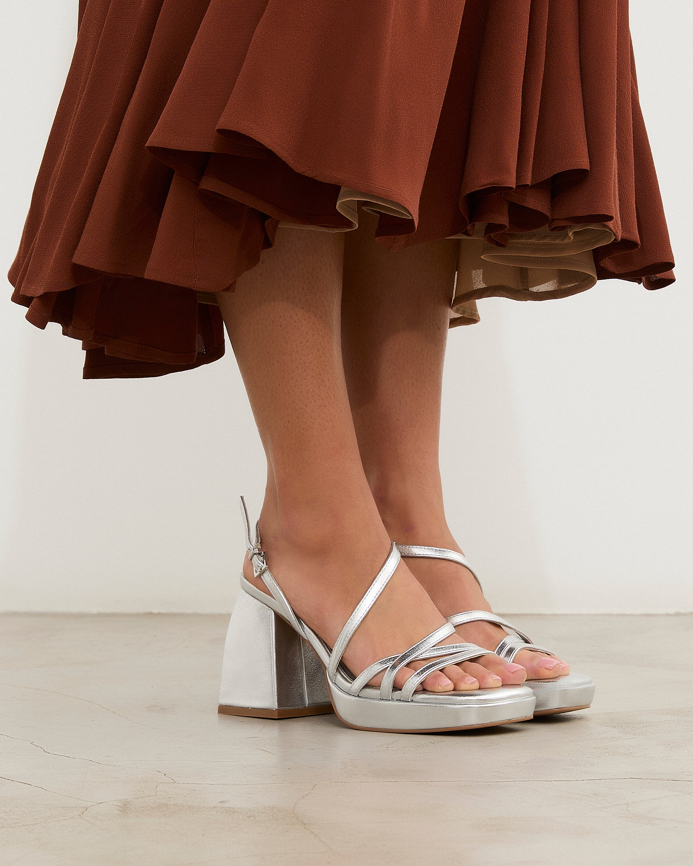 Sandalia de tacón en color plata. Parte delantera abierta con varias tiras tubulares. Tacón cuadrado. Cierre de pulsera al tobillo con hebilla metálica.
