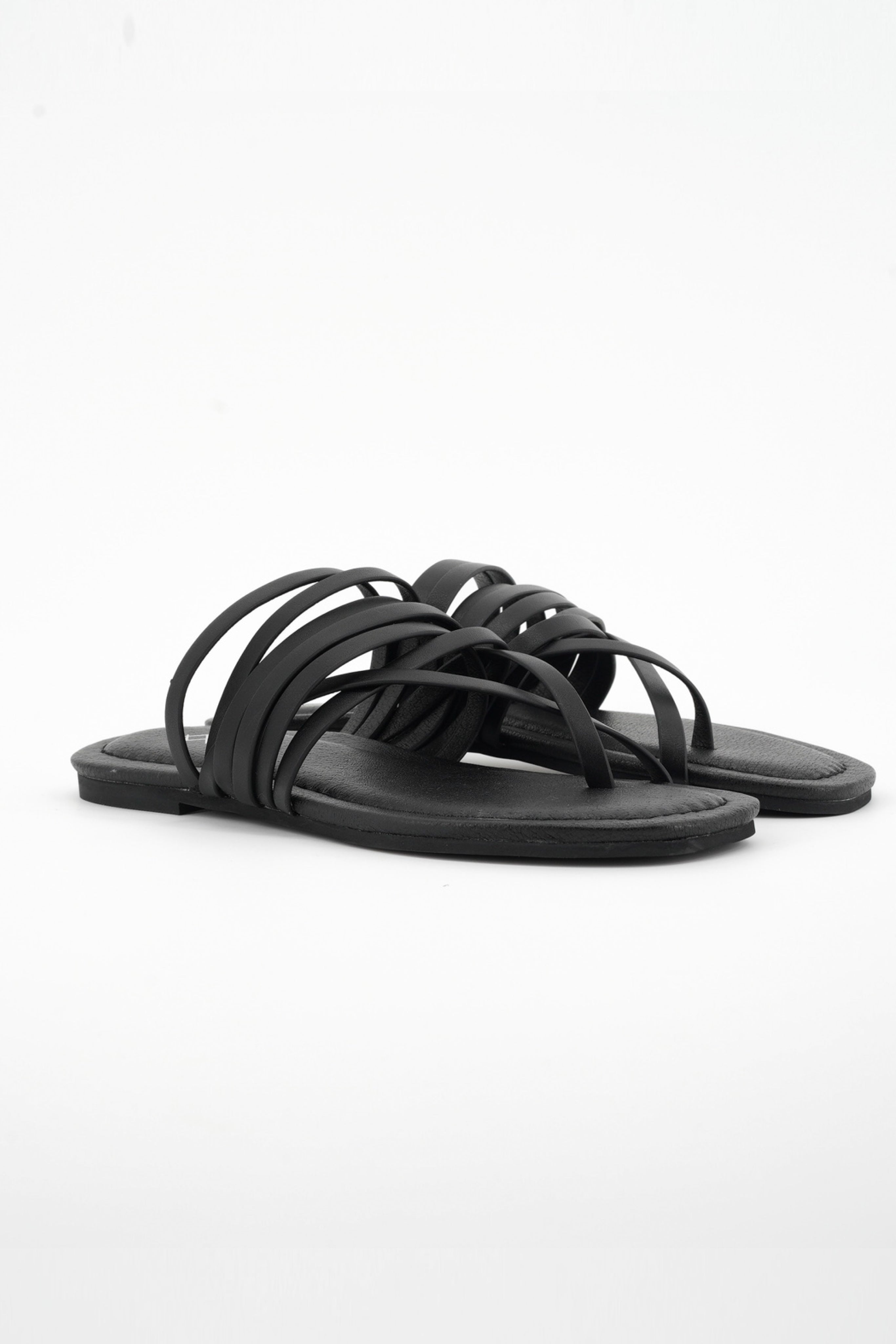Sandalia plana en cuero vegano tonos nude. Varias tiras finas y parte para el dedo pulgar.
