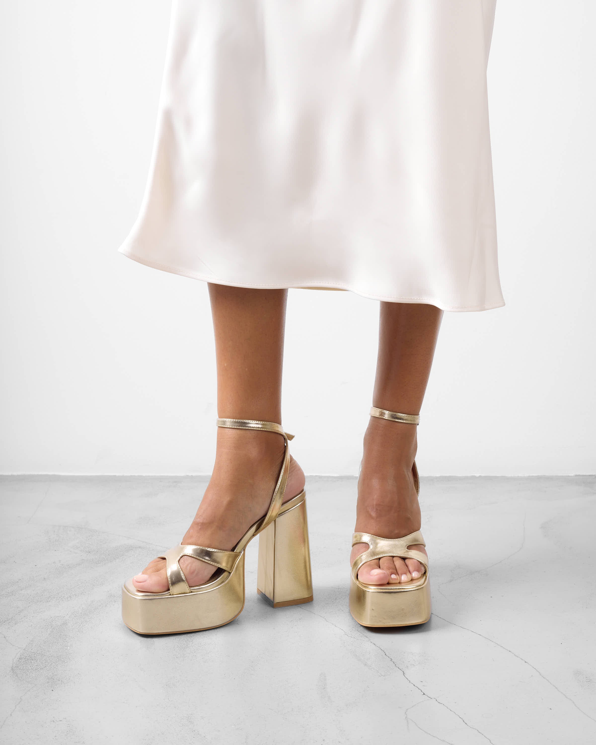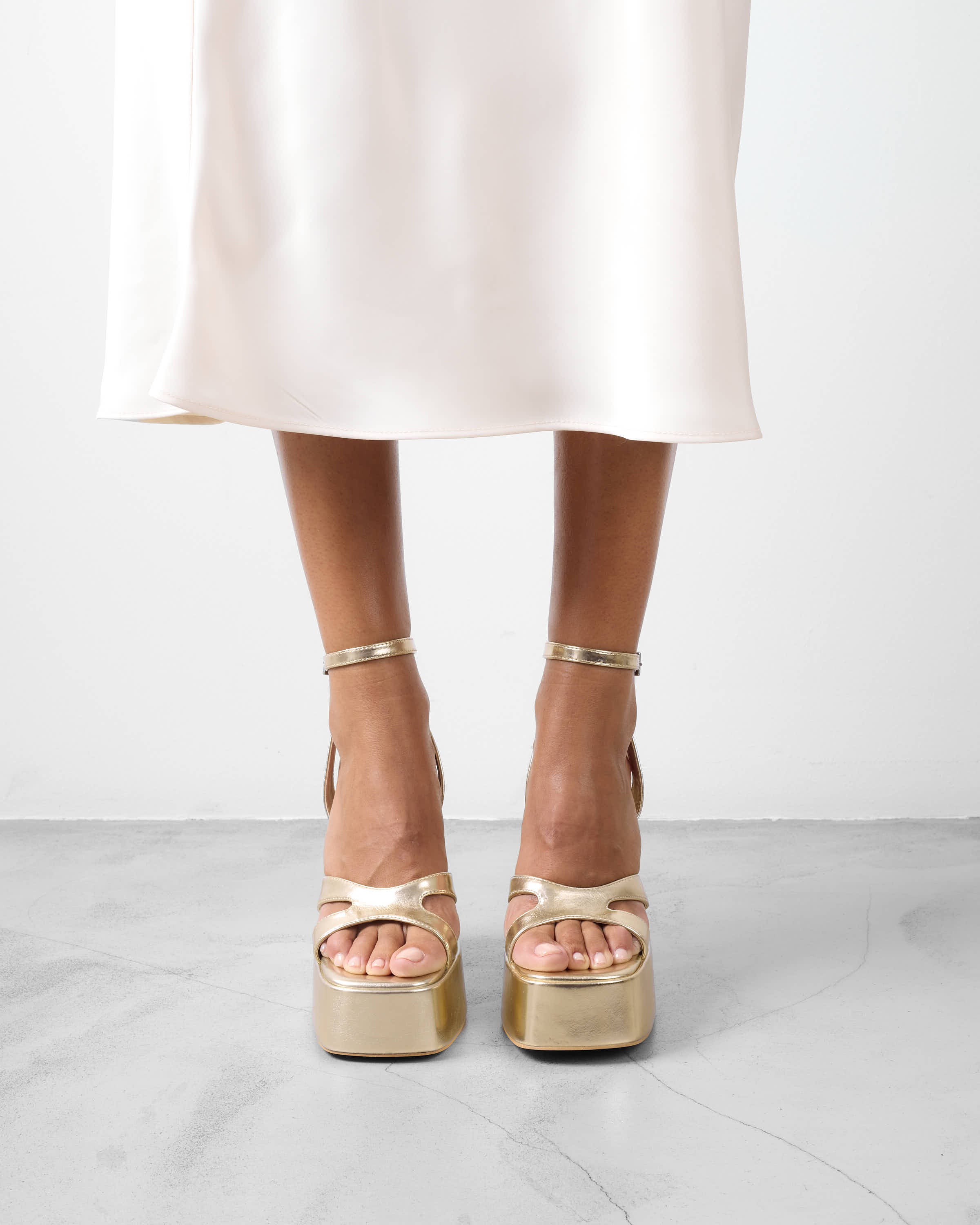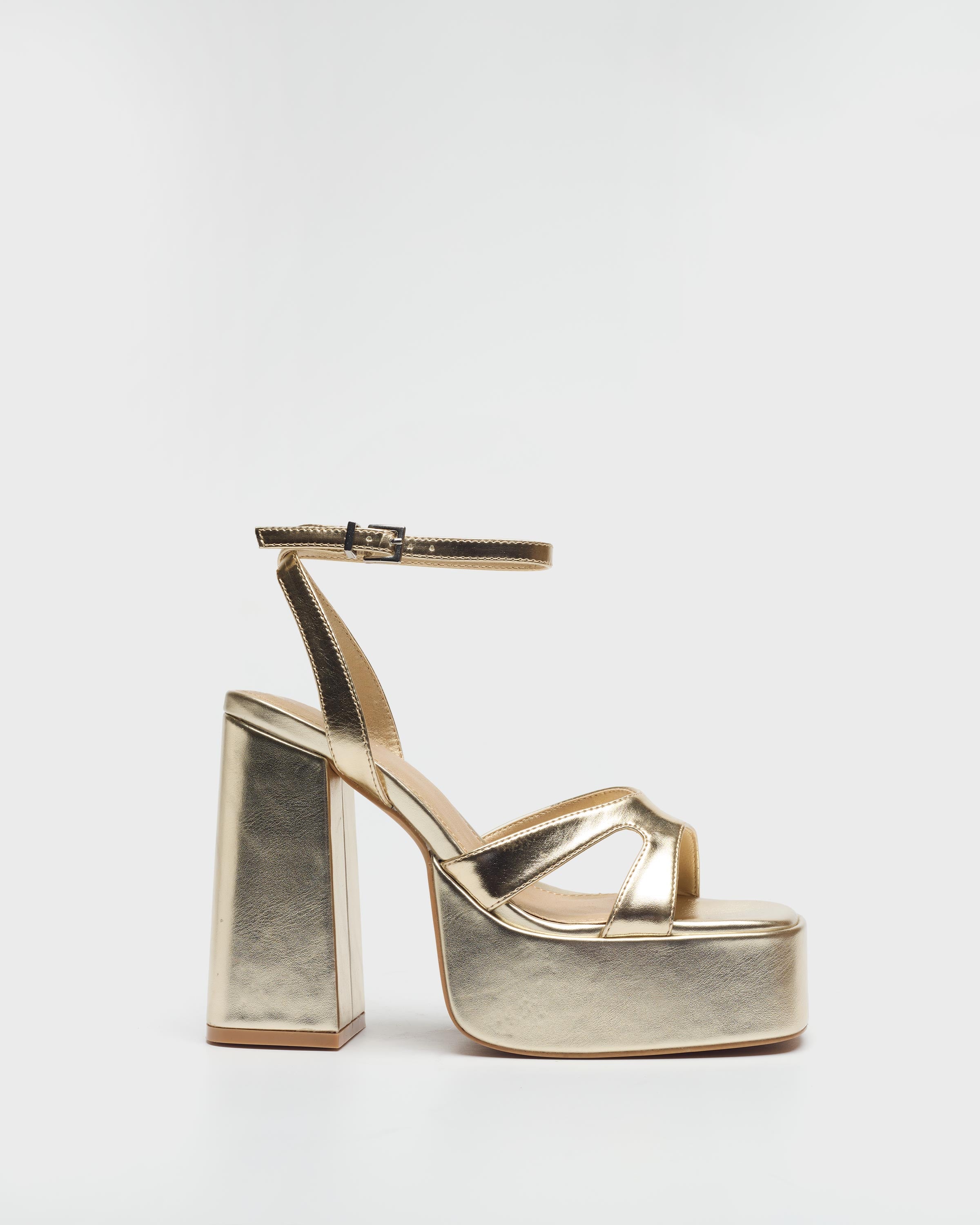 Sandalia de tacón con plataforma en color dorado. Parte delantera abierta con dos tiras cruzadas y cierre de pulsera al tobillo con hebilla. Tacón cuadrado.