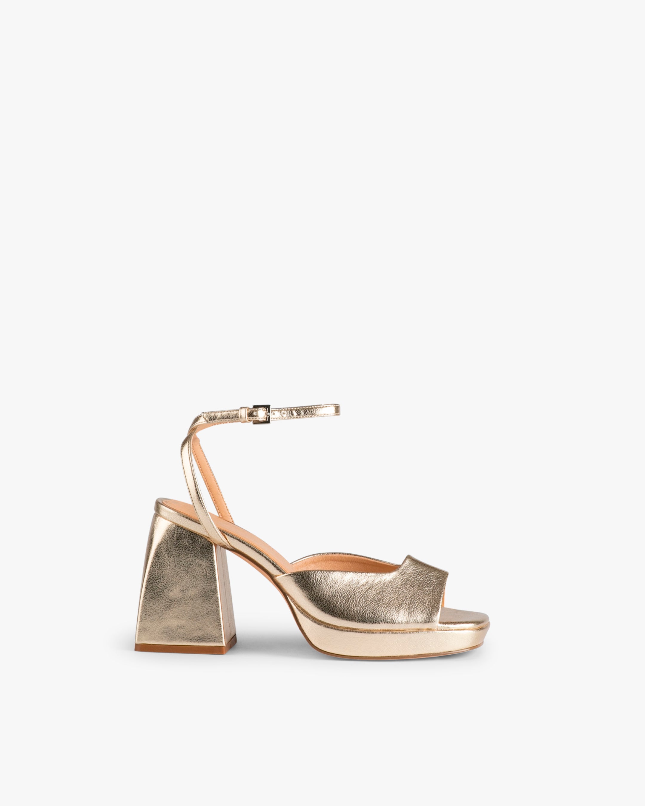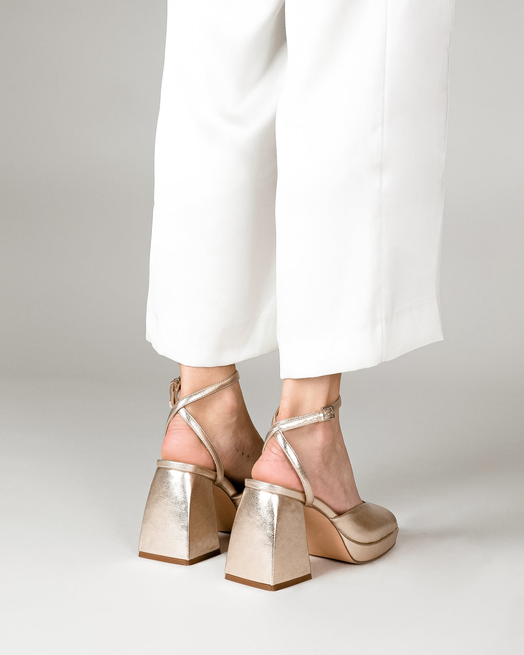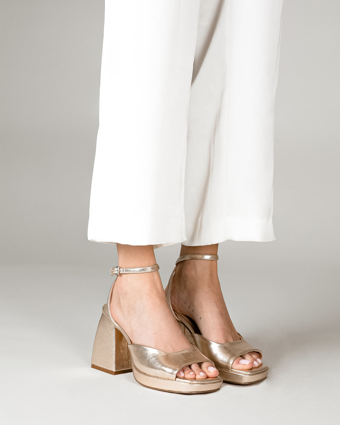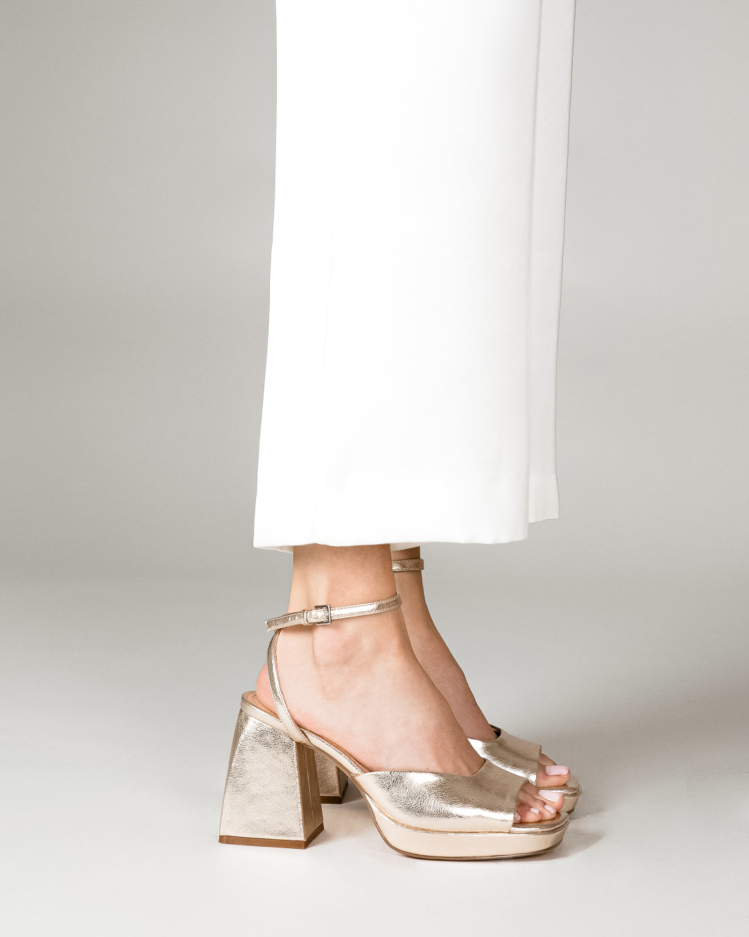 Sandalia de tacón en piel color dorado y plataforma en punta cuadrada. Parte delantera cerrada con abertura en los dedos y tacón cuadrado. Cierre de pulsera con hebilla metálica.