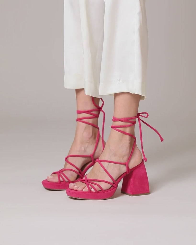 Sandalia de tacón en ante vegano color fucsia. Parte delantera abierta y plataforma con varias tiras en cruz y tacón cuadrado. Cierre de pulsera con tiras al tobillo.