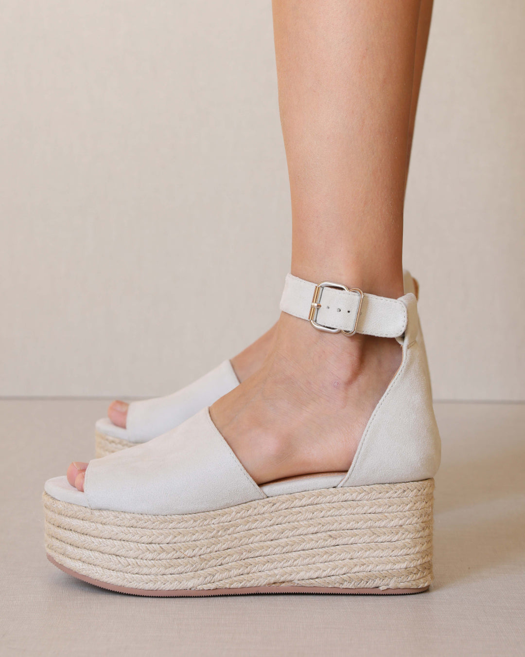 Sandalia con plataforma de esparto, en ante vegano ecru. Tira ancha frontal y tobillera en el tobillo para el cierre.