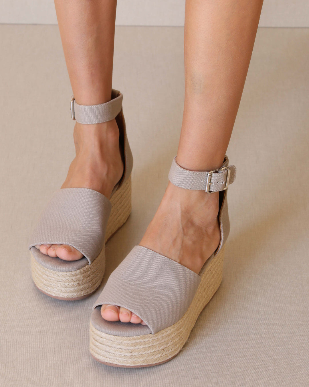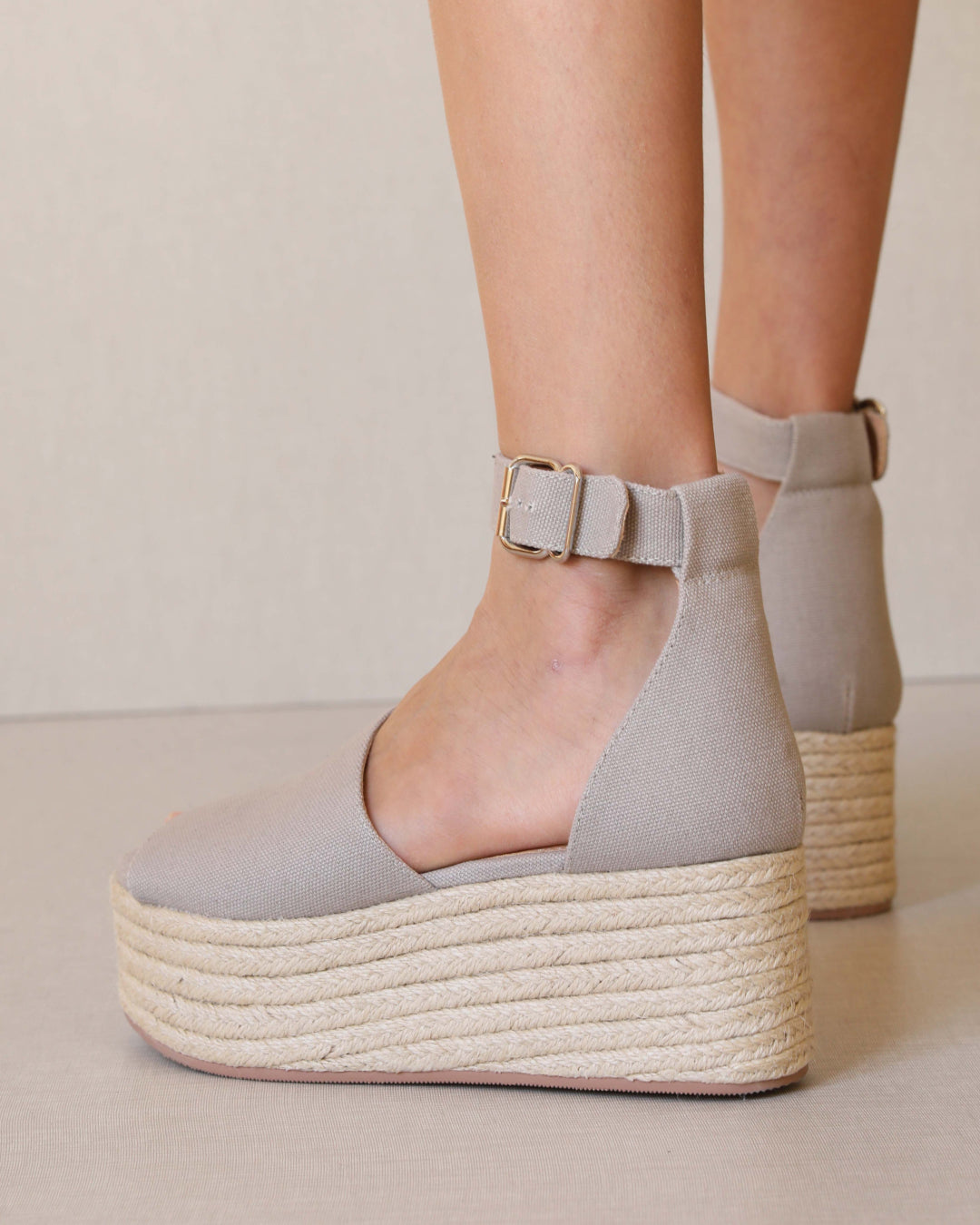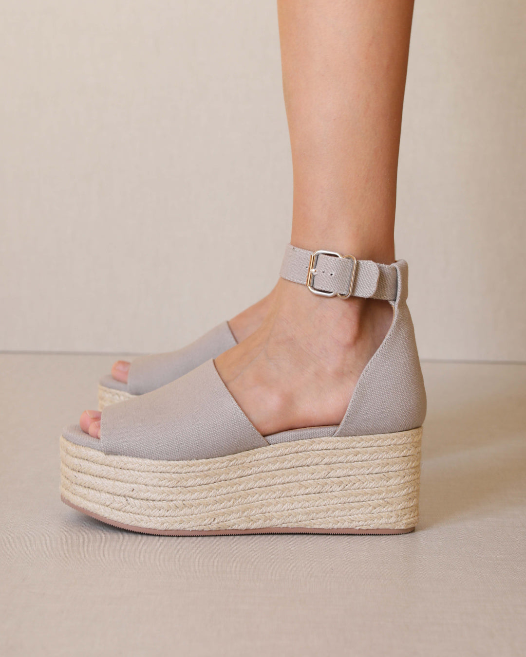 Sandalia de plataforma de esparto. Tira ancha frontal en color topo y tobillera en el tobillo para el cierre.