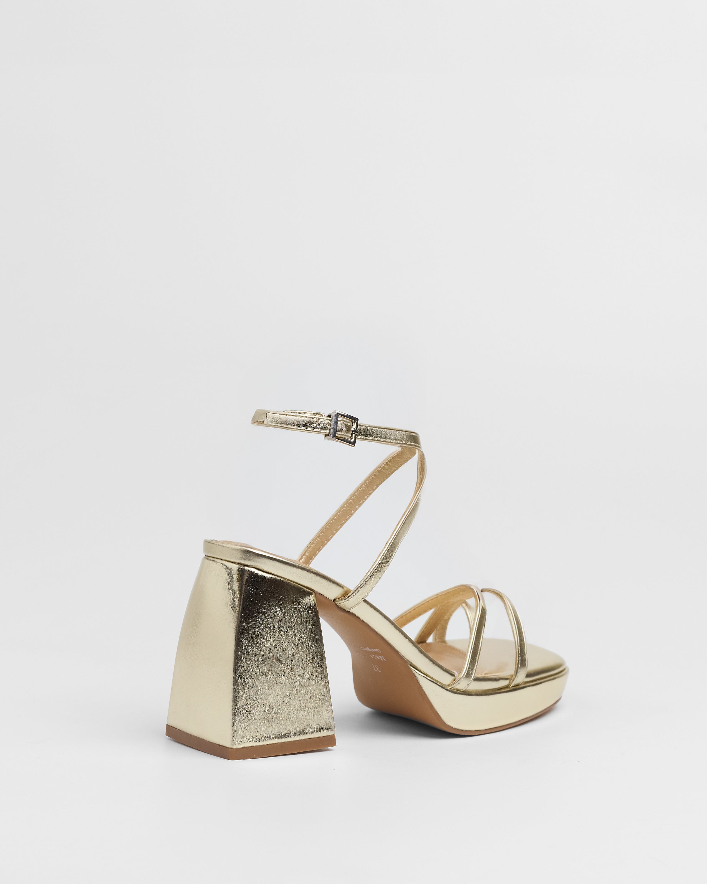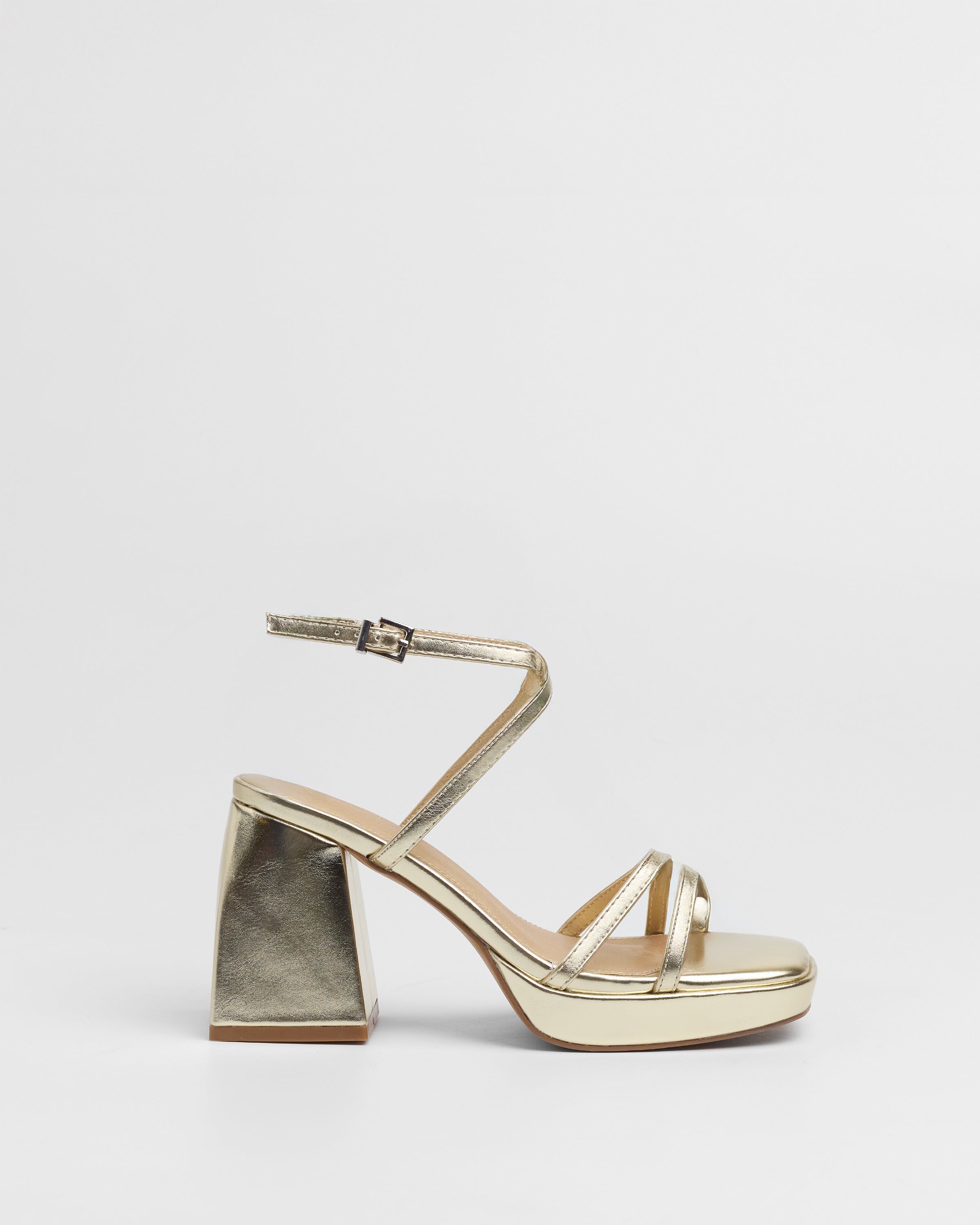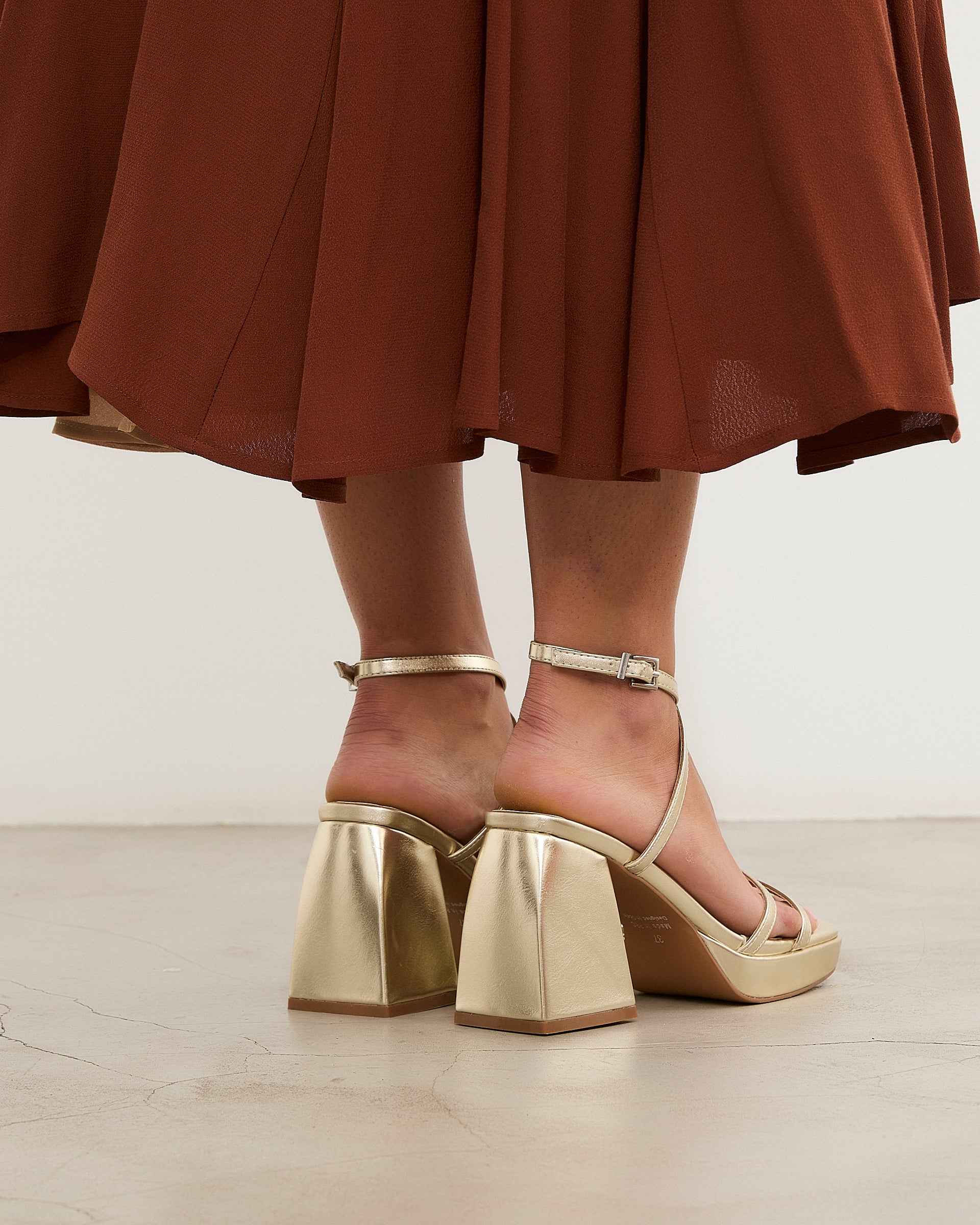 Sandalia de tacón en color dorado con dos tiras cruzadas en la parte delantera y una tiras en el dedo. Tiras traseras en el tobillo con cierre de hebillas.
