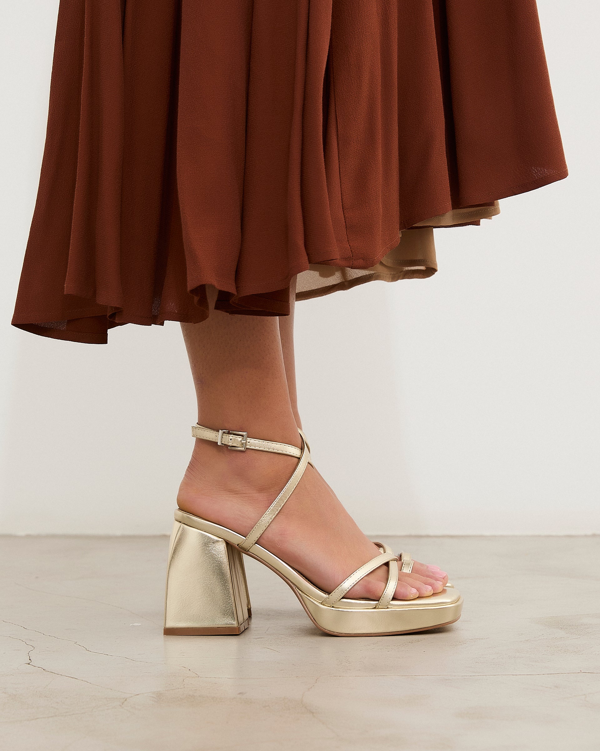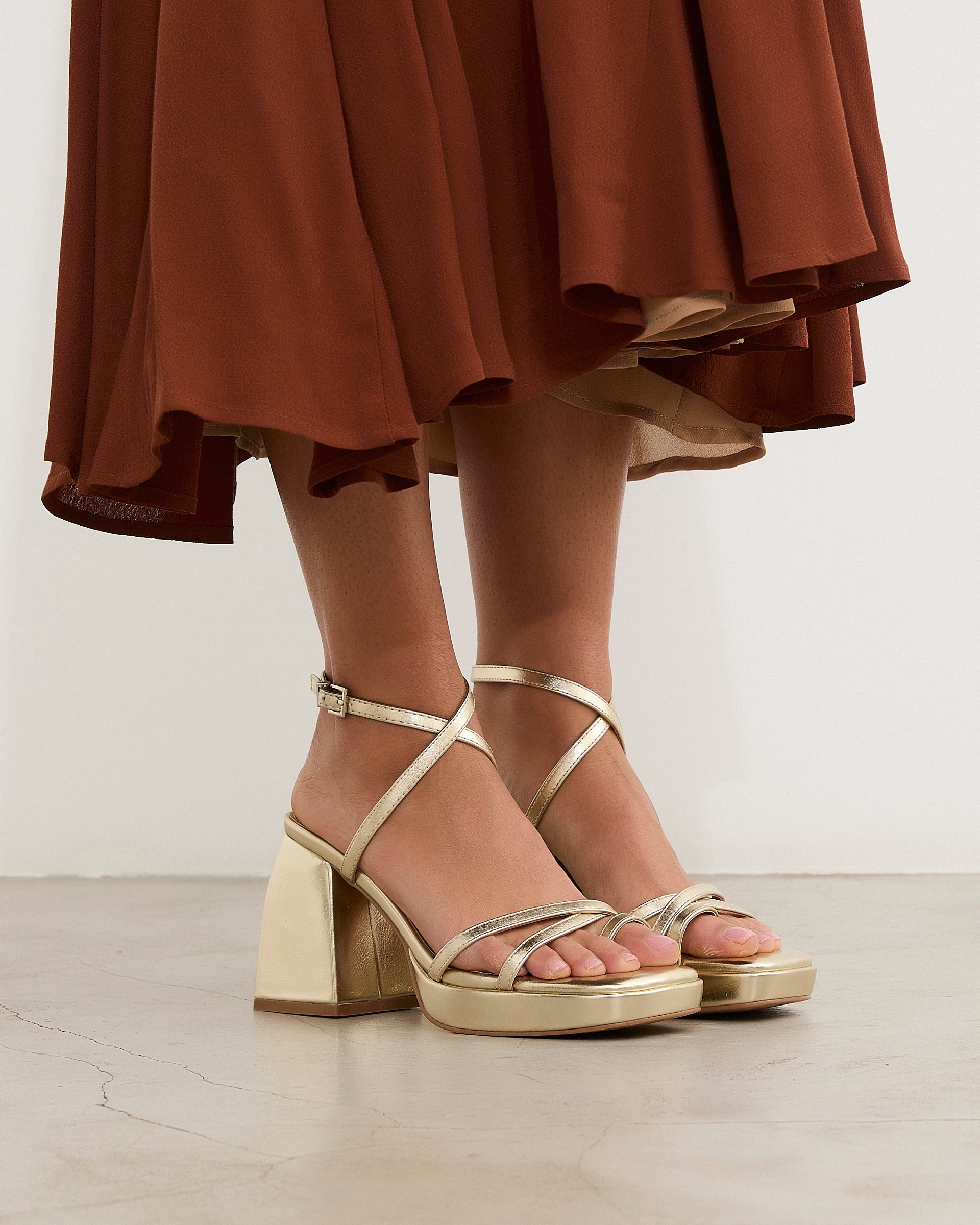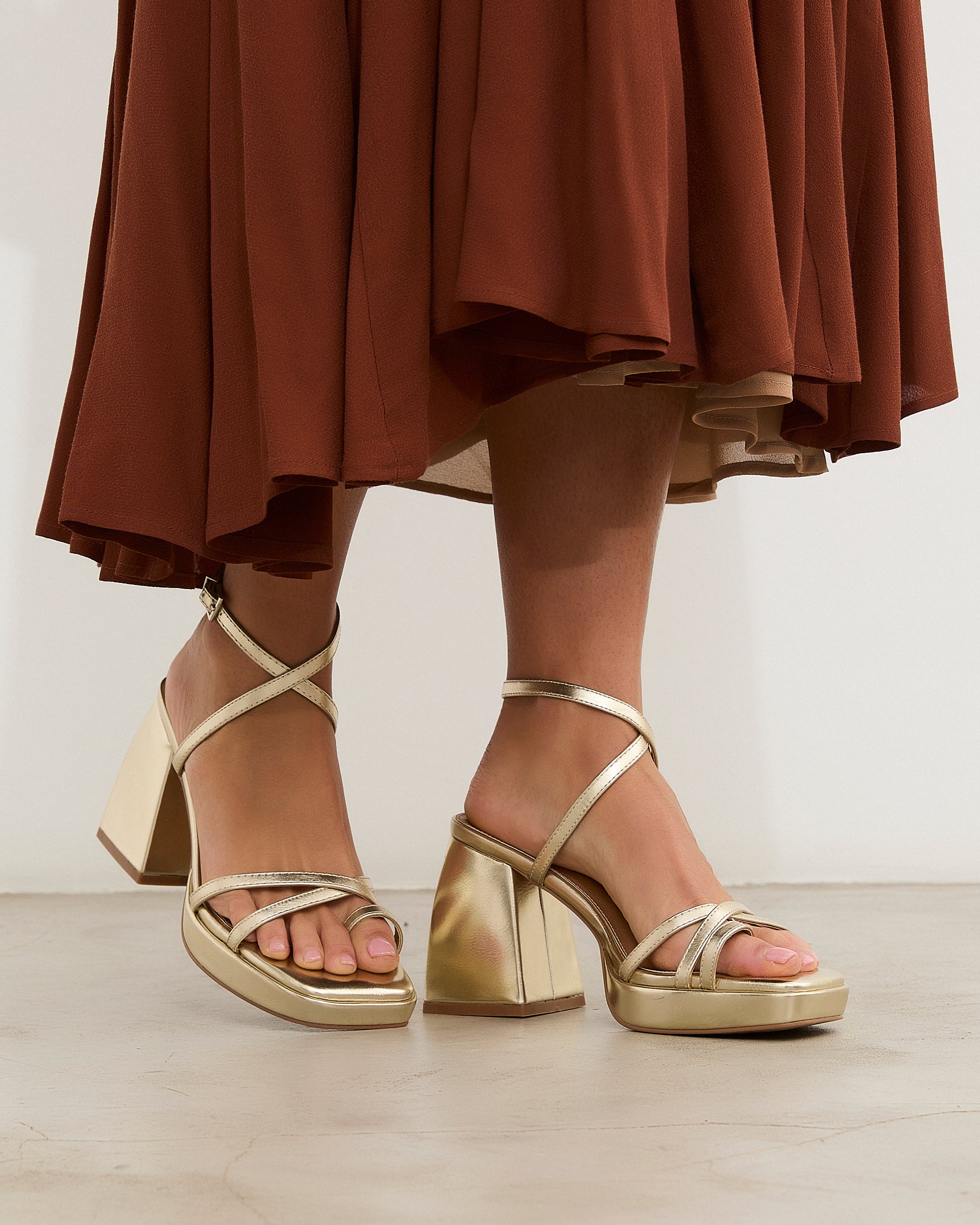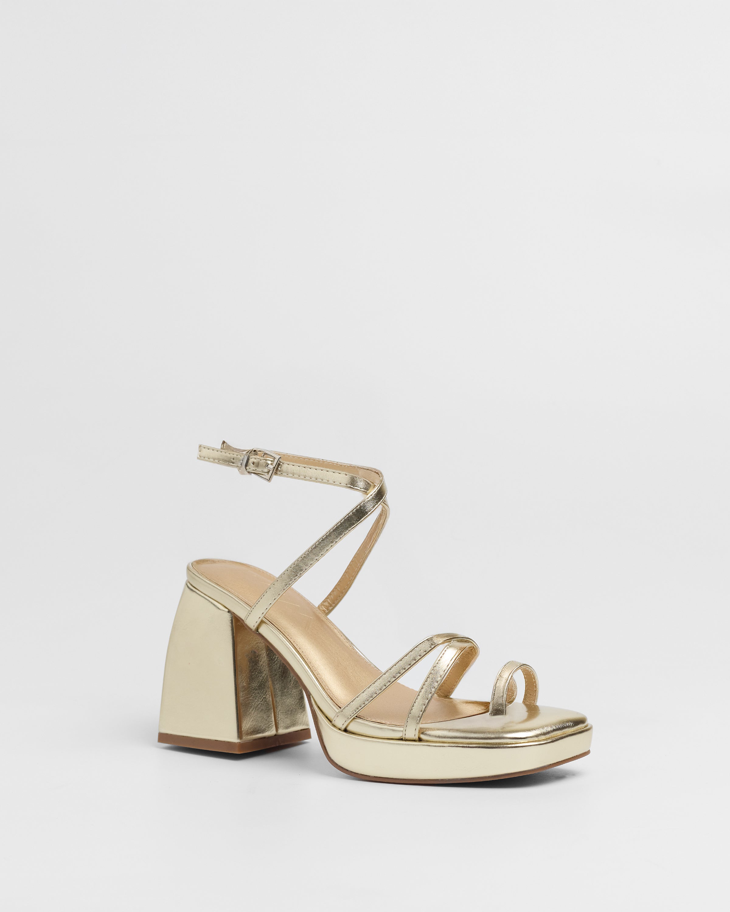 Sandalia de tacón en color dorado con dos tiras cruzadas en la parte delantera y una tiras en el dedo. Tiras traseras en el tobillo con cierre de hebillas.