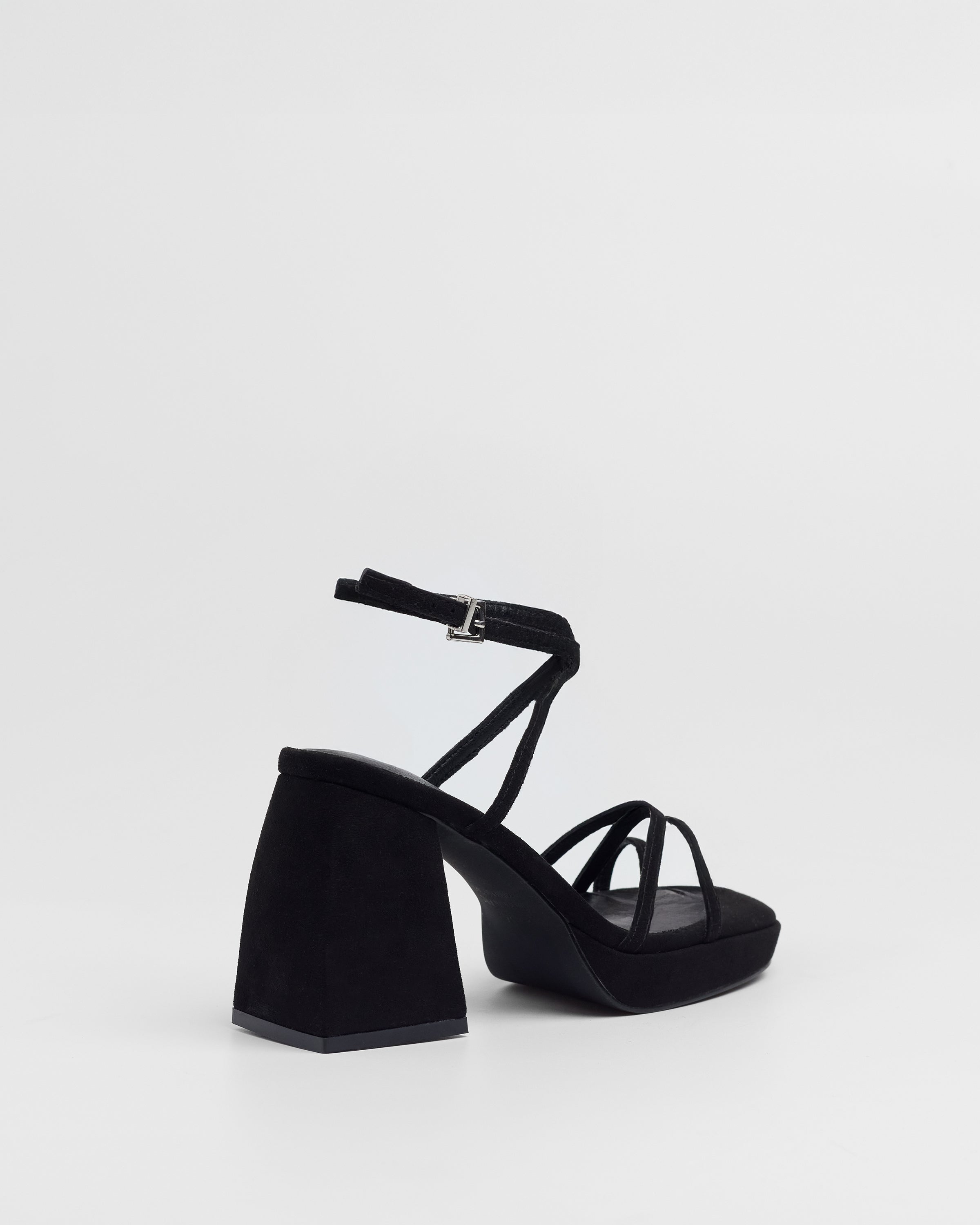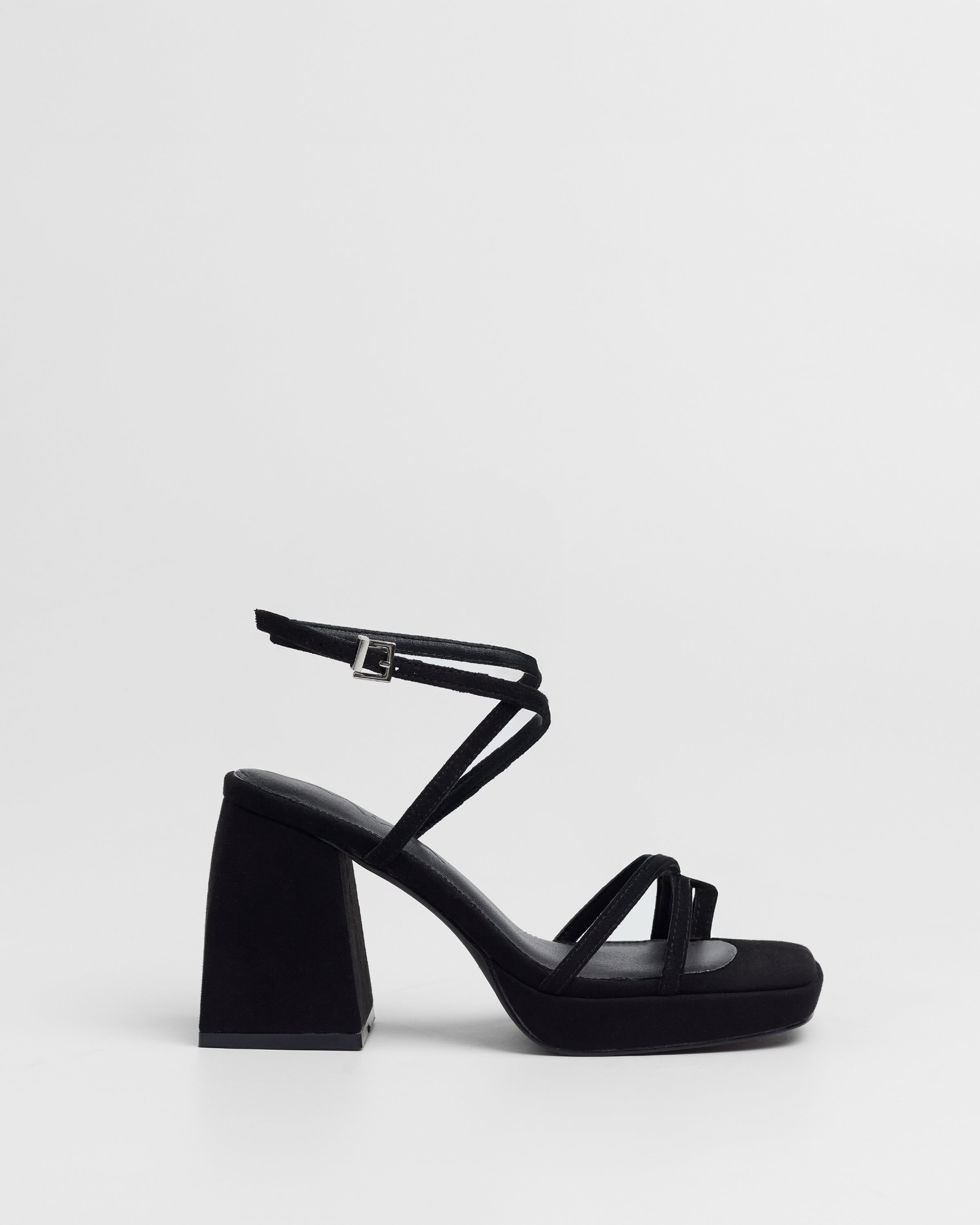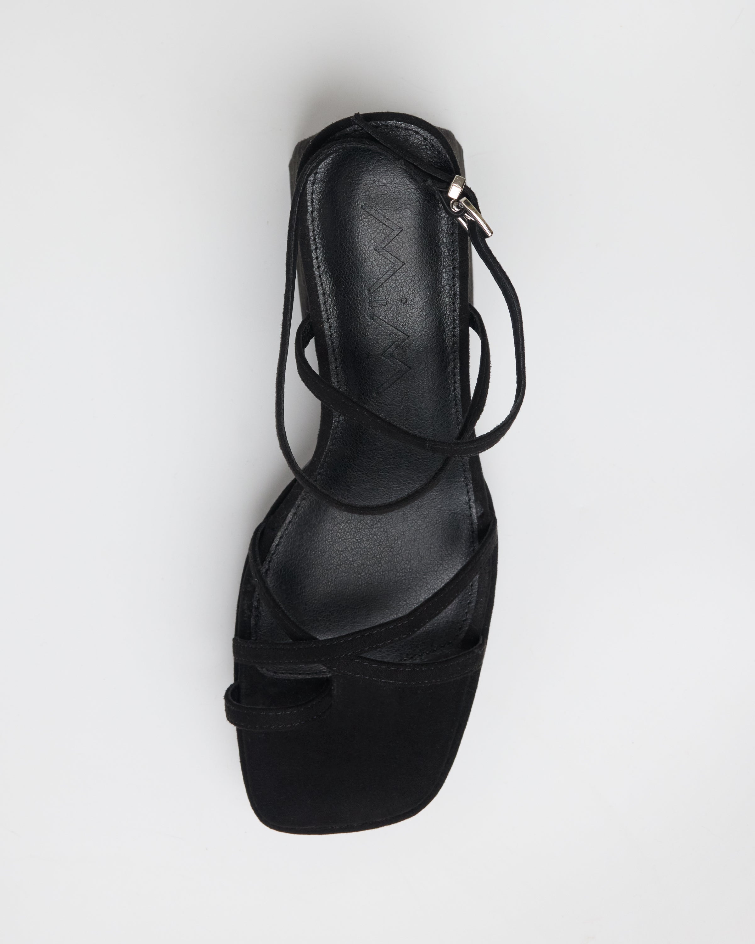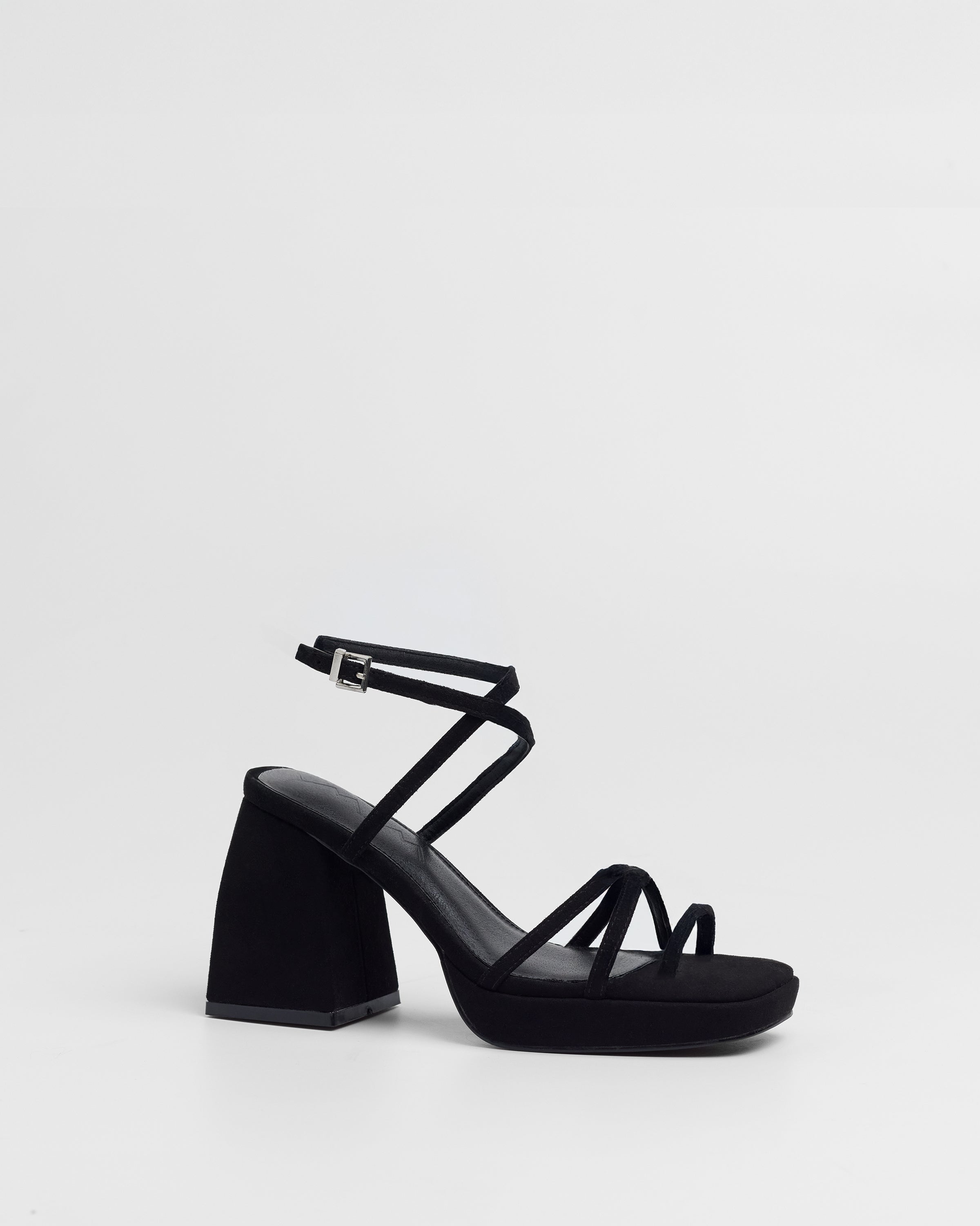 Sandalia de tacón en terciopelo color negro con dos tiras cruzadas en la parte delantera y una tiras en el dedo. Tiras traseras en el tobillo con cierre de hebillas.