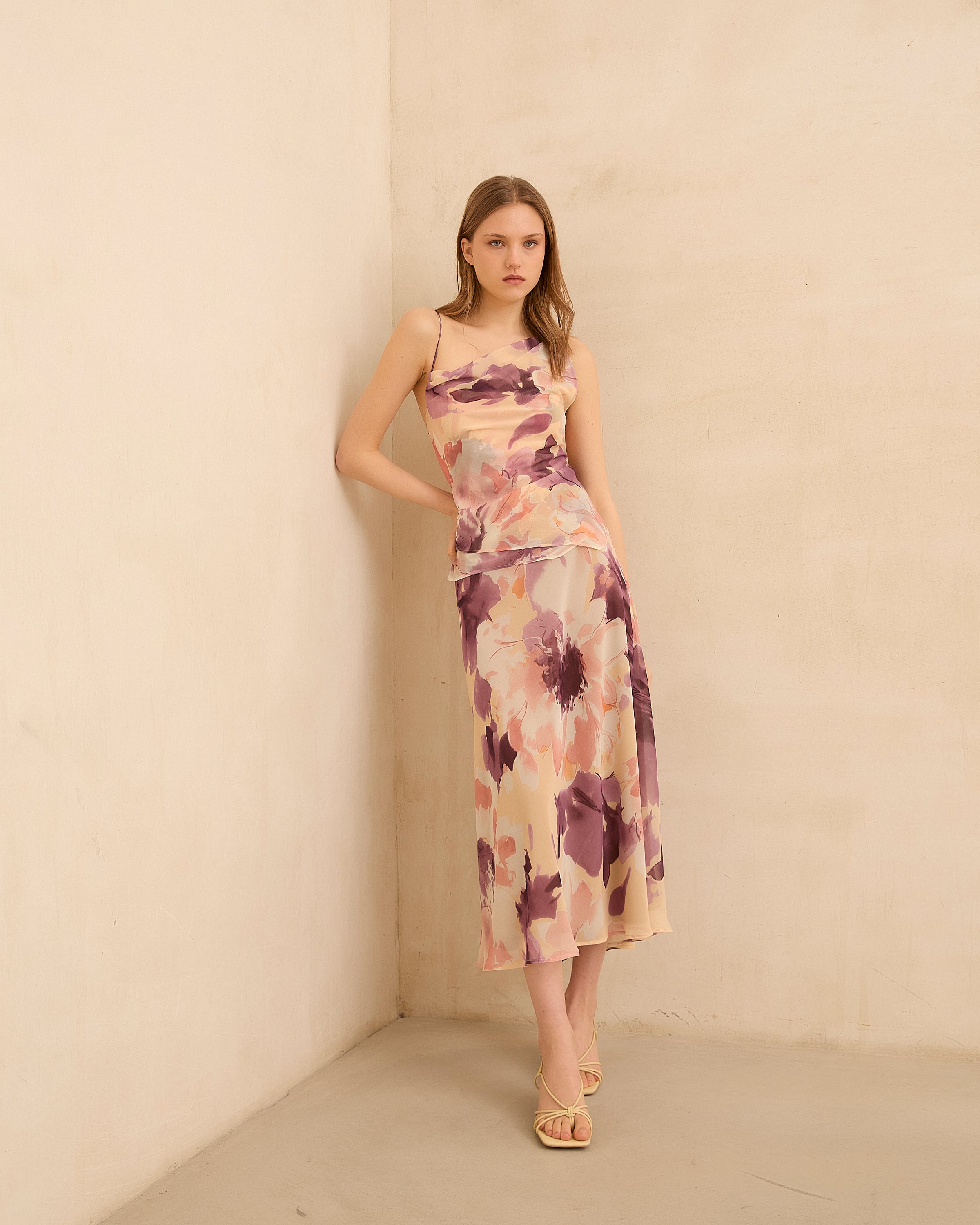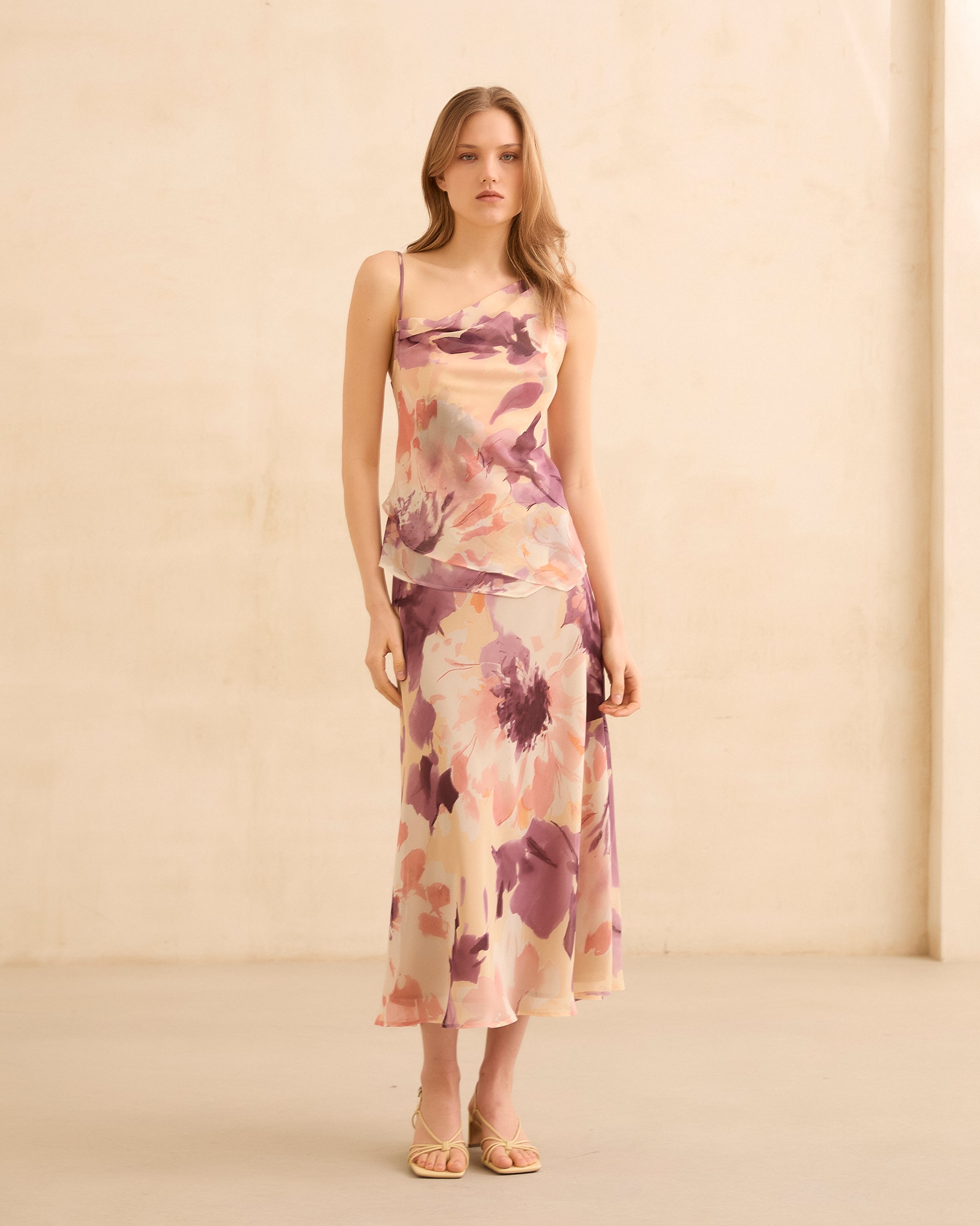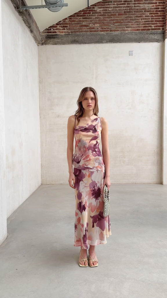 Falda midi fluida con bajo acabado en volumen. Tiro medio con cintura elástica . Print de motivos florales en tonos amarillos y lilas. Forro interior combinado a contraste.
